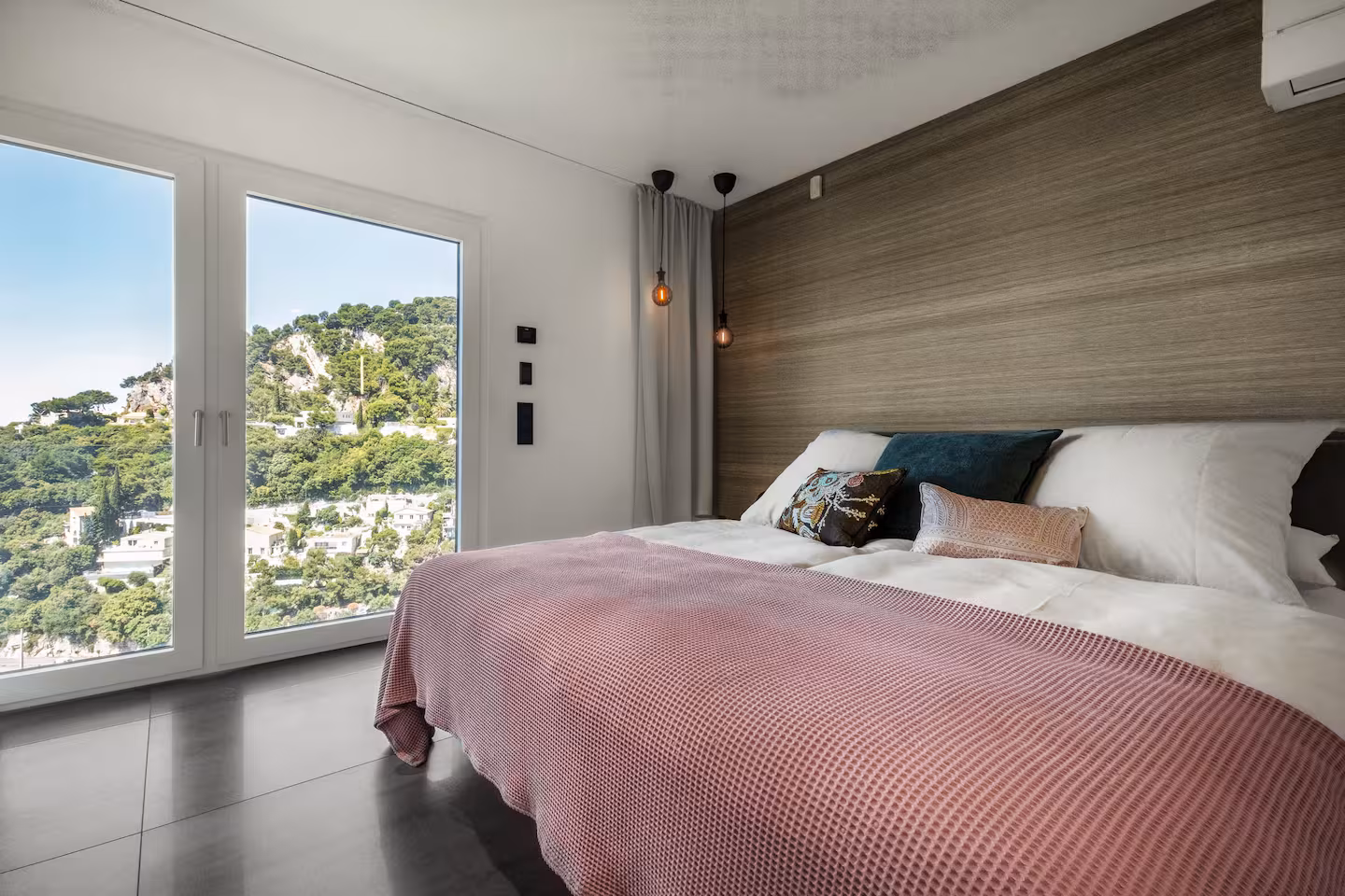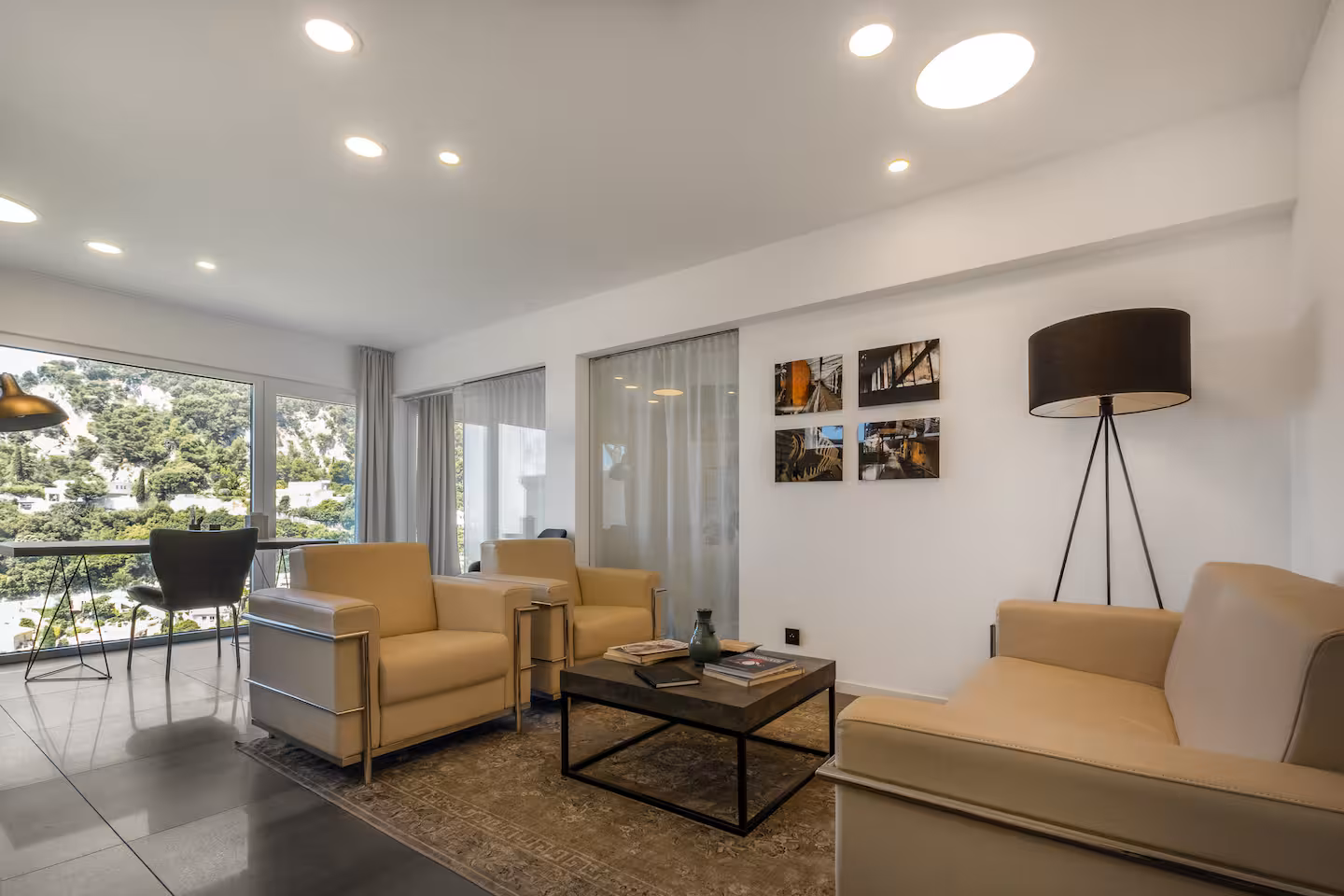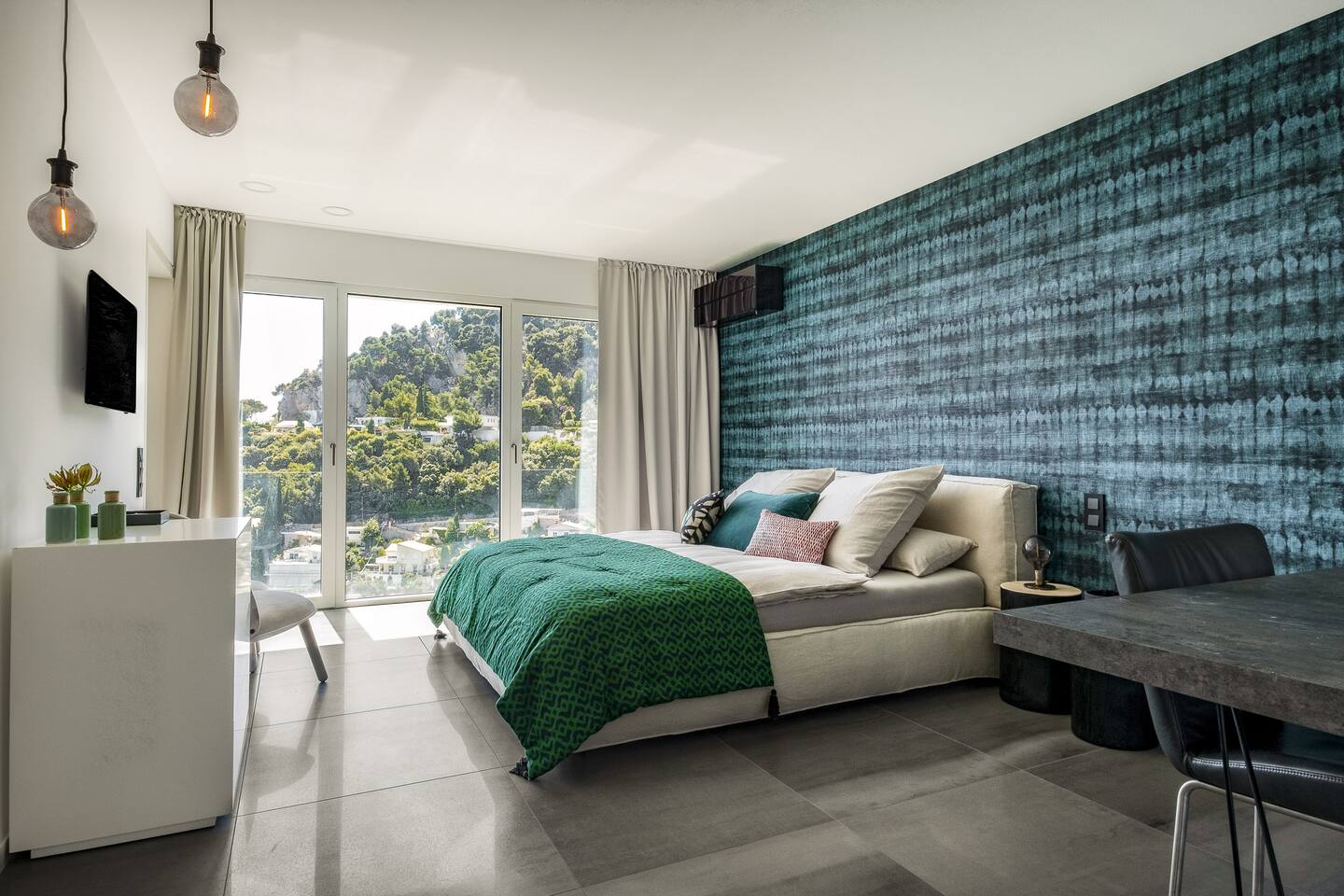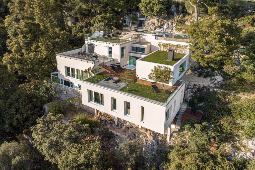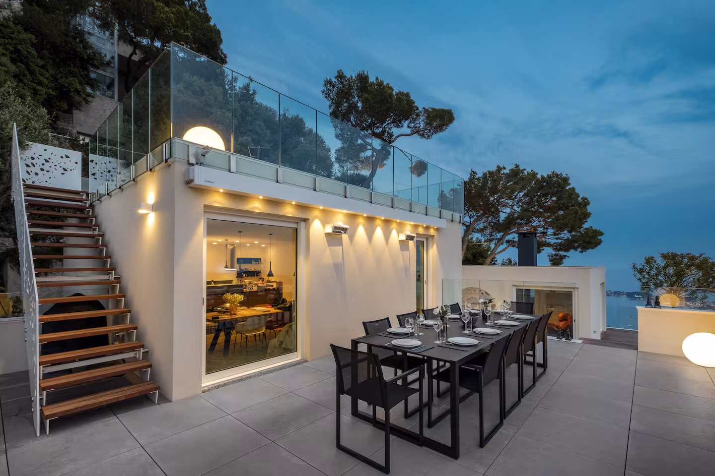 La Terra Vila est magnifiquement située sur une paroi rocheuse, orientée au sud-ouest et offrant une vue imprenable sur la mer depuis presque toutes les pièces. L’accès à la villa commence par une allée privée qui mène à un ascenseur en verre. Le premier arrêt vous conduit à une spacieuse piscine à débordement, d’où l’on jouit d’une vue à couper le souffle sur la baie. Le deuxième arrêt permet d’accéder à la villa par un sentier taillé dans les parois rocheuses. Une fois que vous tournez à gauche et entrez dans la villa, c’est un moment que les mots ne peuvent pas entièrement capturer.