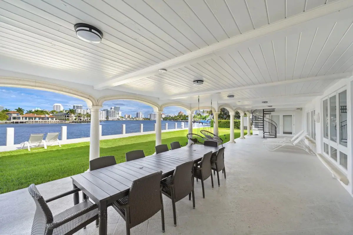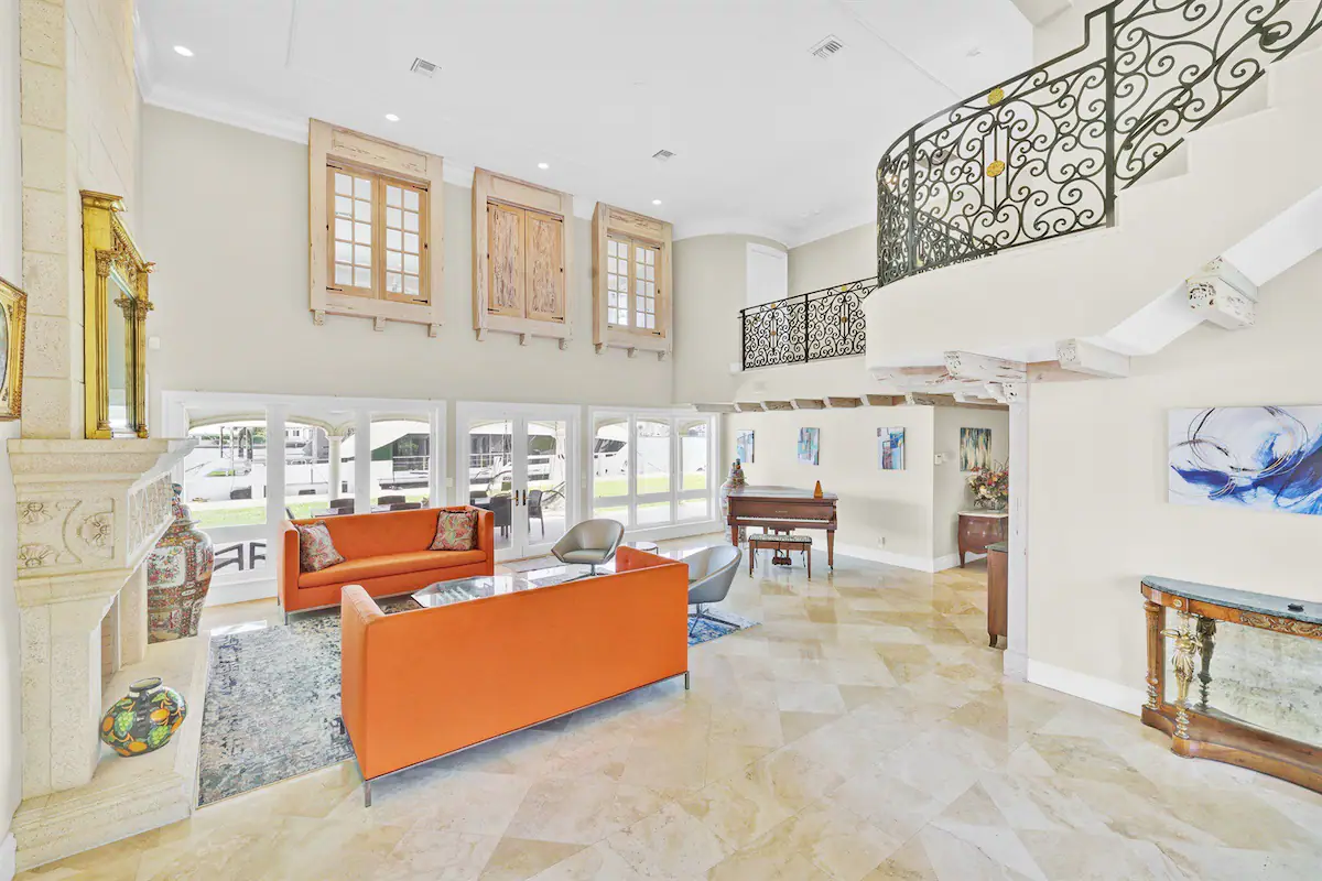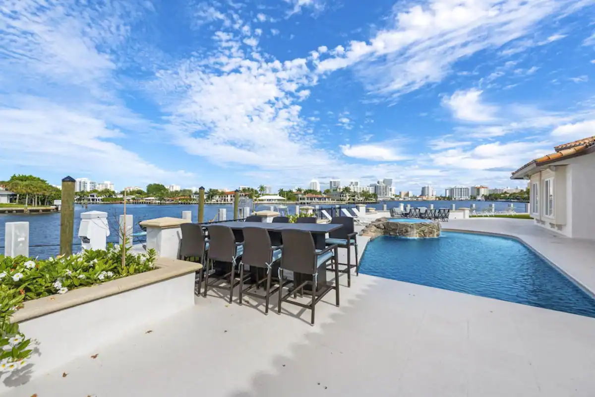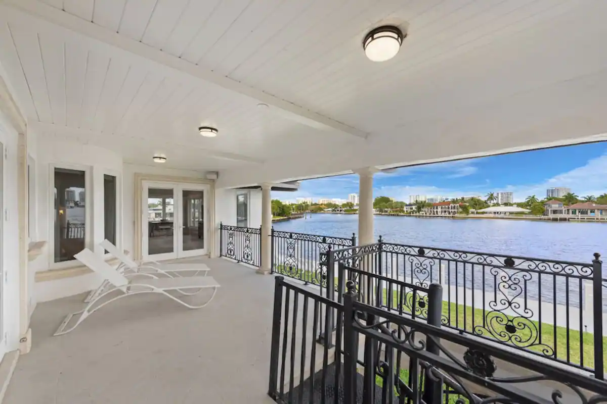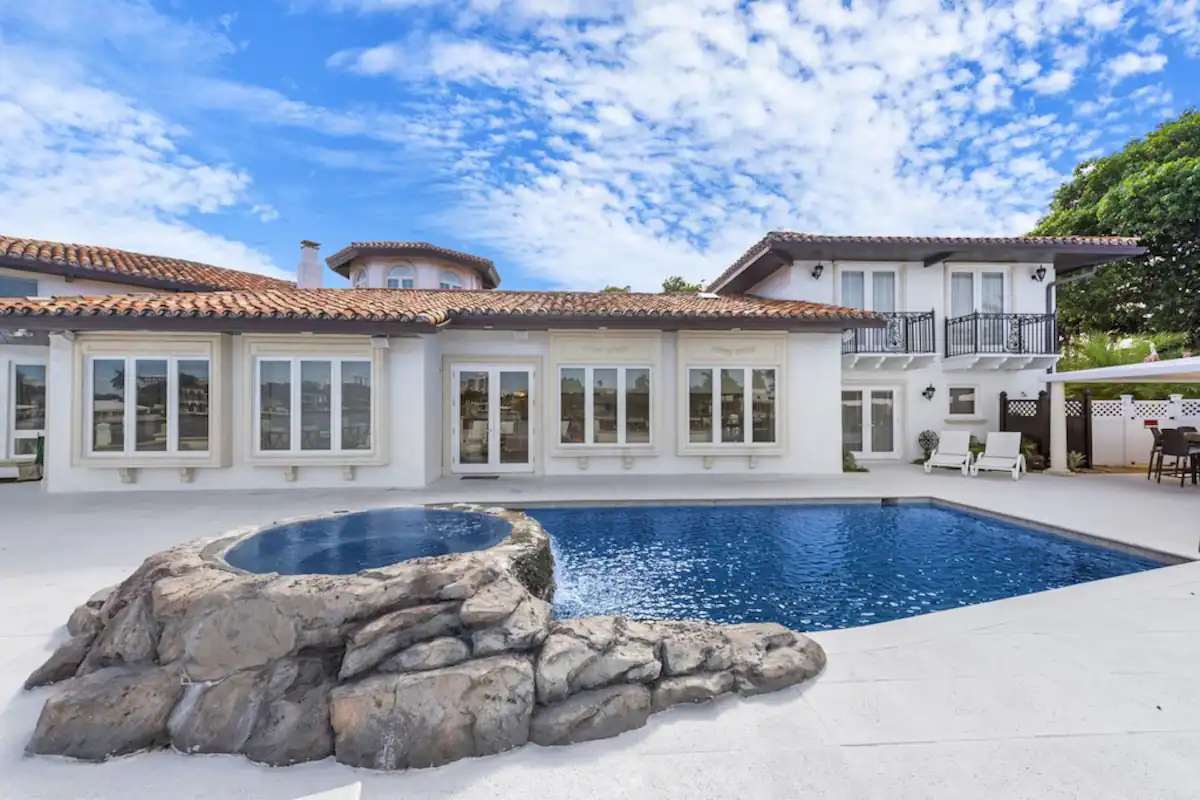 Experience the ultimate getaway at your own luxurious estate along the Intracoastal Waterway! This stunning 7-bedroom residence is adorned with sparkling chandeliers, elegant interior balconies, and expansive gathering spaces that invite both relaxation and celebration. The highlight of the property is the picturesque waterside yard, complete with inviting dining areas, perfect spots for drinks and socializing, as well as a refreshing pool and spa for your at-home relaxation.