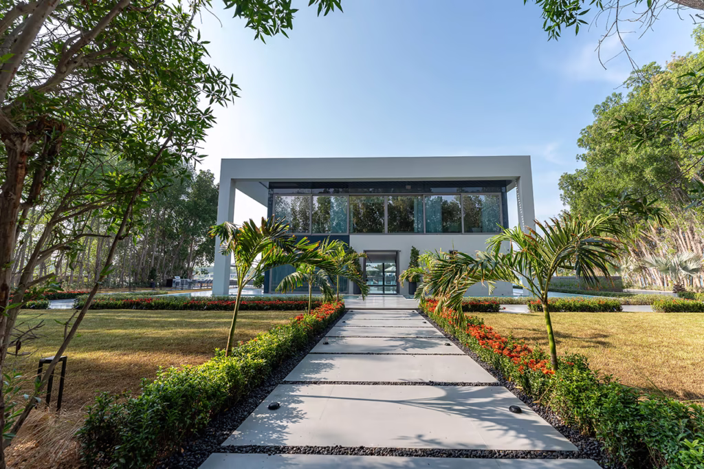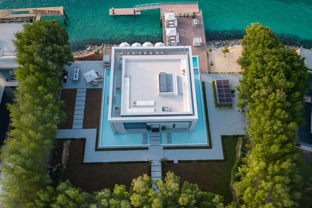 The villa features grand living spaces, a gourmet kitchen, and a serene outdoor area that includes private beach access and a pool, creating a sophisticated and tranquil retreat.