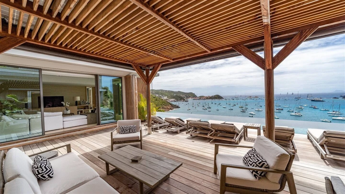 The beautiful vacation rental Biana, located in Corossol, is a superb new home in front of the ocean, in the center of tropical flora, making it an idyllic place for a perfect stay in St-Barths. The holiday home Bianca was built on various floors in a modern architecture with open and bright living spaces facing the panoramic view of Corossol Bay. It boasts an air-conditioned living room in neutral bright tones that is nicely equipped with huge sofas and several white and beige pillows, making it the ideal setting for delightful movie nights. The outdoor dining room, located beneath the covered terrace, can seat up to eight guests around a magnificent wooden table for dining al fresco, and adjoins a nice outdoor lounge area. The vast cream-toned kitchen in another building is perfectly equipped to prepare meals or to hire a private chef. It has a bar with six chairs topped with modern hanging lighting, which is a nice spot for talking and relaxing while watching the waves. There is also an outdoor grill.
