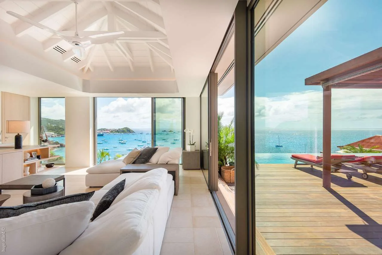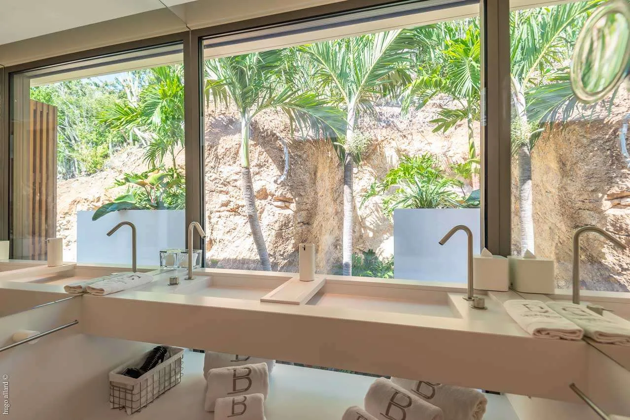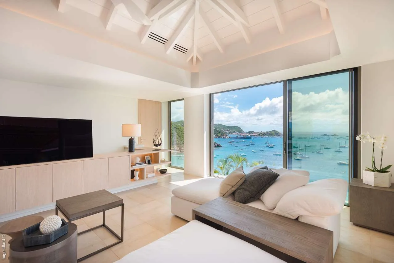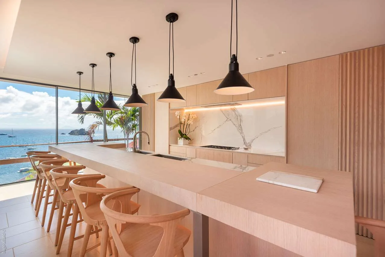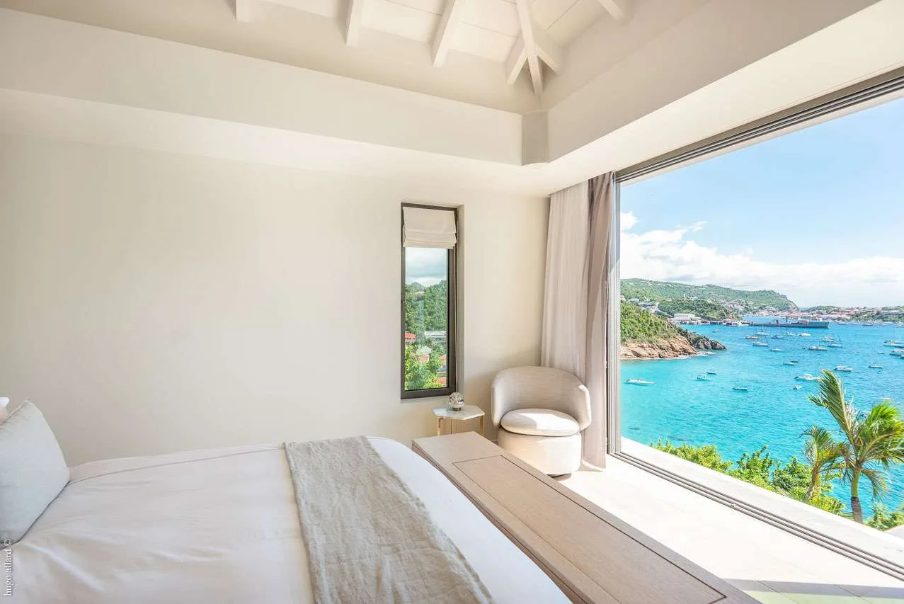 The beautiful vacation rental Biana, located in Corossol, is a superb new home in front of the ocean, in the center of tropical flora, making it an idyllic place for a perfect stay in St-Barths. The holiday home Bianca was built on various floors in a modern architecture with open and bright living spaces facing the panoramic view of Corossol Bay. It boasts an air-conditioned living room in neutral bright tones that is nicely equipped with huge sofas and several white and beige pillows, making it the ideal setting for delightful movie nights. The outdoor dining room, located beneath the covered terrace, can seat up to eight guests around a magnificent wooden table for dining al fresco, and adjoins a nice outdoor lounge area. The vast cream-toned kitchen in another building is perfectly equipped to prepare meals or to hire a private chef. It has a bar with six chairs topped with modern hanging lighting, which is a nice spot for talking and relaxing while watching the waves. There is also an outdoor grill.