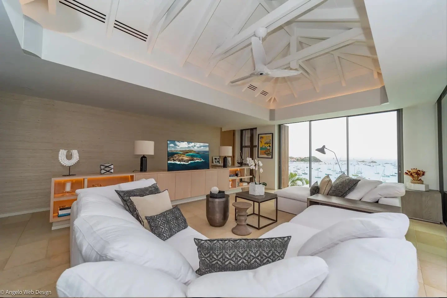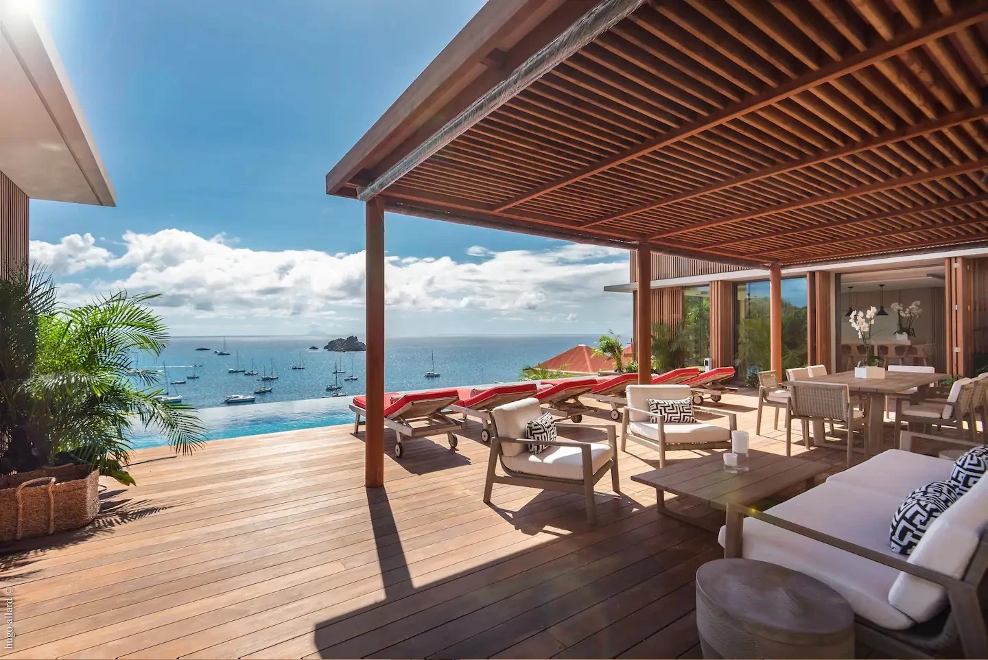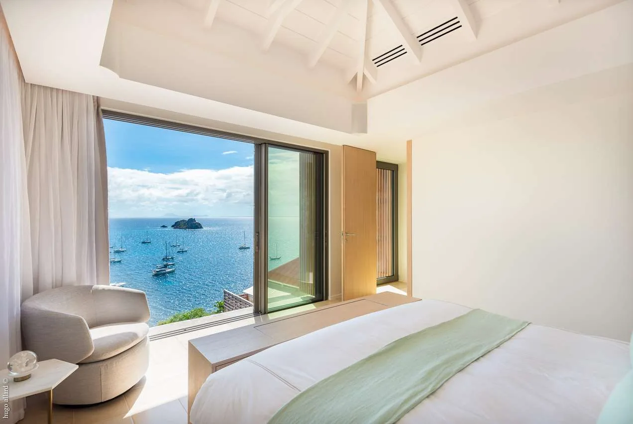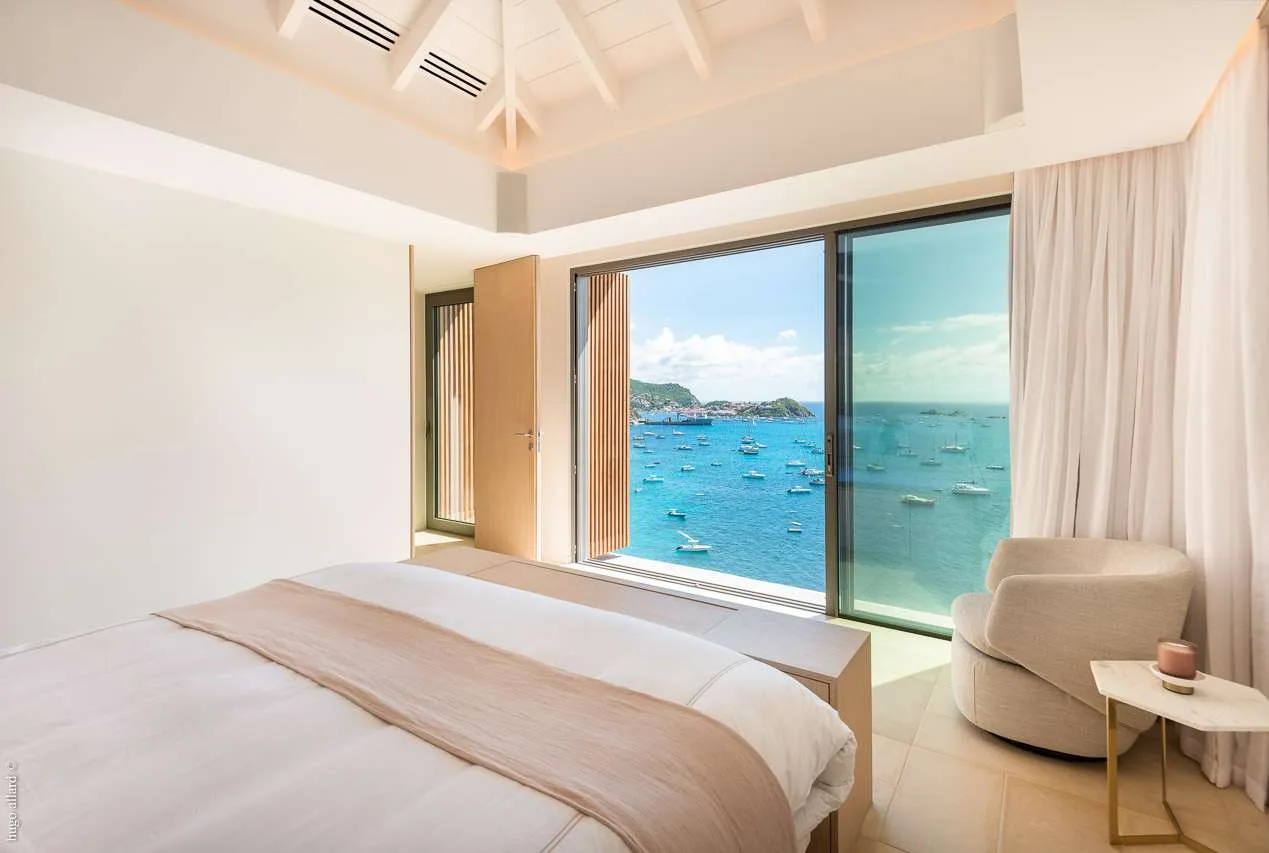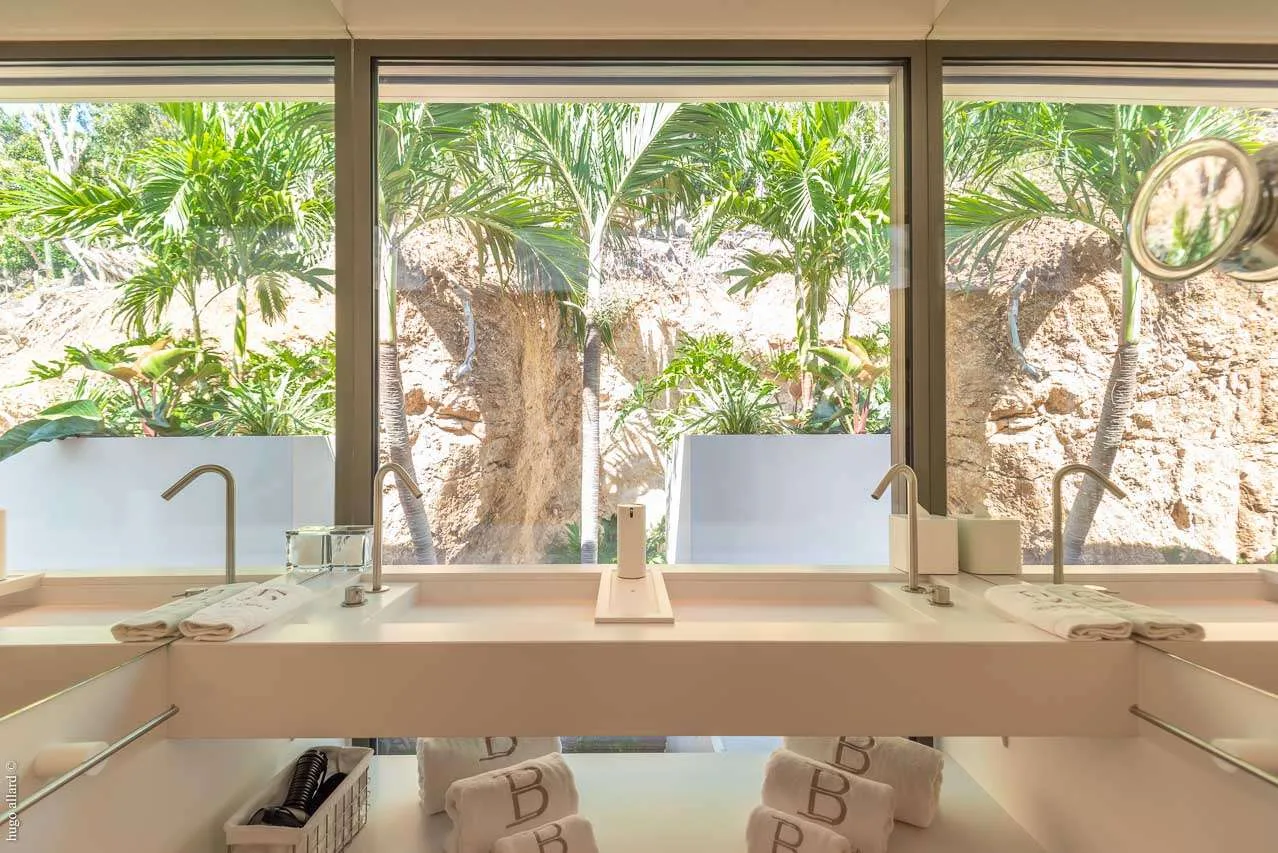 The beautiful vacation rental Biana, located in Corossol, is a superb new home in front of the ocean, in the center of tropical flora, making it an idyllic place for a perfect stay in St-Barths. The holiday home Bianca was built on various floors in a modern architecture with open and bright living spaces facing the panoramic view of Corossol Bay. It boasts an air-conditioned living room in neutral bright tones that is nicely equipped with huge sofas and several white and beige pillows, making it the ideal setting for delightful movie nights. The outdoor dining room, located beneath the covered terrace, can seat up to eight guests around a magnificent wooden table for dining al fresco, and adjoins a nice outdoor lounge area. The vast cream-toned kitchen in another building is perfectly equipped to prepare meals or to hire a private chef. It has a bar with six chairs topped with modern hanging lighting, which is a nice spot for talking and relaxing while watching the waves. There is also an outdoor grill.