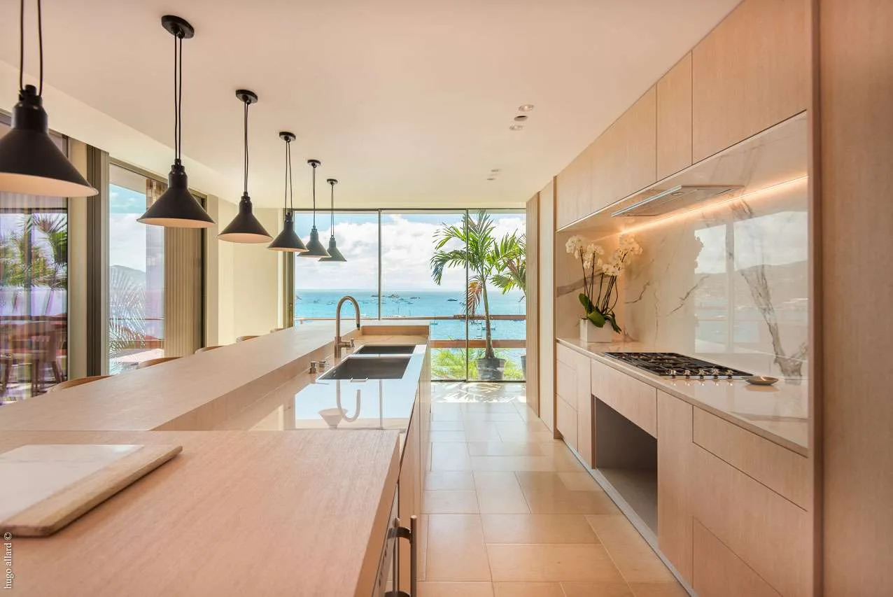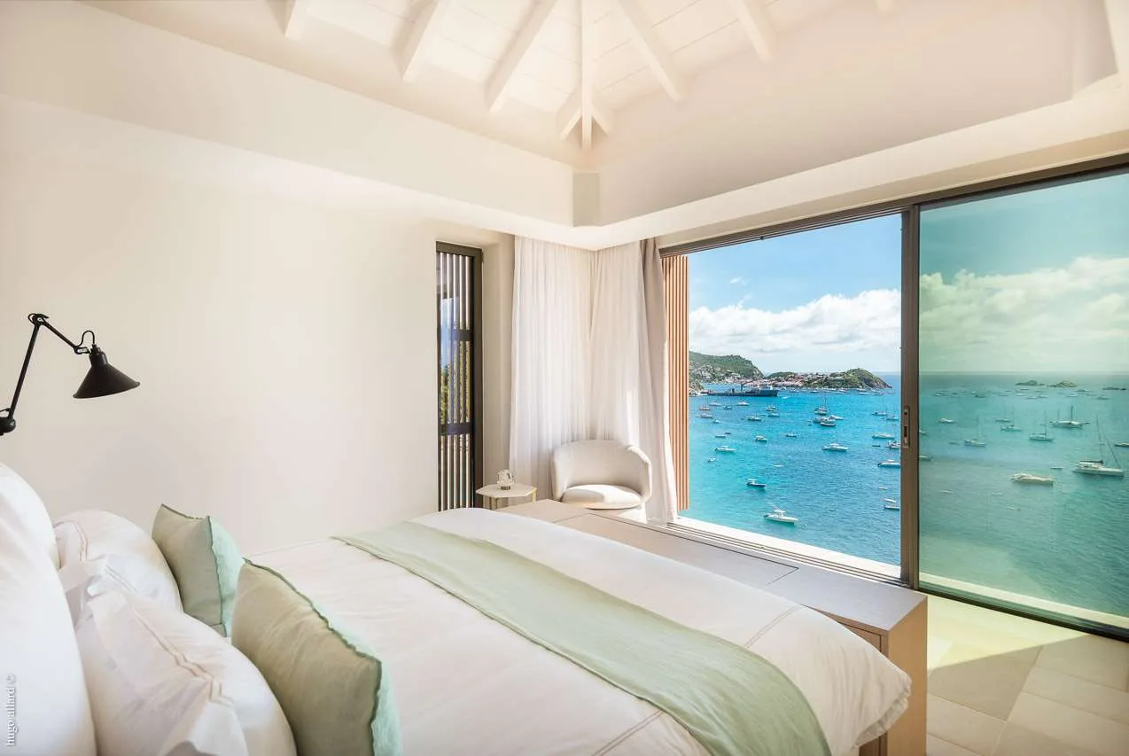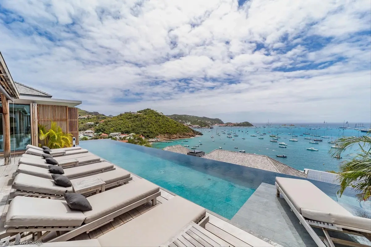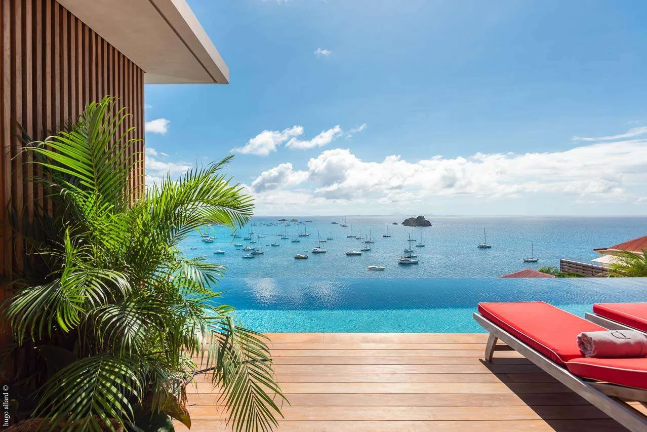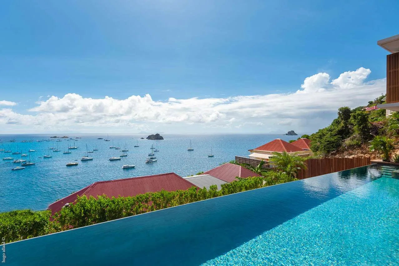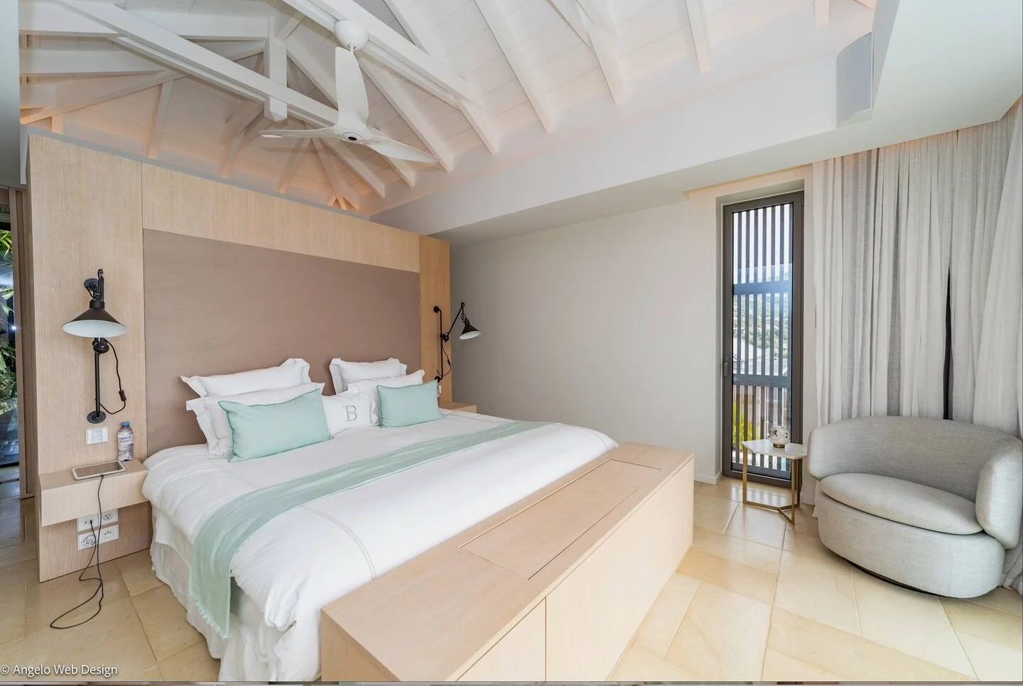 The beautiful vacation rental Biana, located in Corossol, is a superb new home in front of the ocean, in the center of tropical flora, making it an idyllic place for a perfect stay in St-Barths. The holiday home Bianca was built on various floors in a modern architecture with open and bright living spaces facing the panoramic view of Corossol Bay. It boasts an air-conditioned living room in neutral bright tones that is nicely equipped with huge sofas and several white and beige pillows, making it the ideal setting for delightful movie nights. The outdoor dining room, located beneath the covered terrace, can seat up to eight guests around a magnificent wooden table for dining al fresco, and adjoins a nice outdoor lounge area. The vast cream-toned kitchen in another building is perfectly equipped to prepare meals or to hire a private chef. It has a bar with six chairs topped with modern hanging lighting, which is a nice spot for talking and relaxing while watching the waves. There is also an outdoor grill.