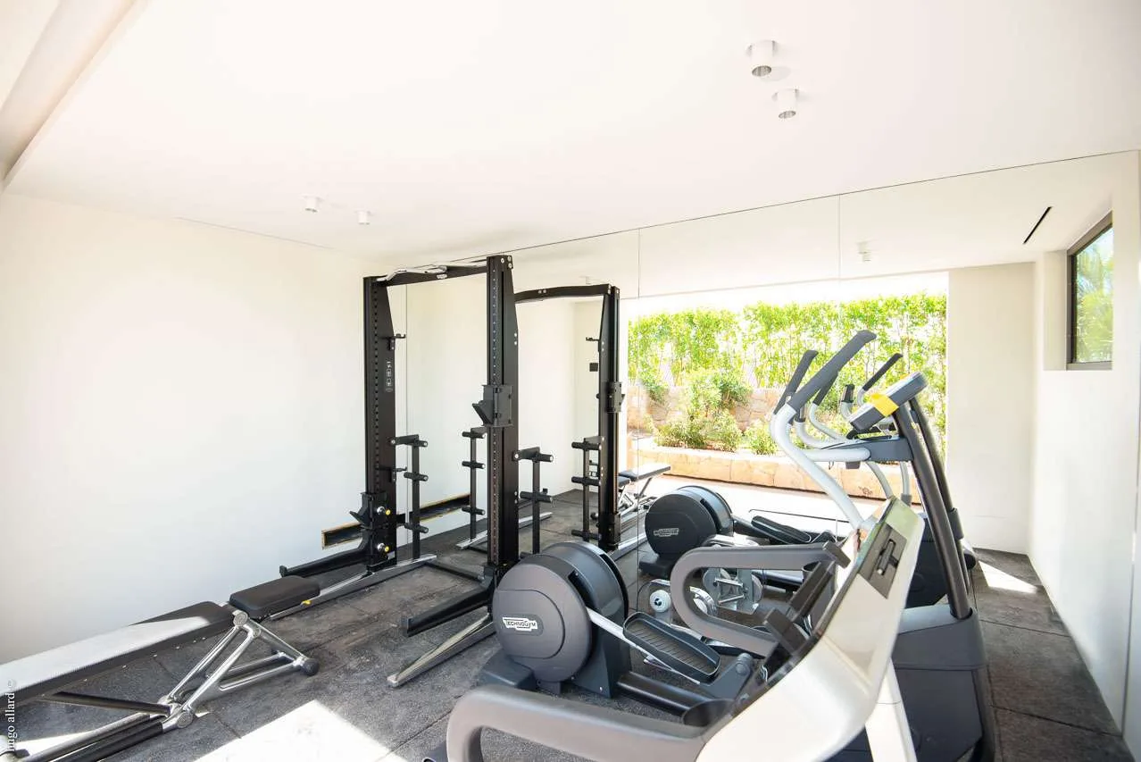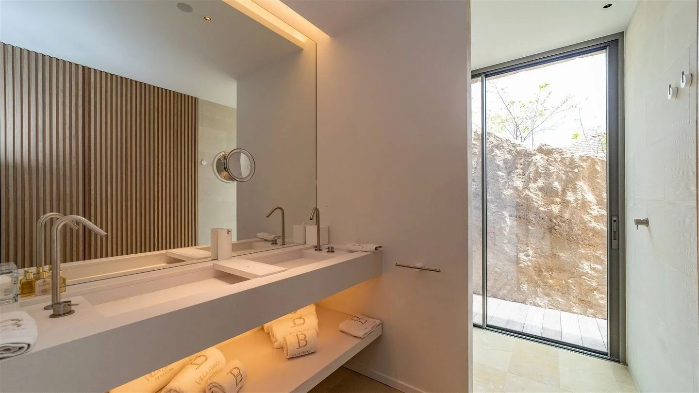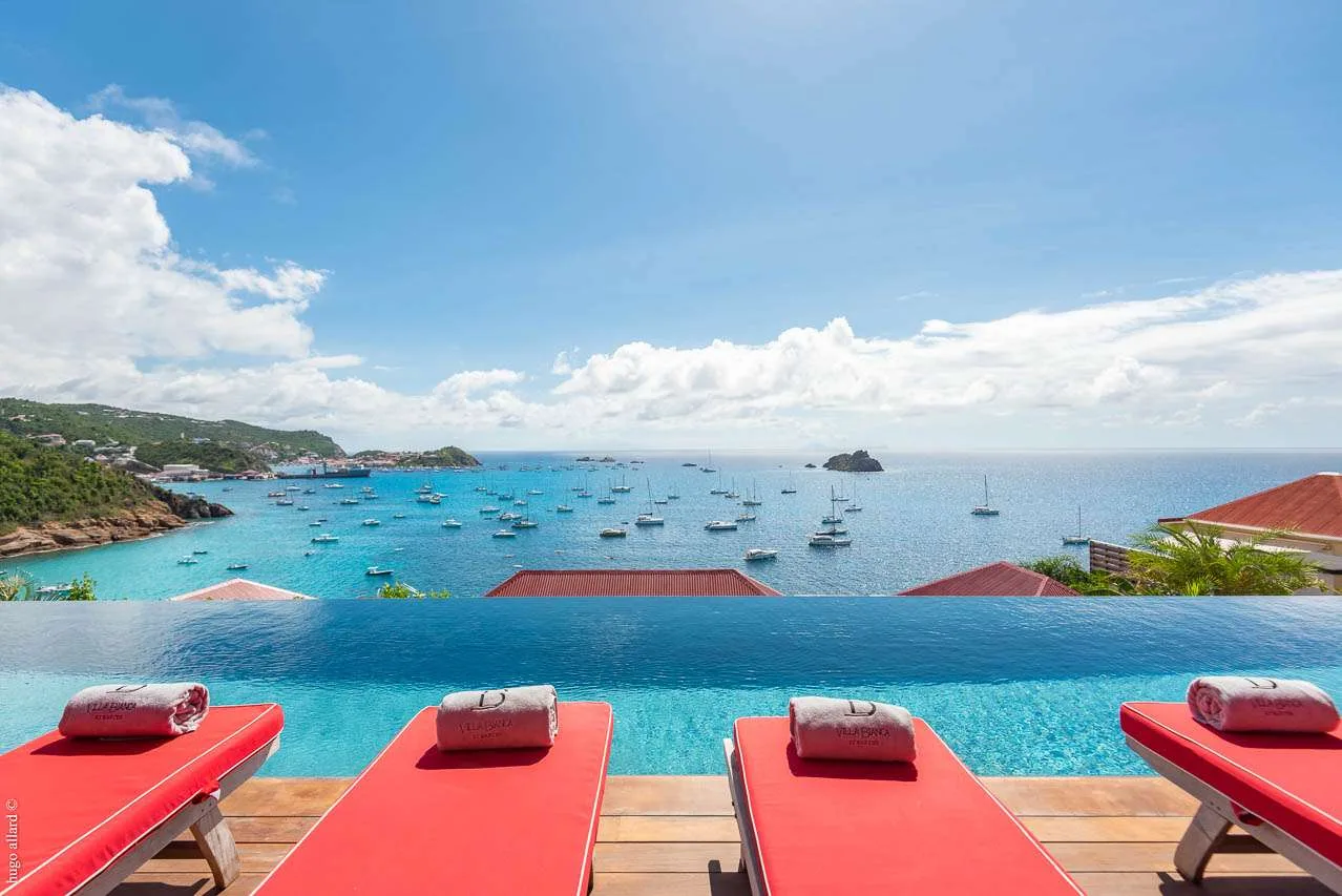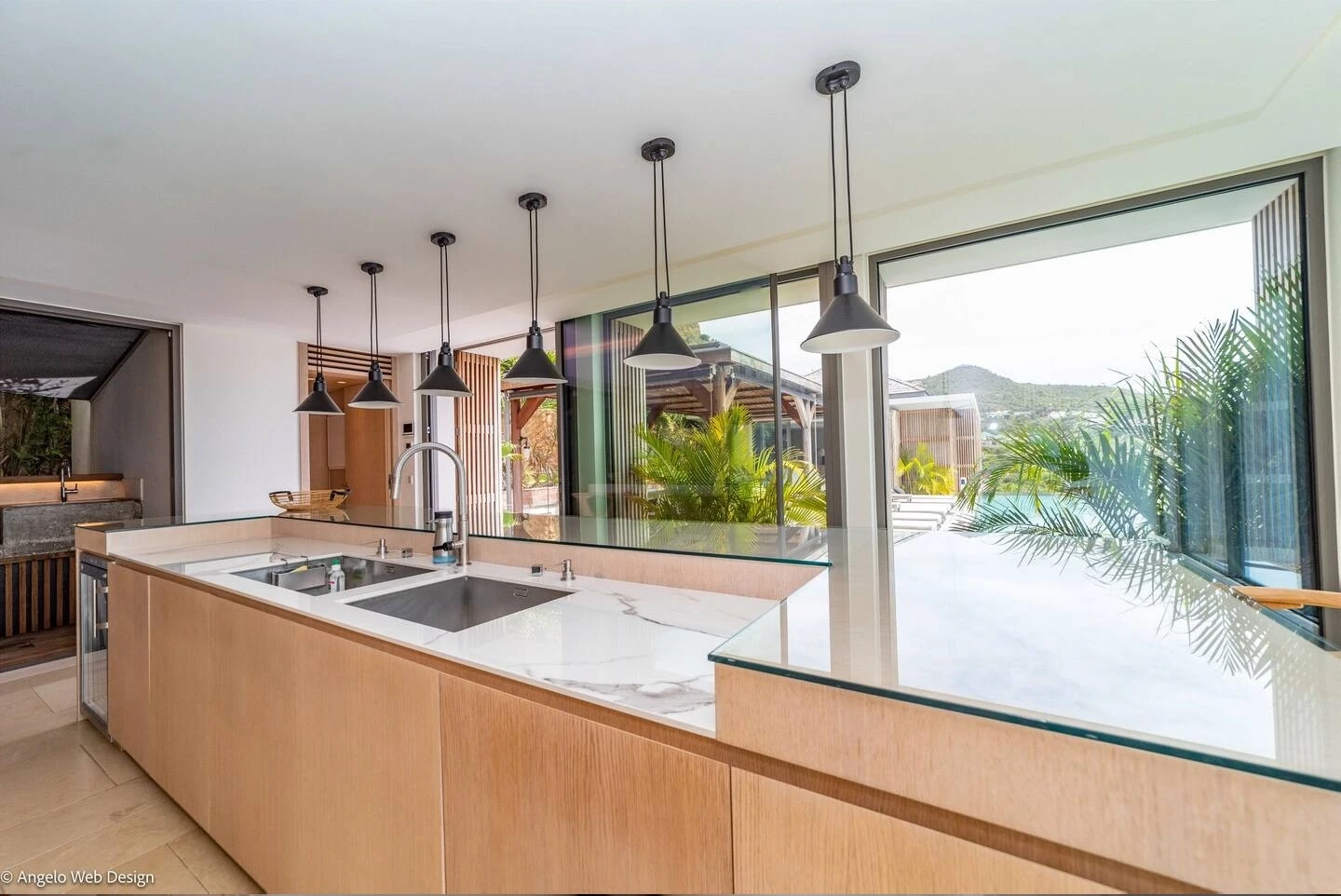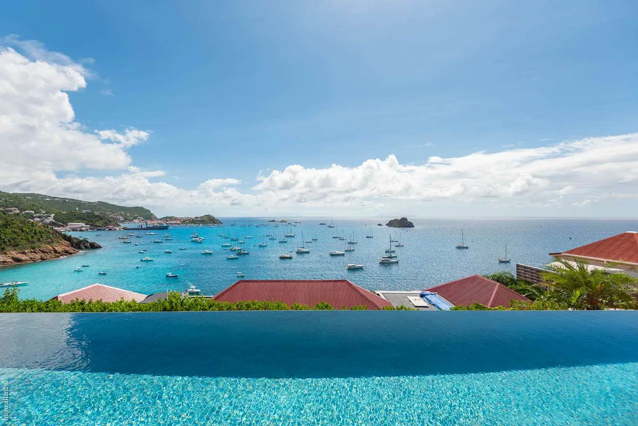 The beautiful vacation rental Biana, located in Corossol, is a superb new home in front of the ocean, in the center of tropical flora, making it an idyllic place for a perfect stay in St-Barths. The holiday home Bianca was built on various floors in a modern architecture with open and bright living spaces facing the panoramic view of Corossol Bay. It boasts an air-conditioned living room in neutral bright tones that is nicely equipped with huge sofas and several white and beige pillows, making it the ideal setting for delightful movie nights. The outdoor dining room, located beneath the covered terrace, can seat up to eight guests around a magnificent wooden table for dining al fresco, and adjoins a nice outdoor lounge area. The vast cream-toned kitchen in another building is perfectly equipped to prepare meals or to hire a private chef. It has a bar with six chairs topped with modern hanging lighting, which is a nice spot for talking and relaxing while watching the waves. There is also an outdoor grill.