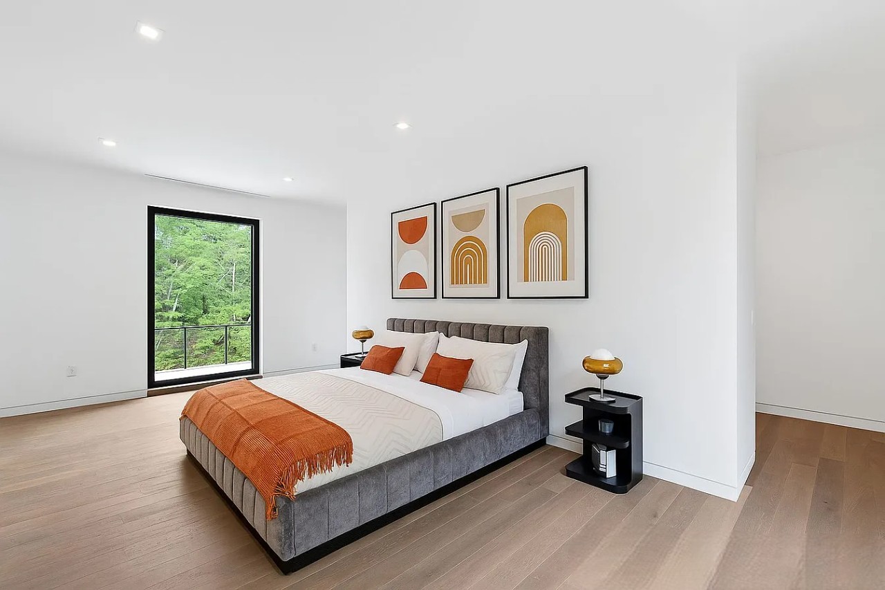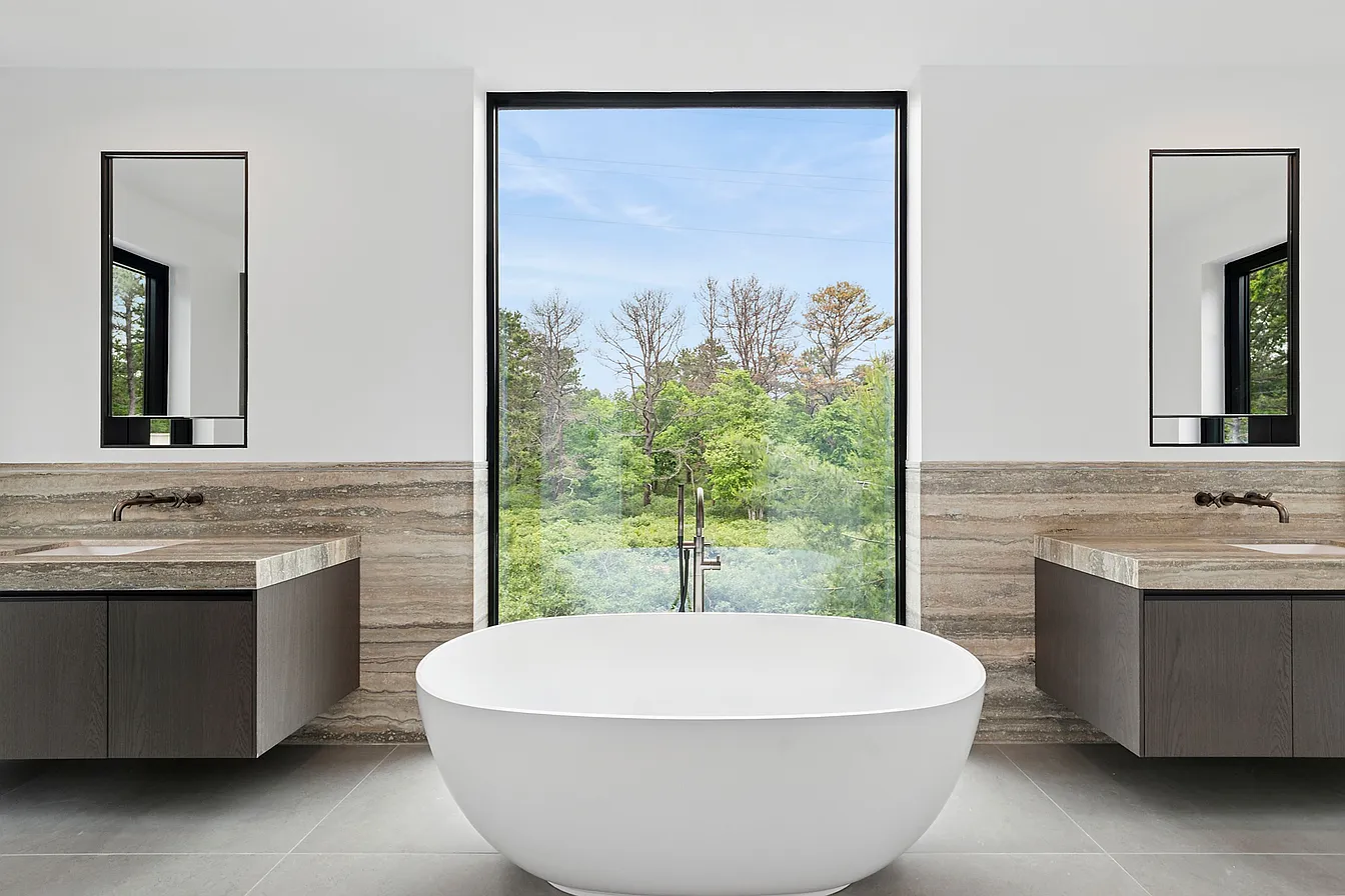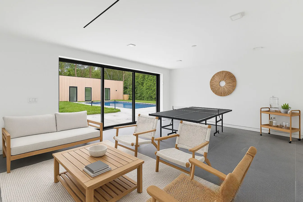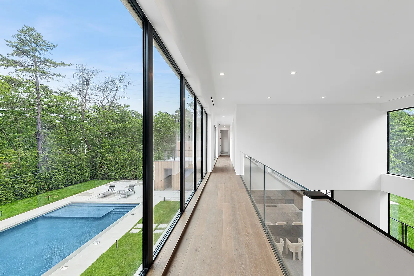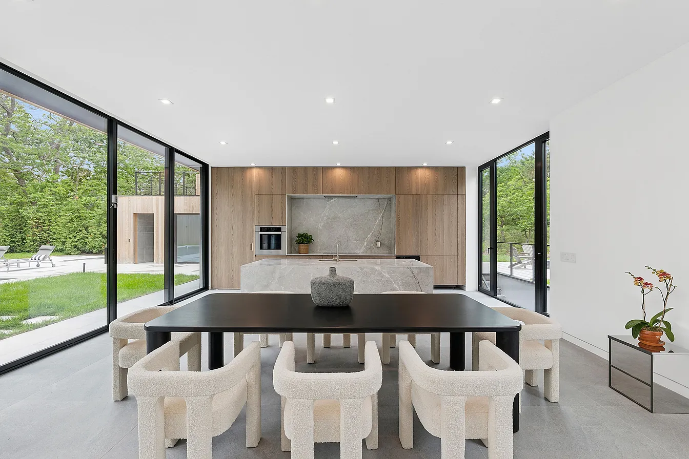 The design masterfully integrates indoor and outdoor living, featuring expansive floor-to-ceiling glass sliders and oversized windows that frame serene views while flooding the interiors with sunlight. The main level showcases modern elegance with 48″ x 48″ Italian porcelain tiles and textured natural rock, while the upper floors are warmed by European oak flooring, enhancing the minimalist aesthetic. At the heart of the dramatic great room is a full-height fireplace clad in imported Italian silver travertine, seamlessly connecting to a 20′ x 40′ heated gunite pool, a pool house, and lush garden terraces, all crafted for year-round enjoyment and privacy.