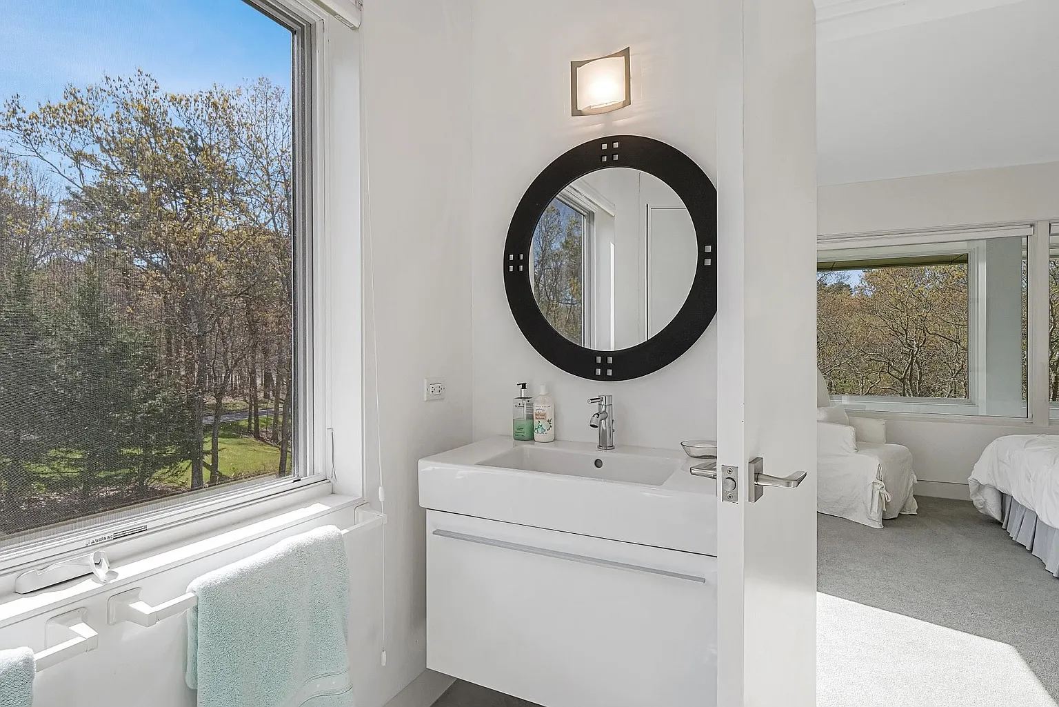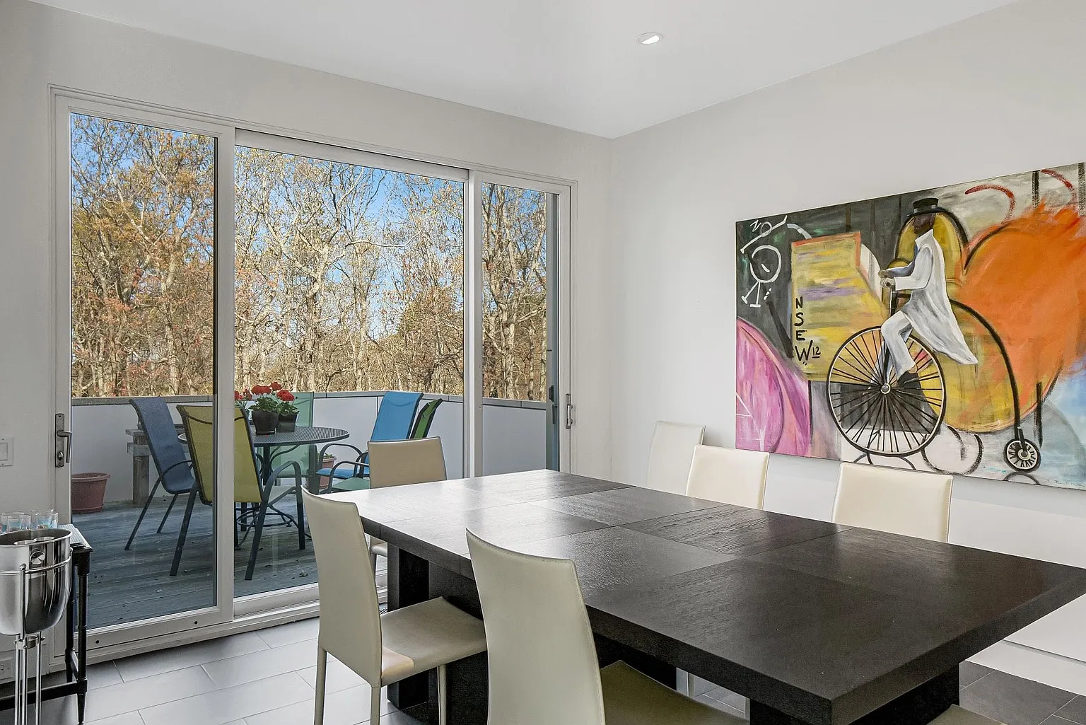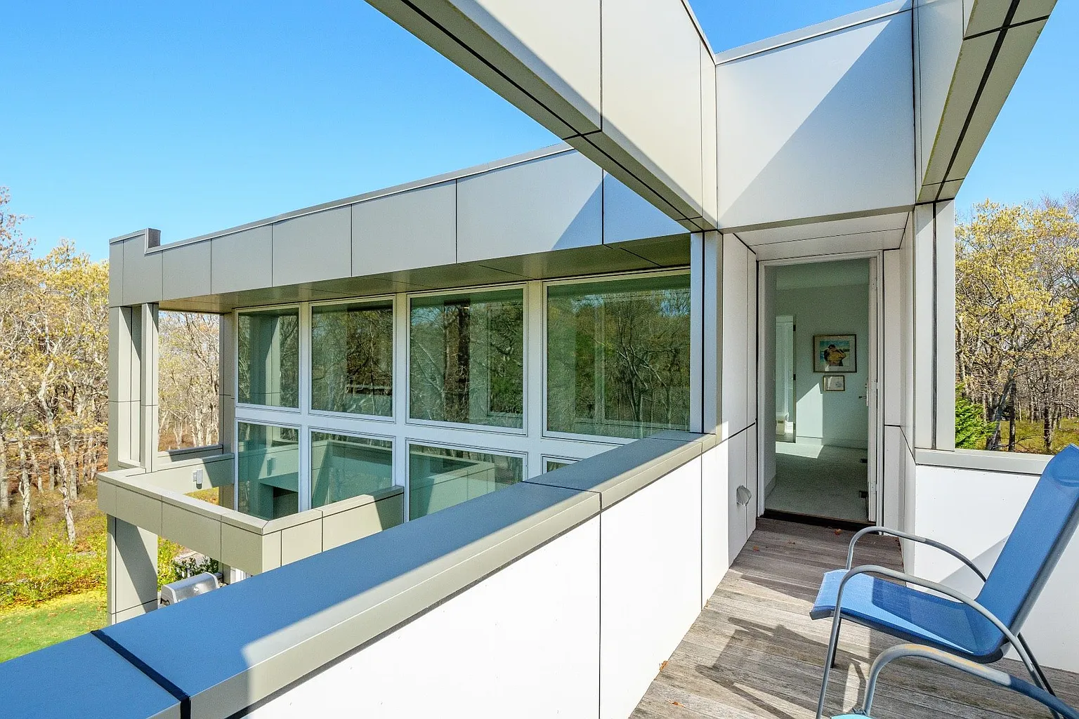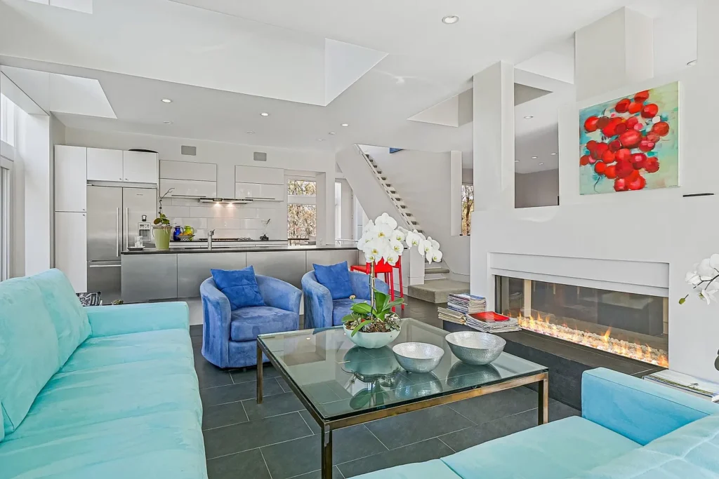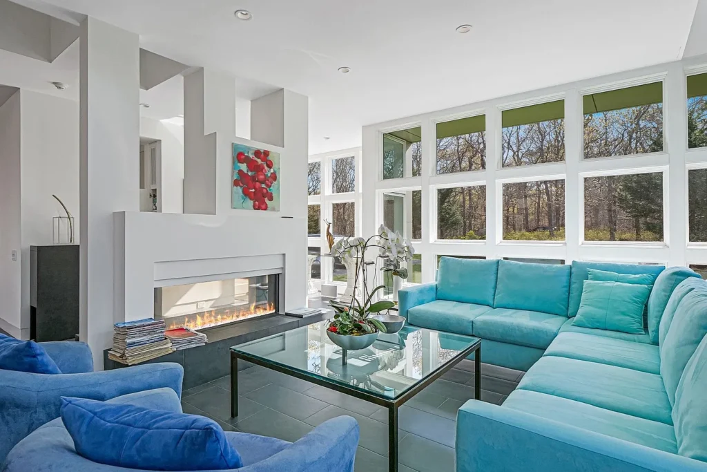 The open-plan design seamlessly connects the living room, dining room, and kitchen, creating a harmonious flow throughout the main living areas. Expansive glass windows invite the beauty of the outdoors inside, while an outdoor deck basks in the morning sun, and a west-facing deck offers stunning sunset views. The rooftop deck provides a picturesque vantage point overlooking Peconic Bay.