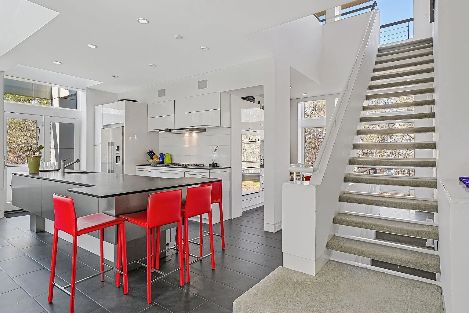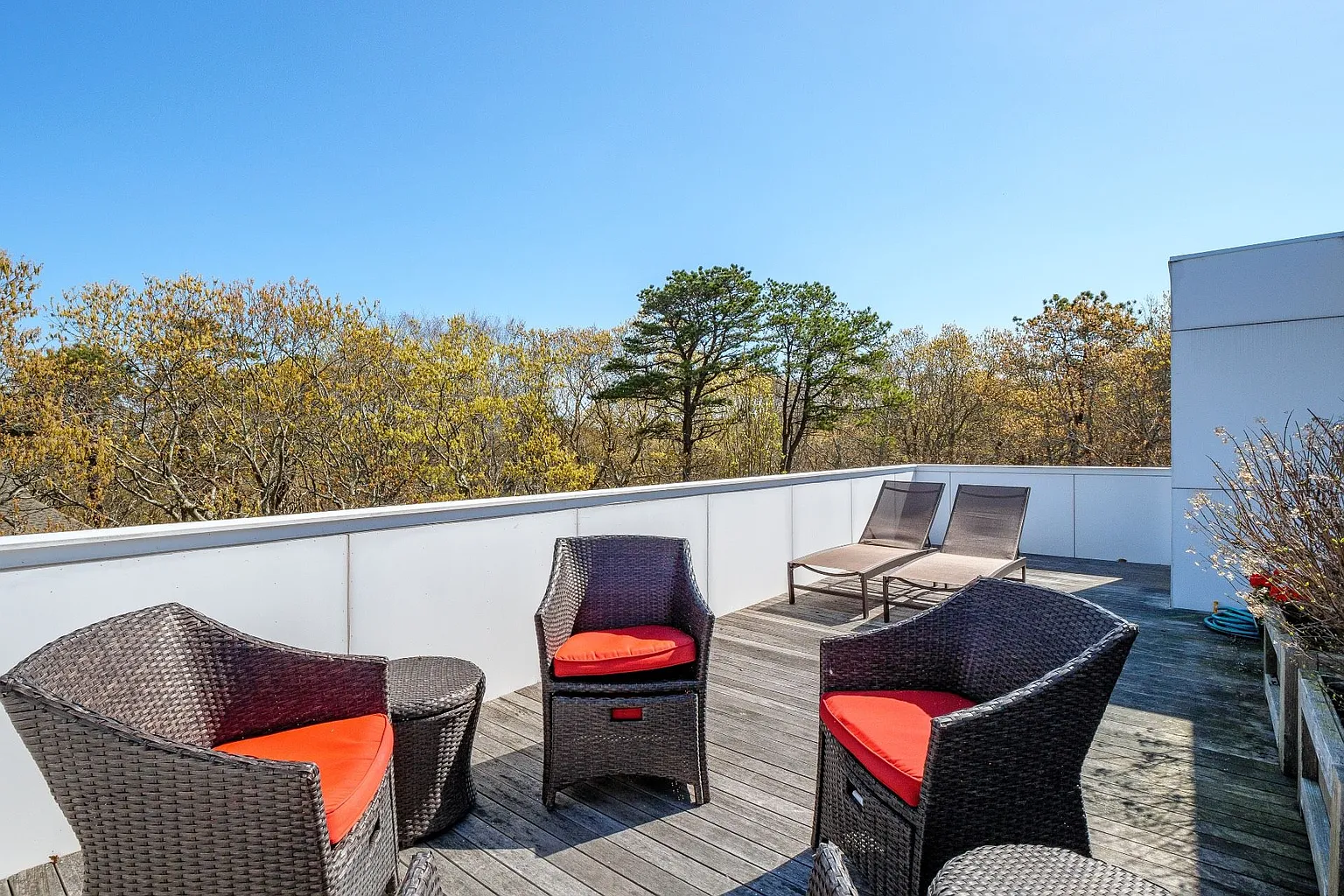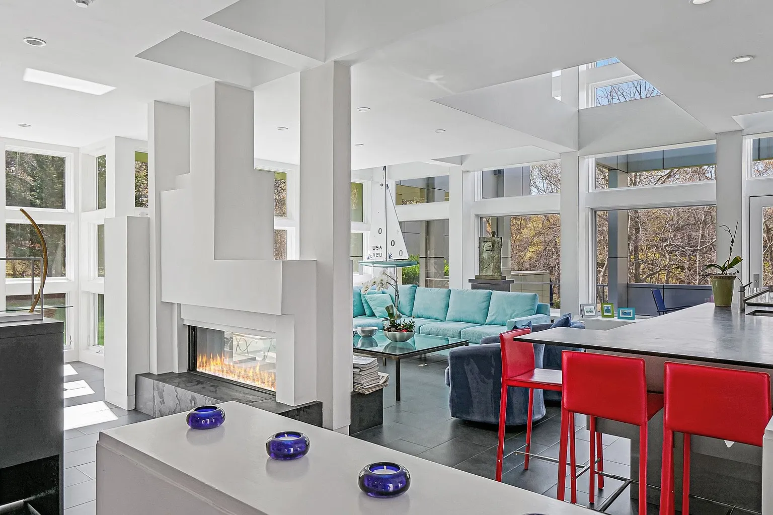 The open-plan design seamlessly connects the living room, dining room, and kitchen, creating a harmonious flow throughout the main living areas. Expansive glass windows invite the beauty of the outdoors inside, while an outdoor deck basks in the morning sun, and a west-facing deck offers stunning sunset views. The rooftop deck provides a picturesque vantage point overlooking Peconic Bay.
