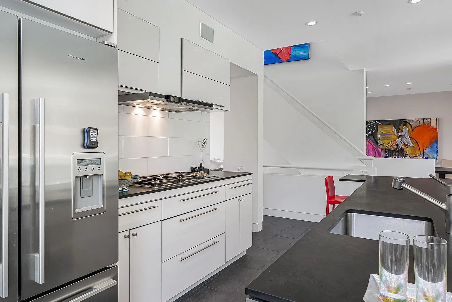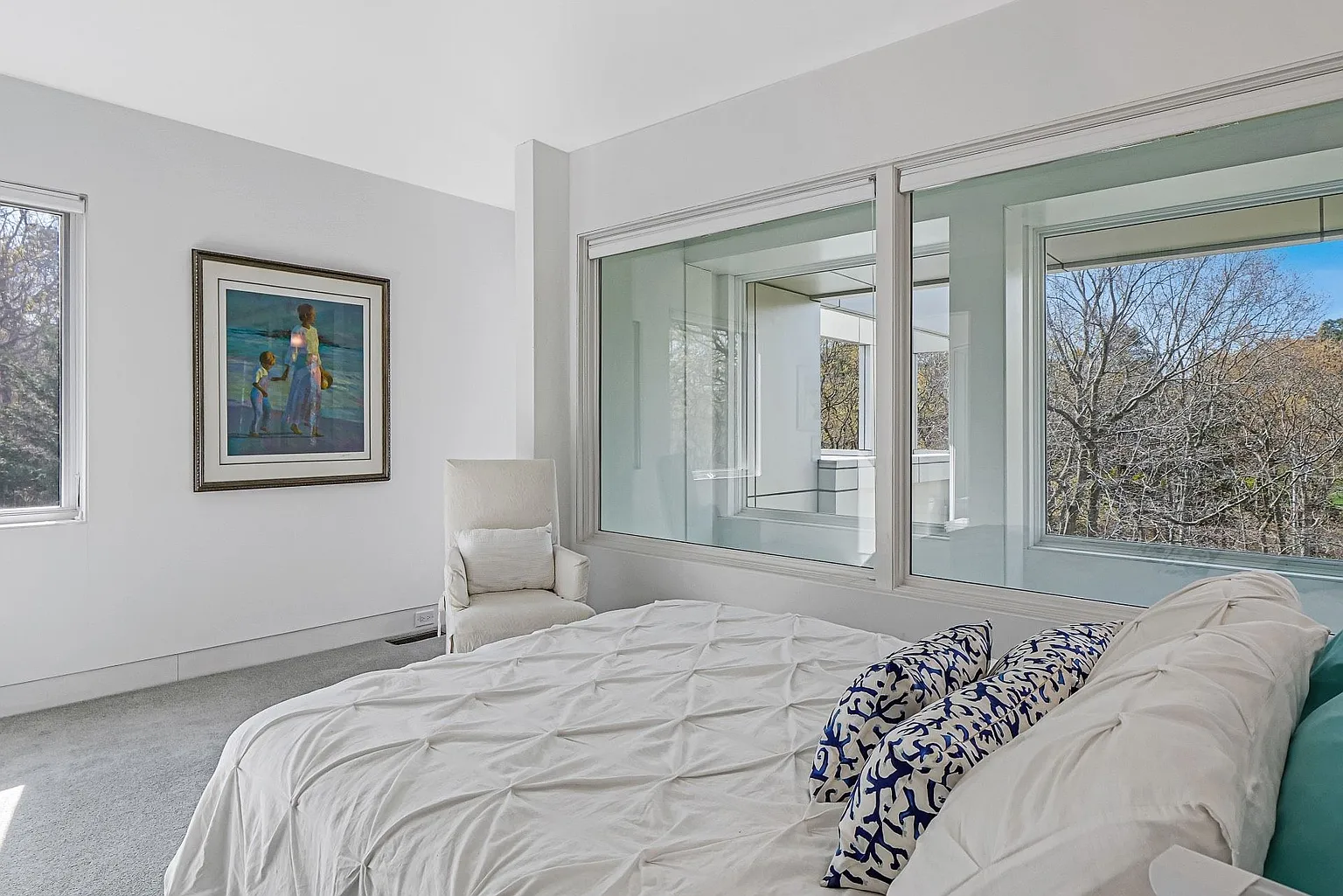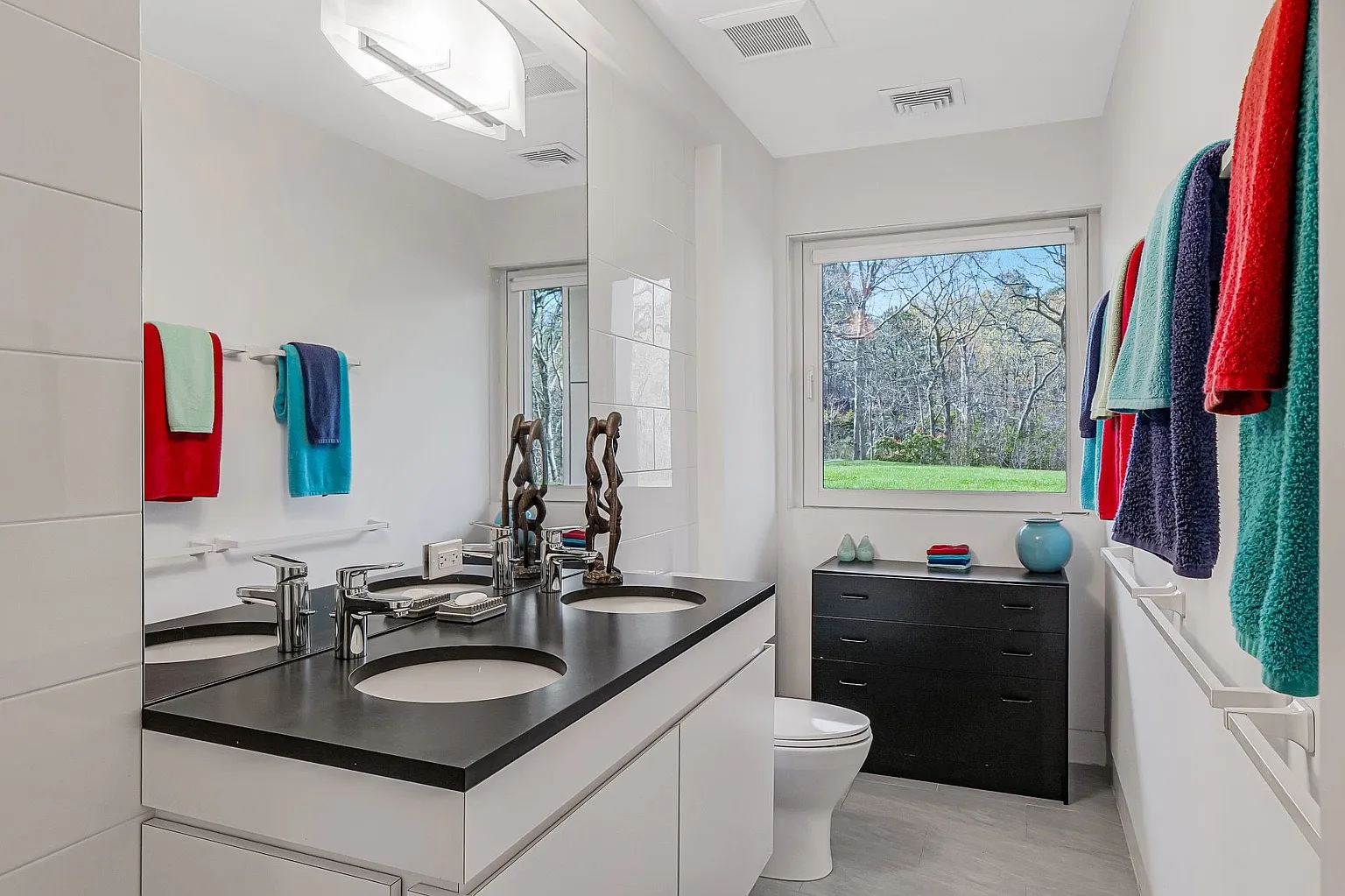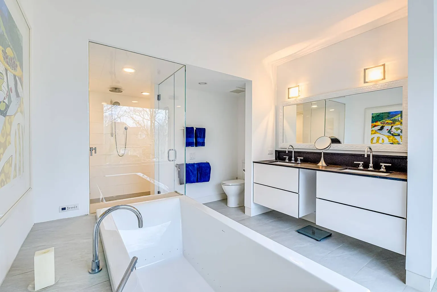 The open-plan design seamlessly connects the living room, dining room, and kitchen, creating a harmonious flow throughout the main living areas. Expansive glass windows invite the beauty of the outdoors inside, while an outdoor deck basks in the morning sun, and a west-facing deck offers stunning sunset views. The rooftop deck provides a picturesque vantage point overlooking Peconic Bay.