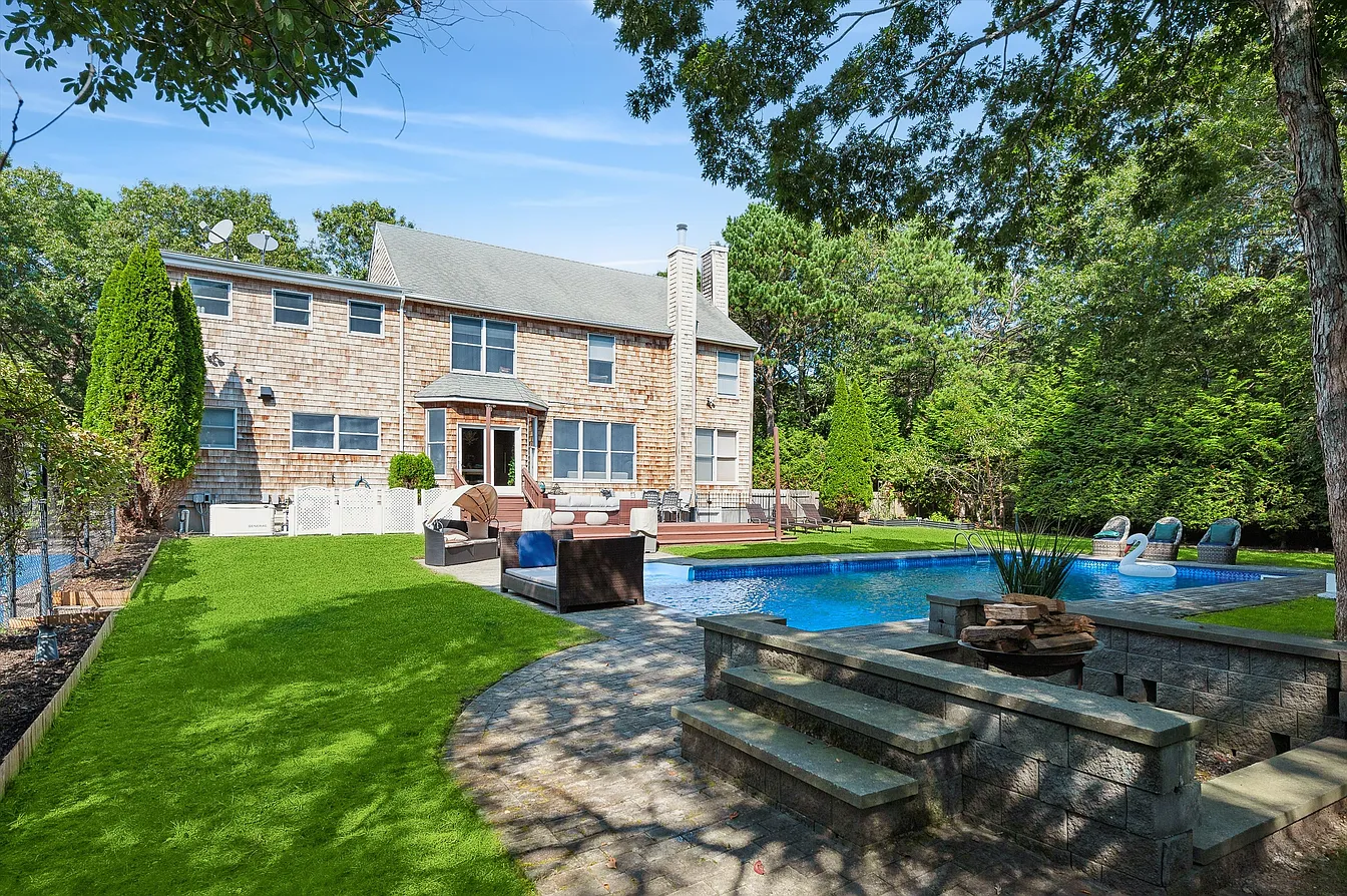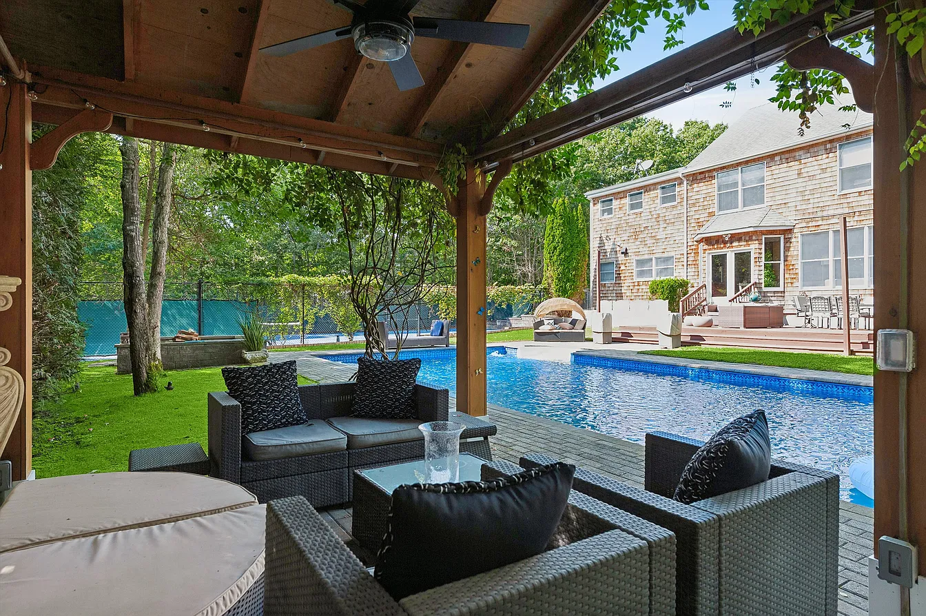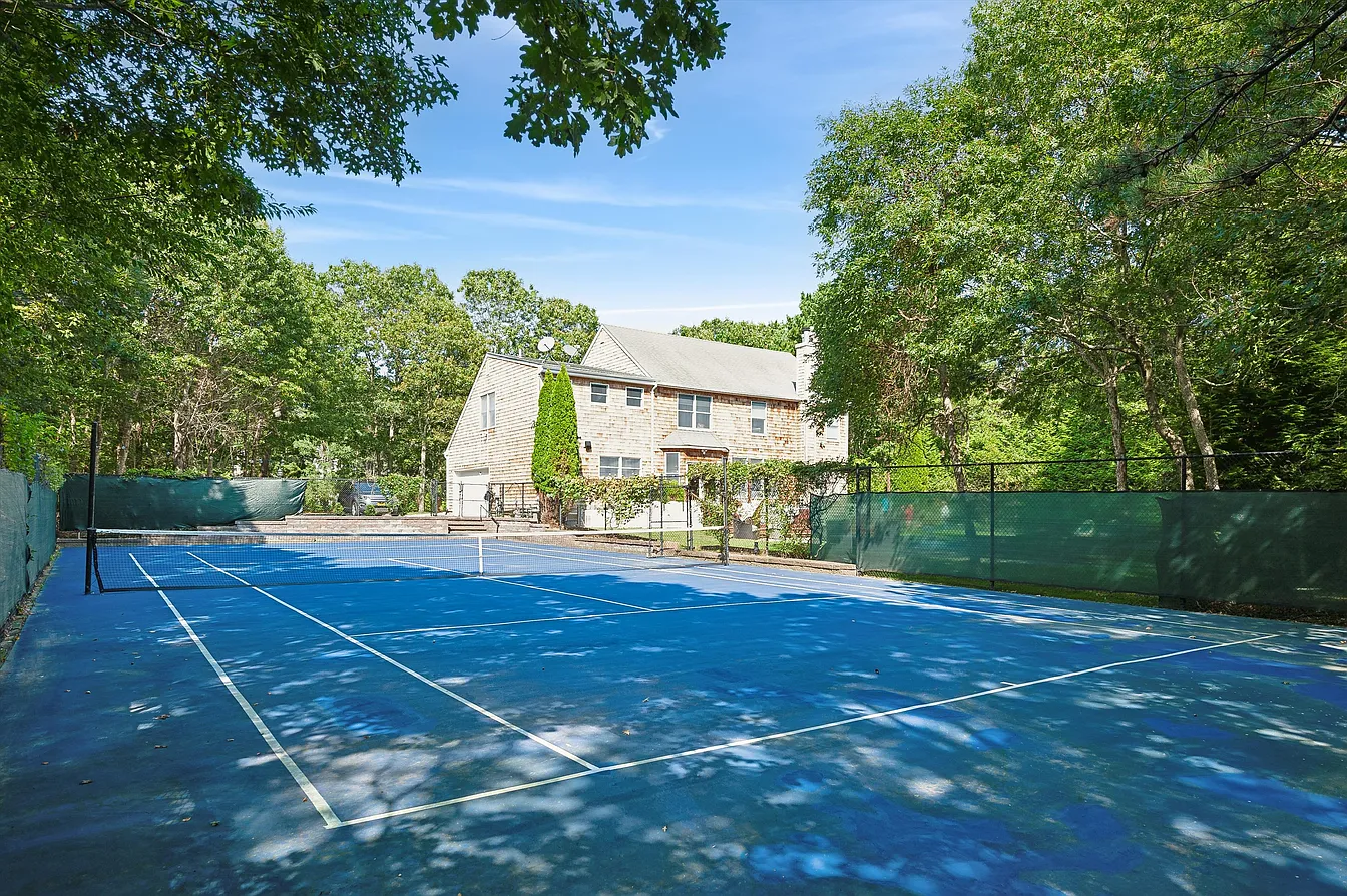 Upstairs, four ensuite bedrooms provide comfort and privacy. The primary suite includes a king-sized bed and a luxurious bathroom with a shower and jacuzzi tub. Three more bedrooms, each with queen-sized beds and private baths, complete the upper level. Outside, the backyard is designed for summer enjoyment, boasting a vinyl pool, a new all-weather tennis court, a fire pit, and a spacious deck with a pergola ideal for large gatherings. The home’s location offers easy access to Southampton’s stunning beaches, fine dining, gourmet grocery stores, local farm stands, and charming nearby villages.