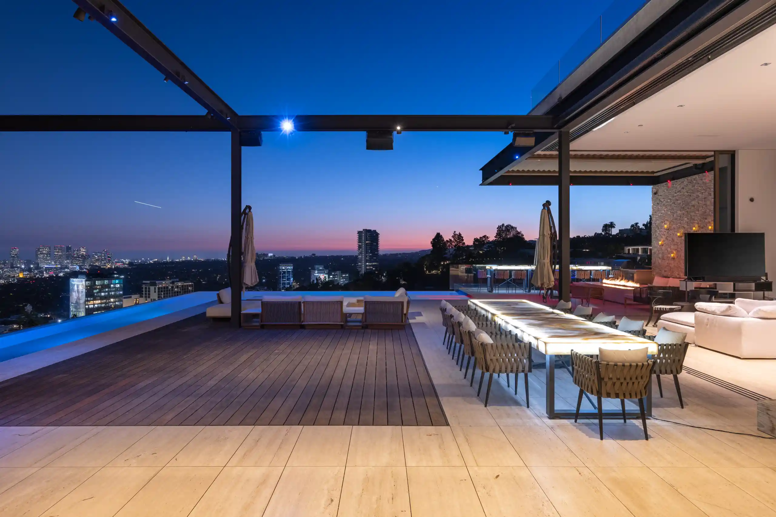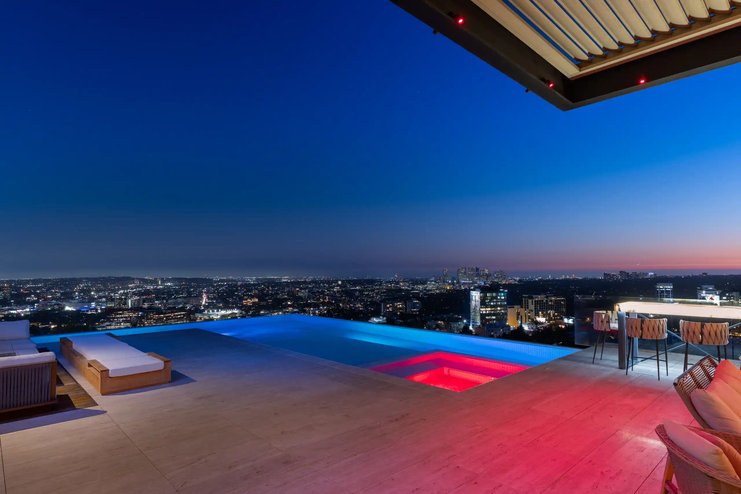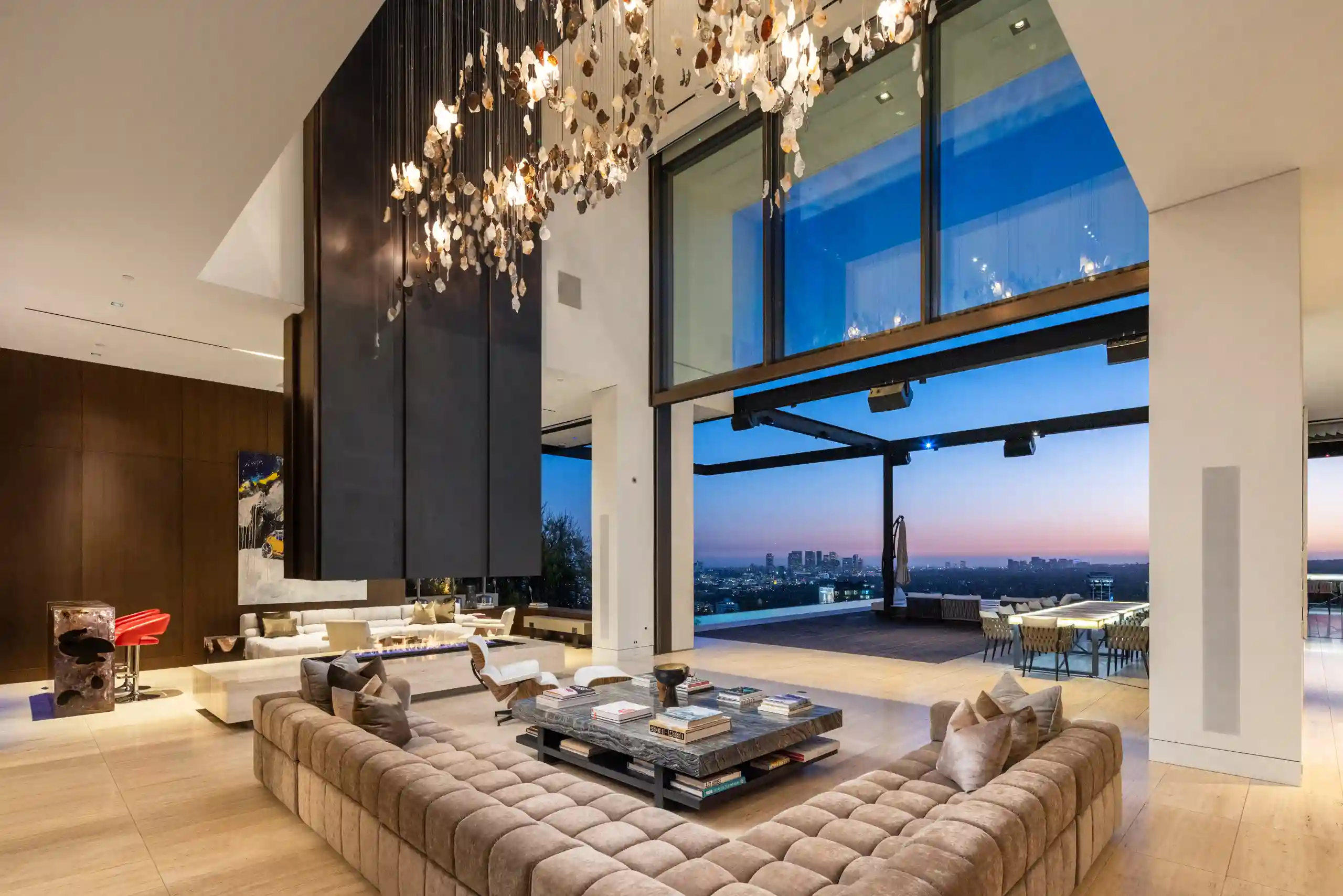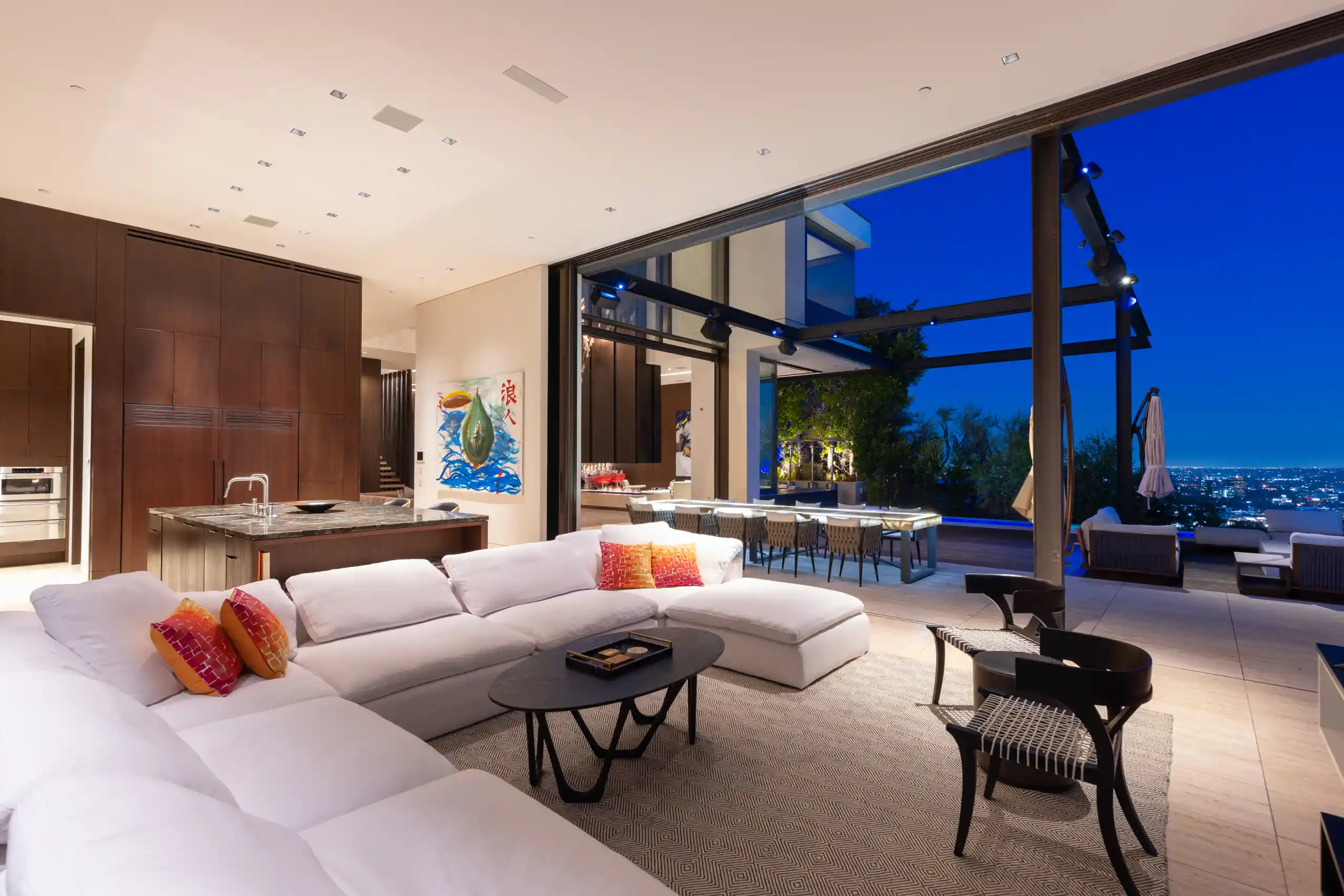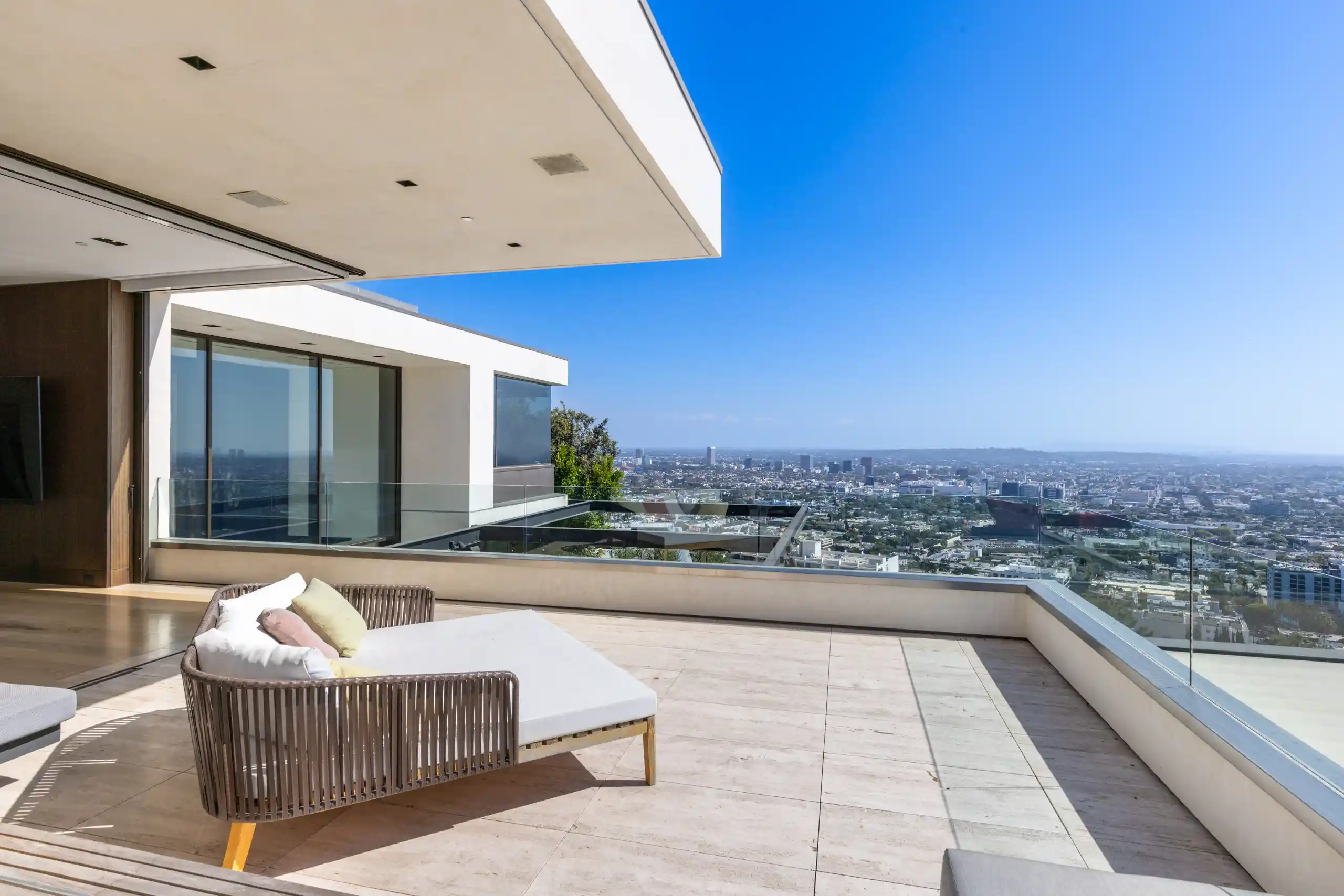 Perched on a coveted promontory, a premier architectural estate offering 11,800 square feet of sophisticated living space. This six-bedroom, seven-bathroom residence features panoramic views from Downtown Los Angeles to the Pacific Ocean, framed by dramatic retractable glass walls.