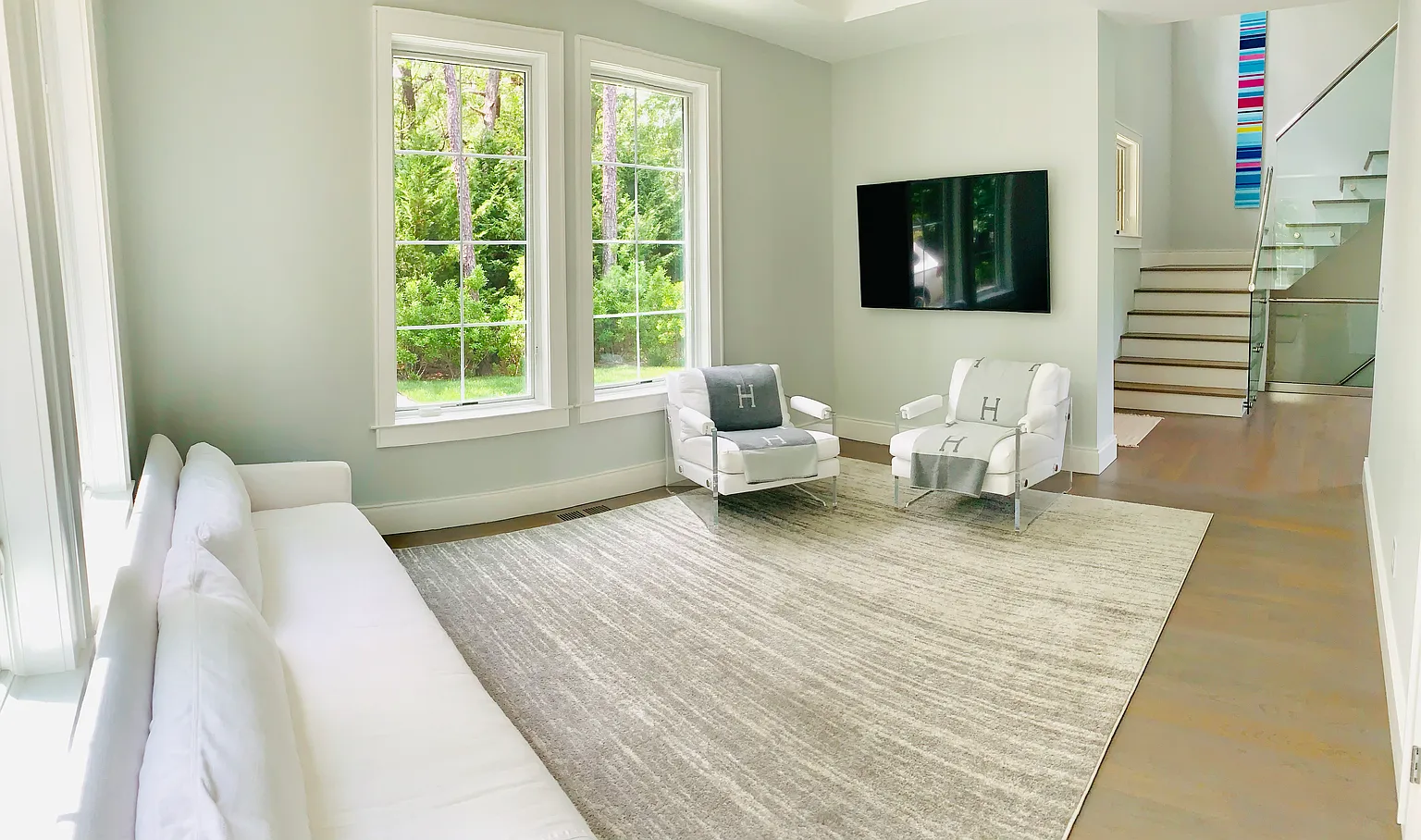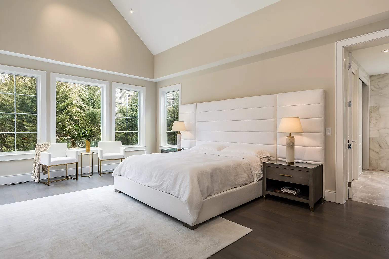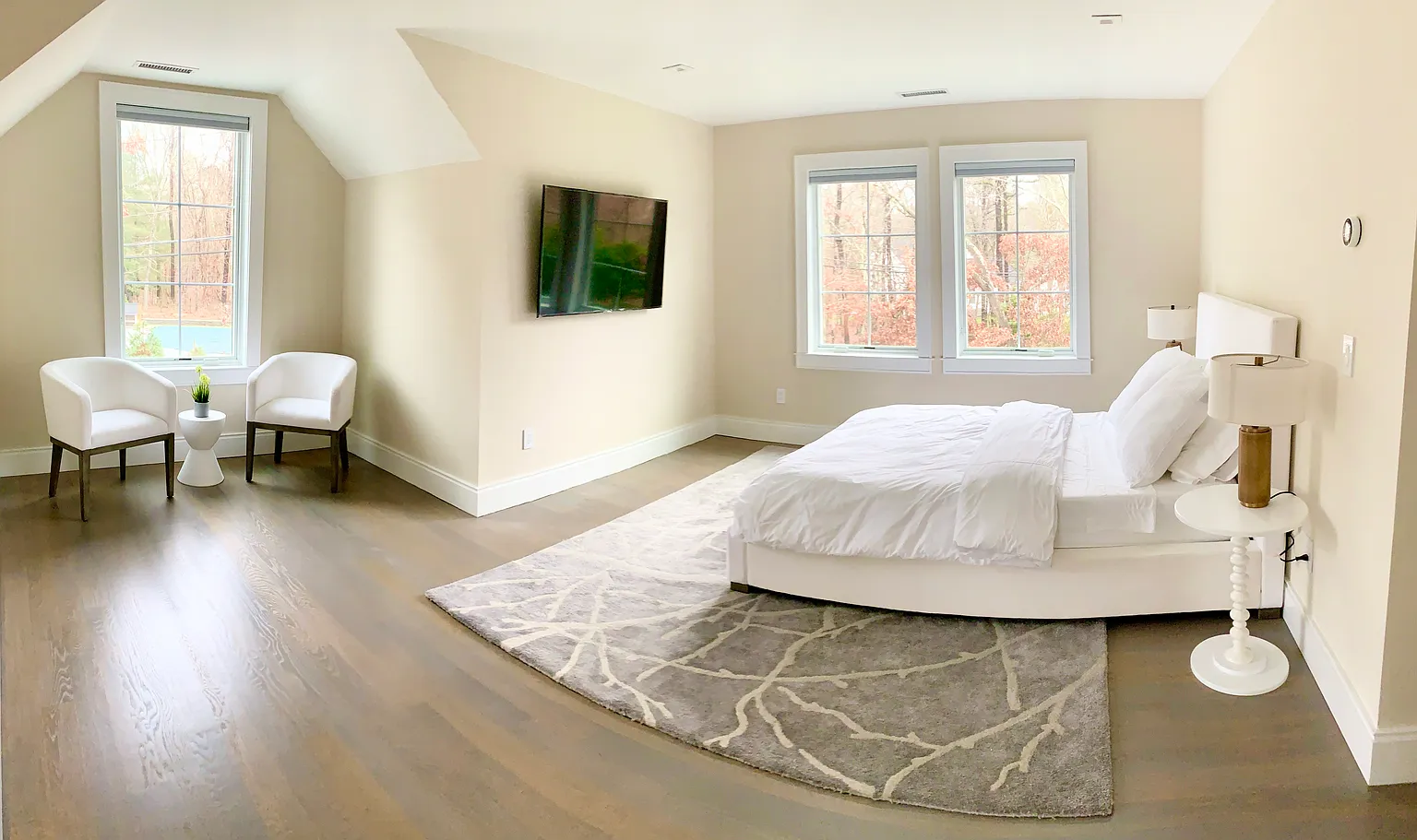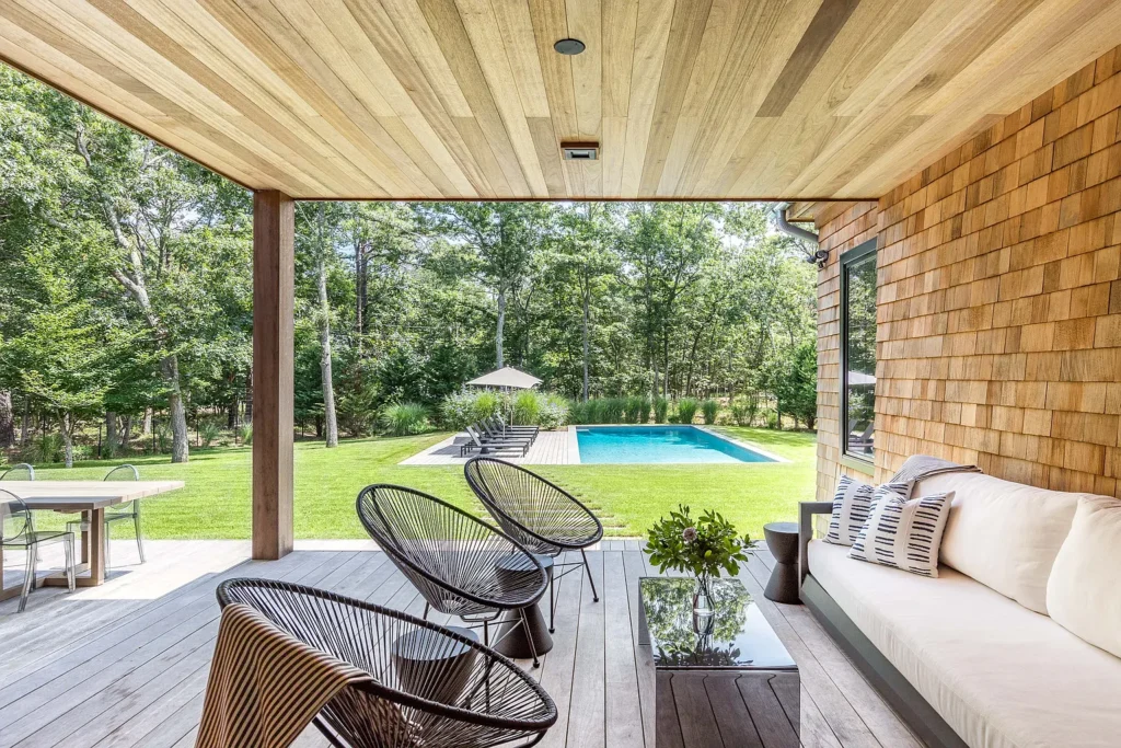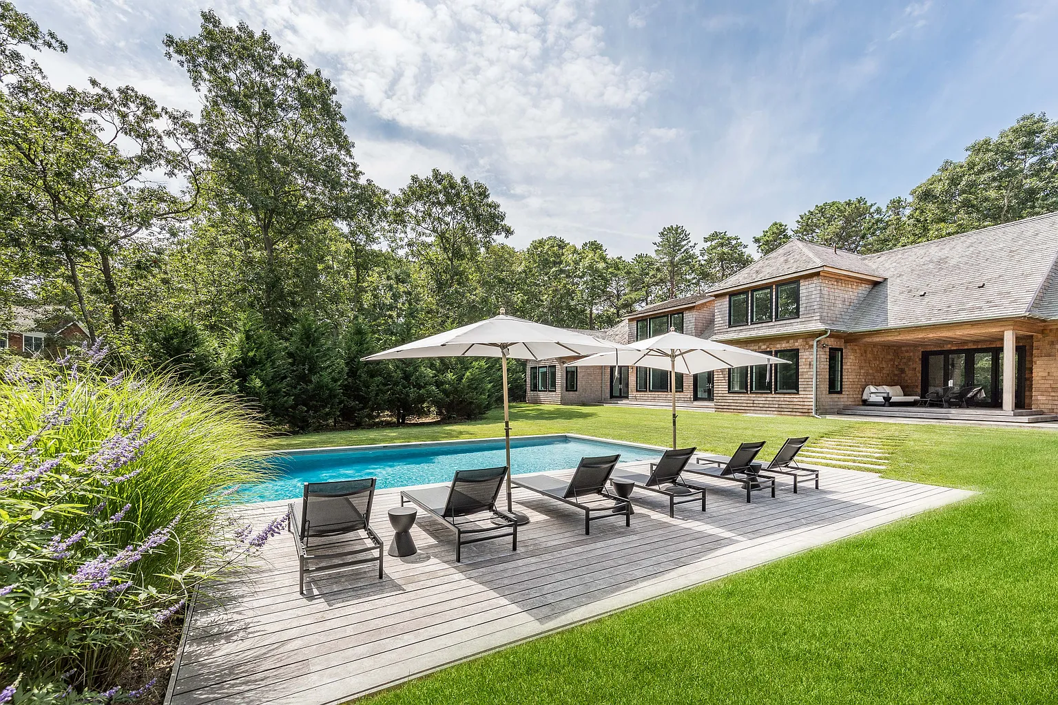 This contemporary new construction, set on 1.5 acres in the desirable East Hampton Village Fringes, is an ideal summer retreat. Spanning 7,600 square feet across three levels, the home features six bedrooms and 6.5 bathrooms, providing ample space for relaxation and entertainment.