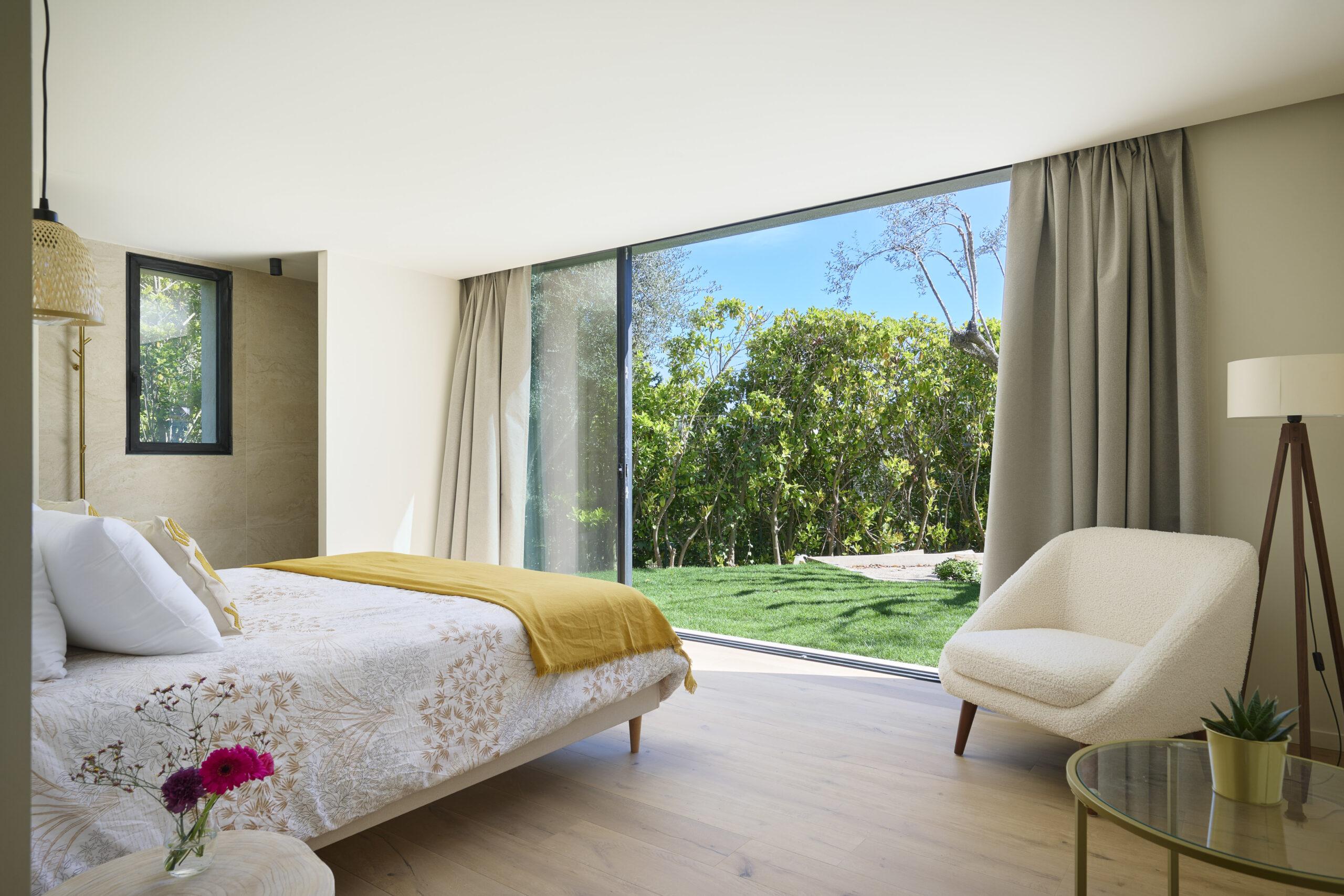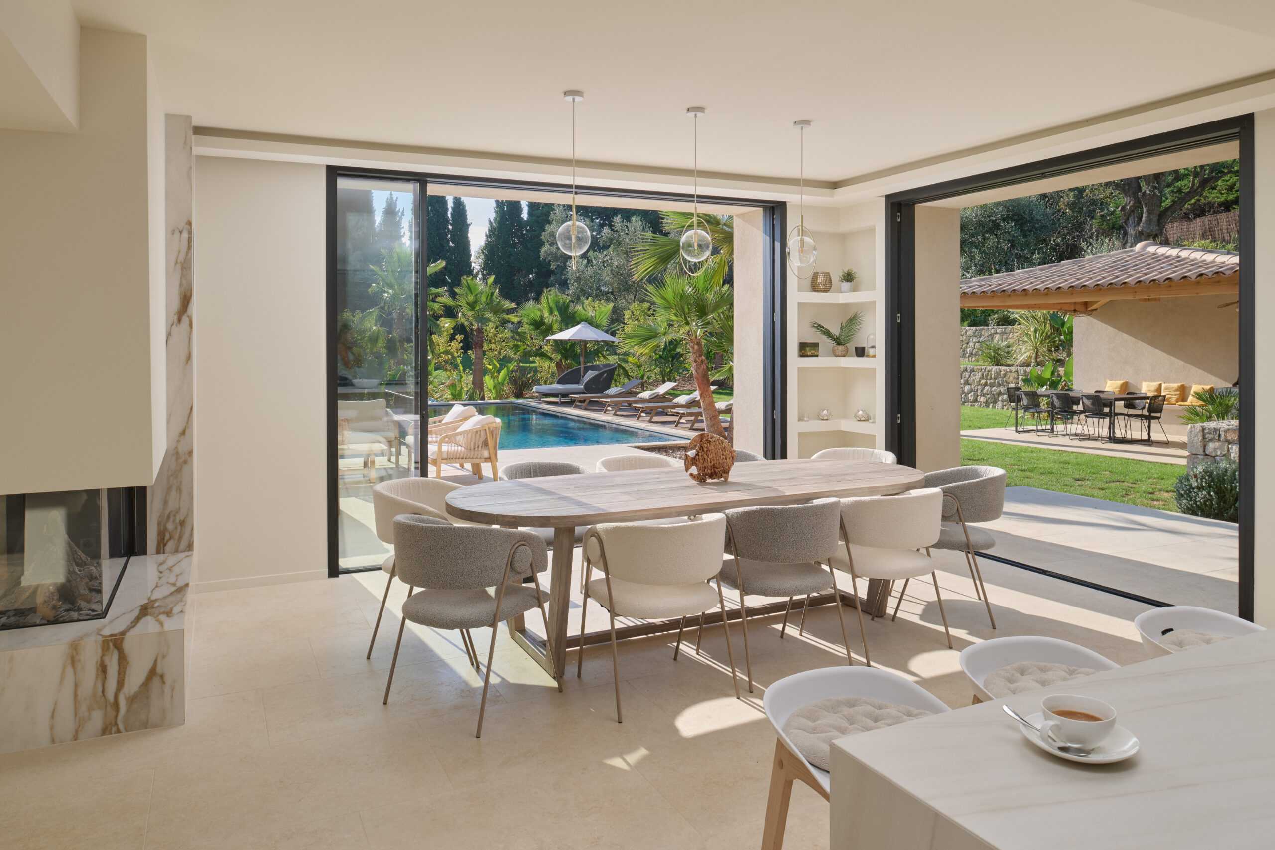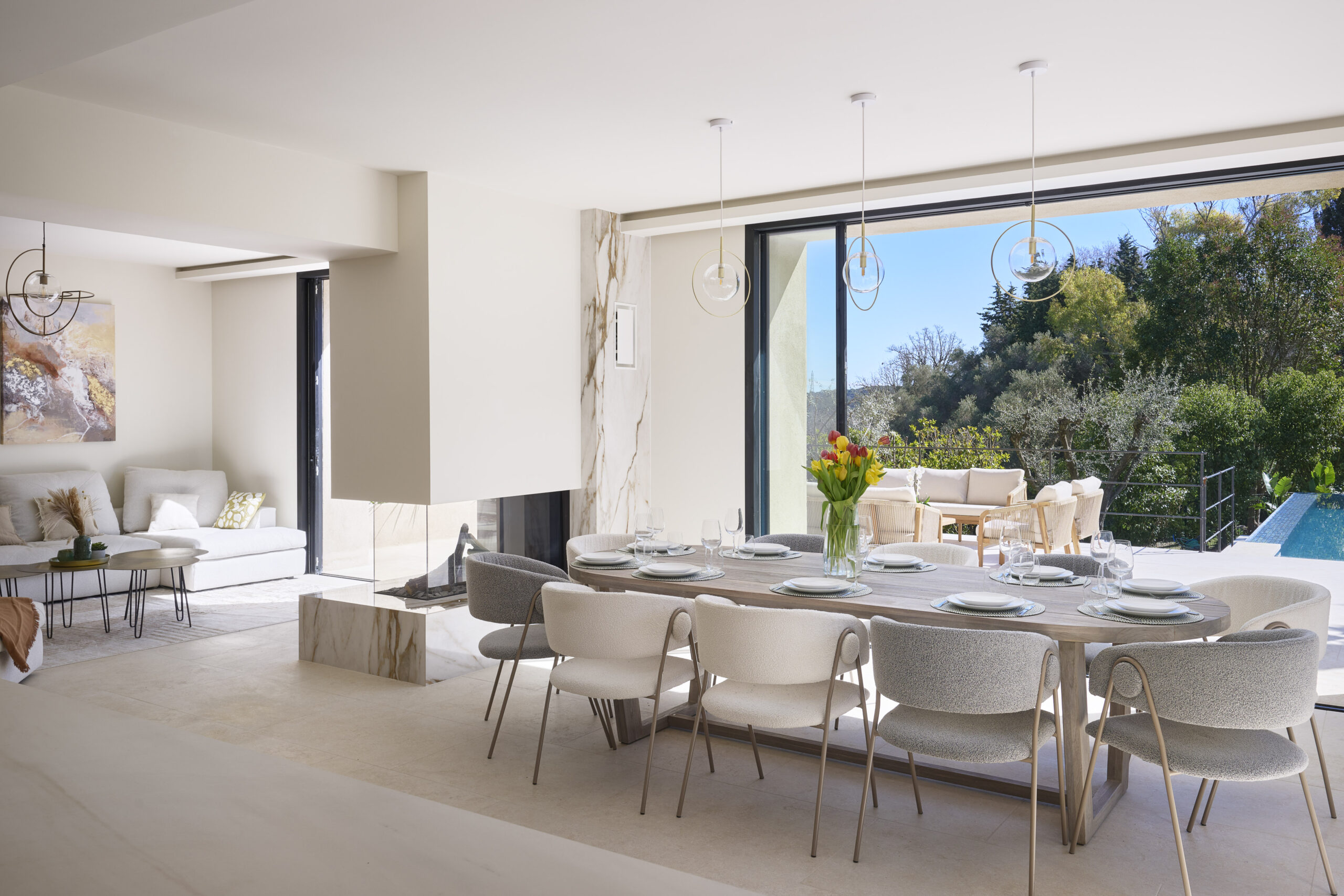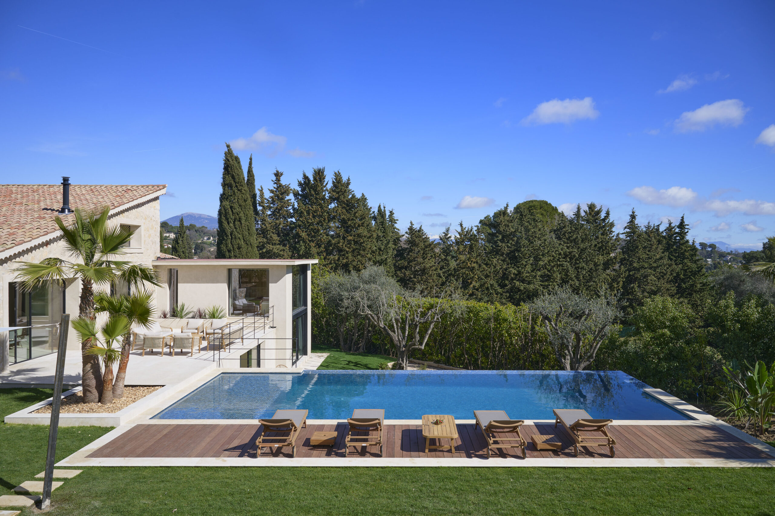 Situated within walking distance of the charming old village of Mougins, this stunning 400m² villa boasts an elegant and minimalist design enhanced by thoughtfully selected contemporary and Provencal decor. The luxurious yet warm atmosphere is complemented by expansive all-height windows that seamlessly connect the indoor living spaces to the outdoors. The property features multiple outdoor living areas, including a terrace, an infinity pool, a pool house, and a pétanque court, all set within a beautifully landscaped garden of approximately 2000m².