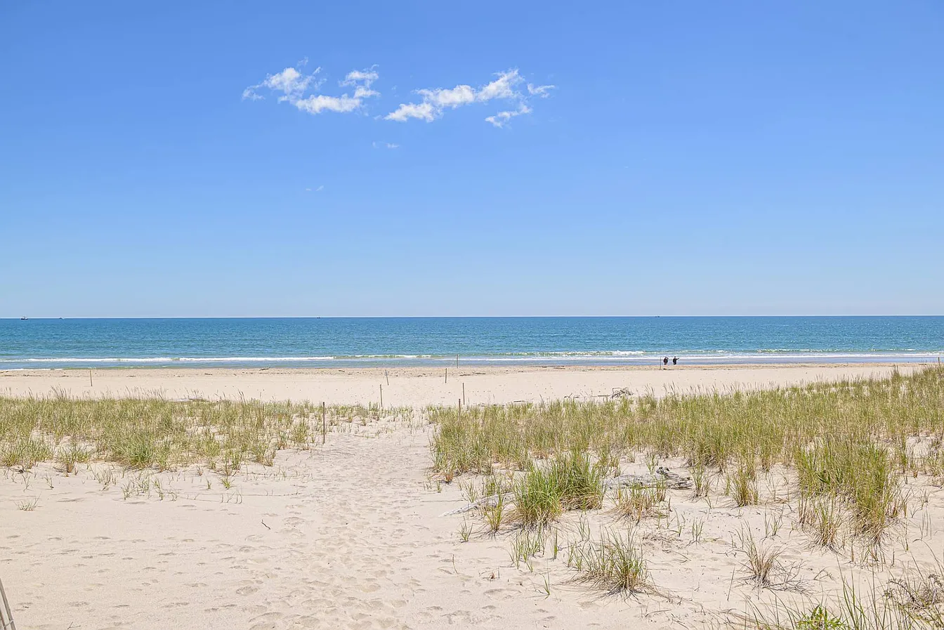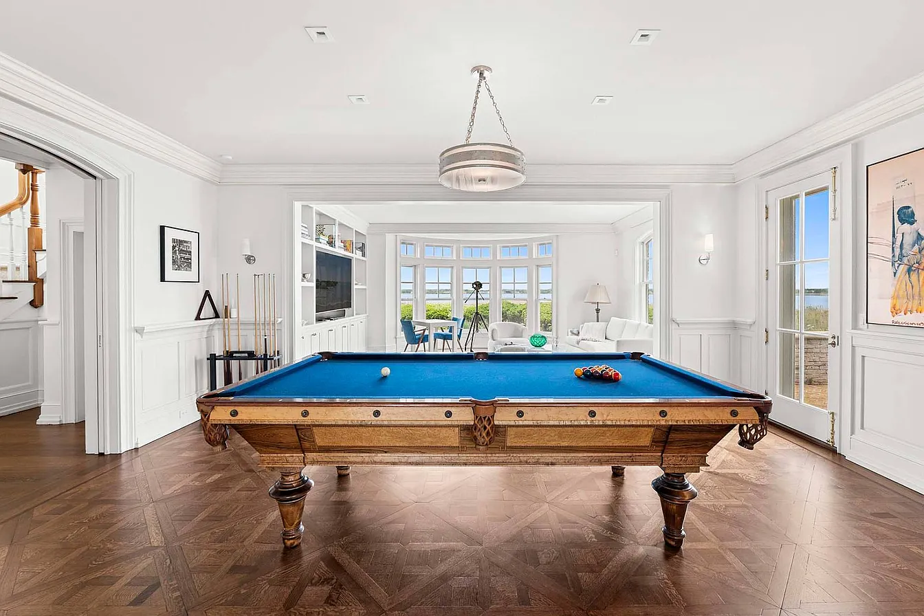 On the ocean side, you’ll find a heated gunite pool and spa, along with both covered and open patios that invite outdoor relaxation. An expansive upper deck overlooks the ocean, while an elevated platform above the dunes is perfect for lounging in the sun. The first-floor living areas encompass a welcoming living room with a fireplace, a billiards and media room, a formal dining room, and an eat-in kitchen equipped with professional-grade appliances and French doors that open to the oceanside deck and pool.