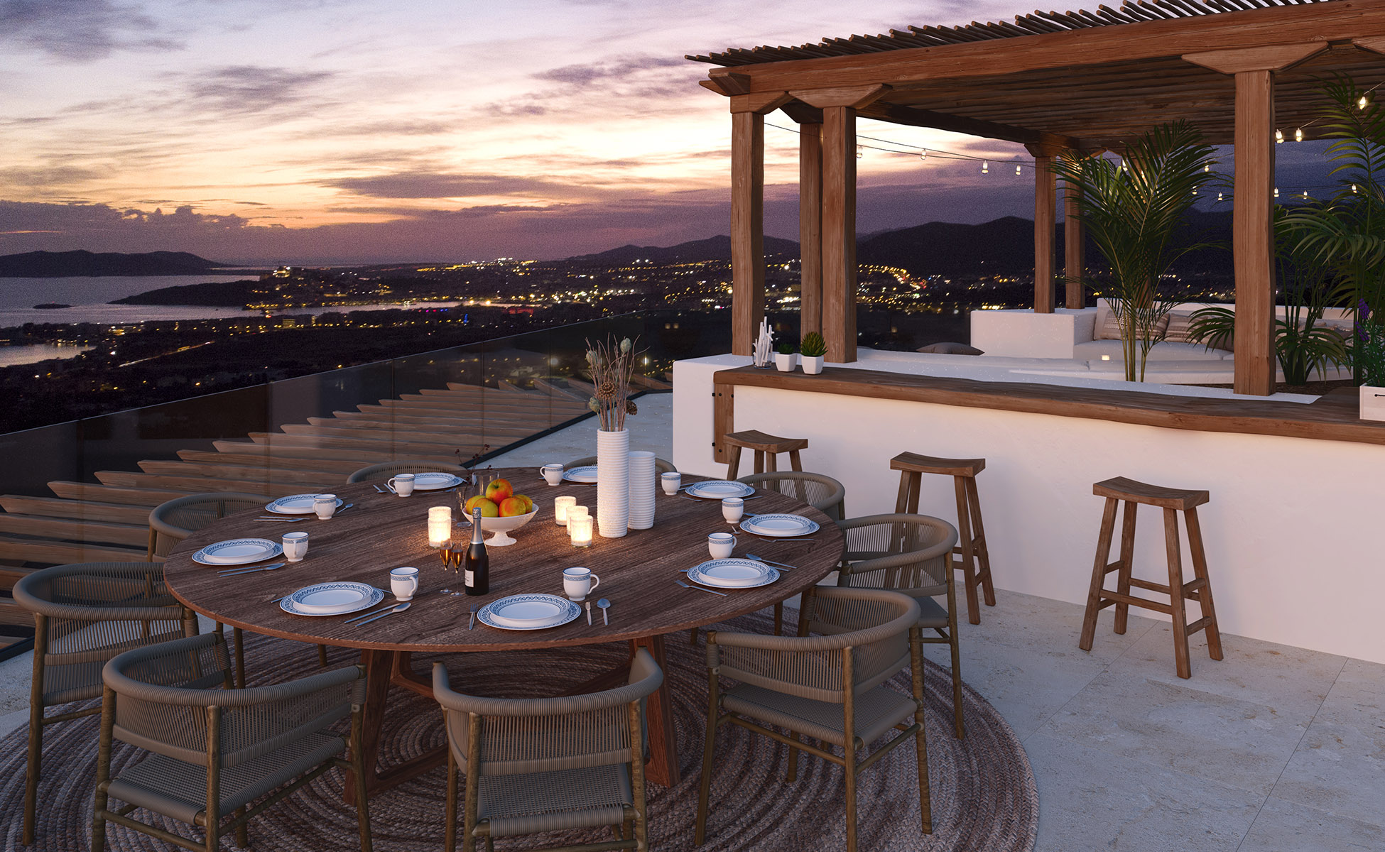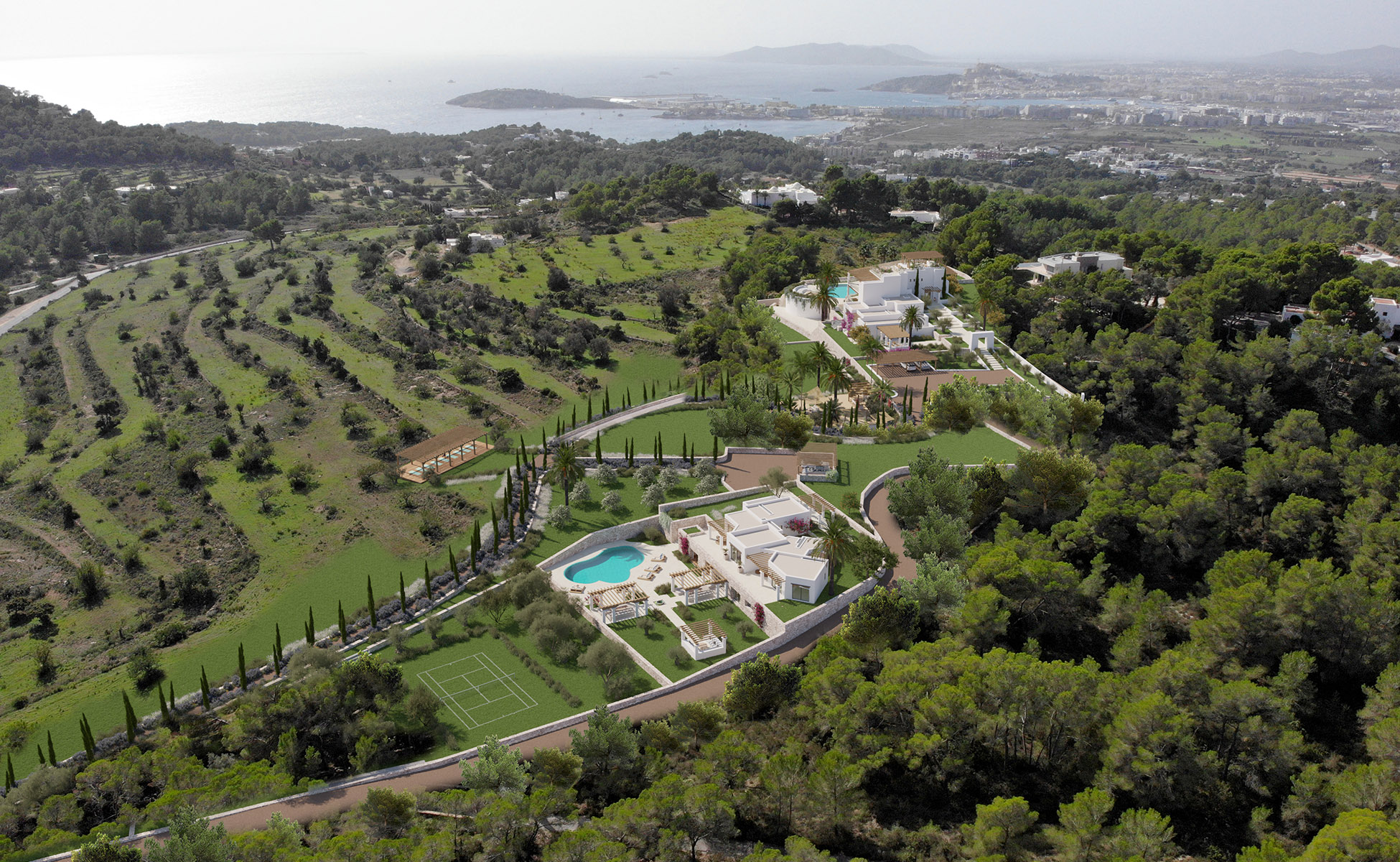 The Estani Villa is nestled in one of the most sought-after areas of Ibiza, providing an unparalleled vantage point above the shimmering Mediterranean Sea. This stunning property boasts breathtaking views of the vibrant city of Ibiza and the historic Dalt Vila Citadel, creating a picturesque backdrop that captures the essence of island living.