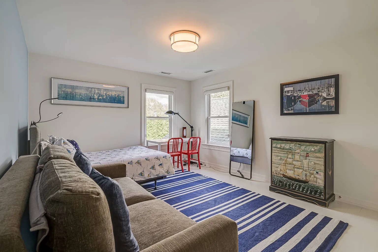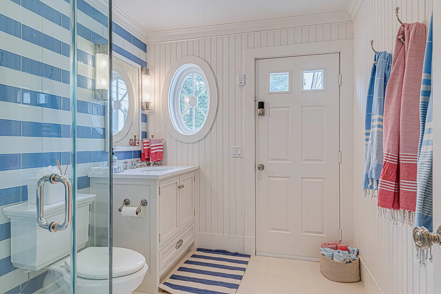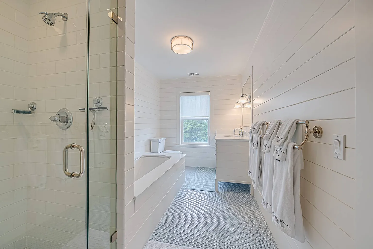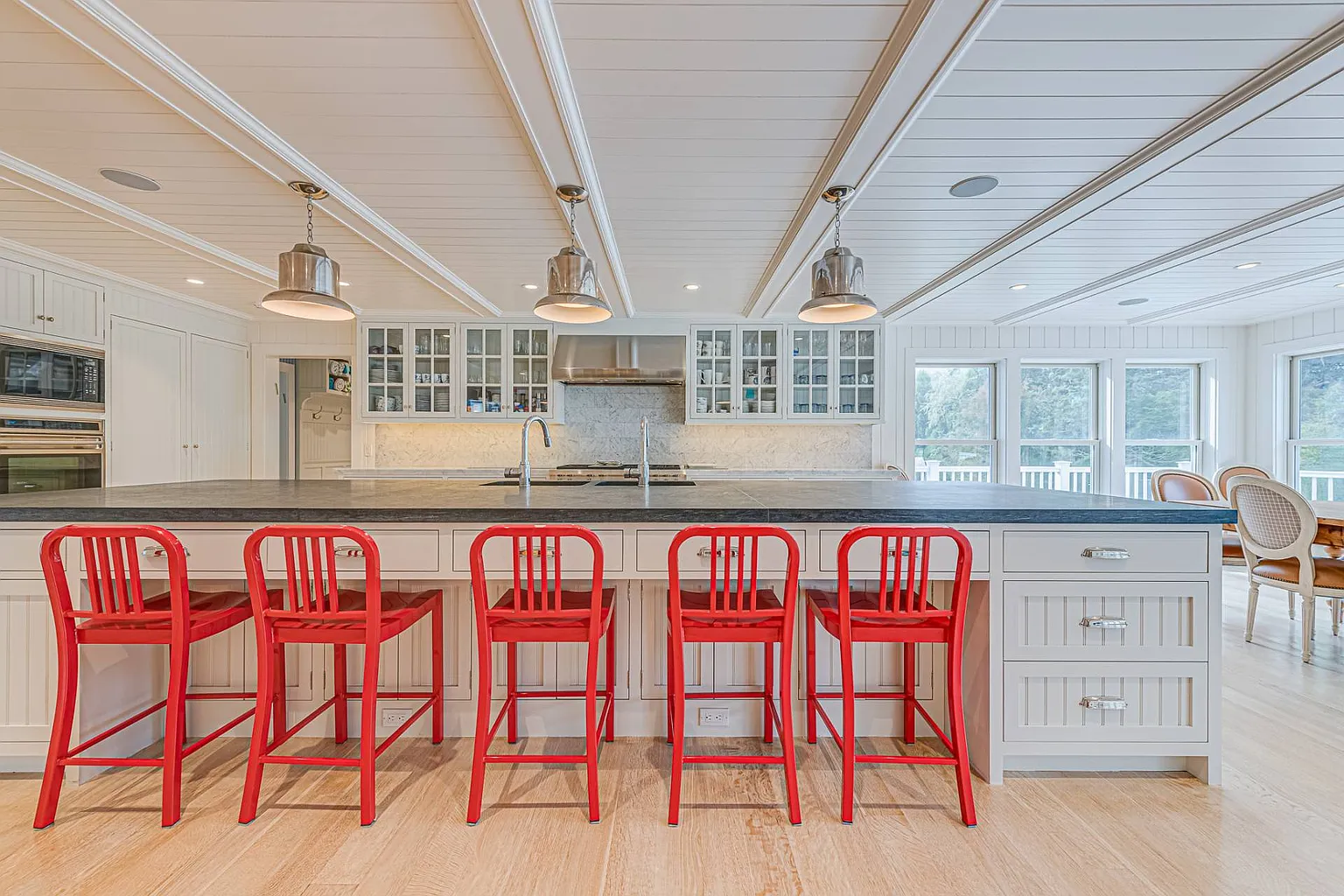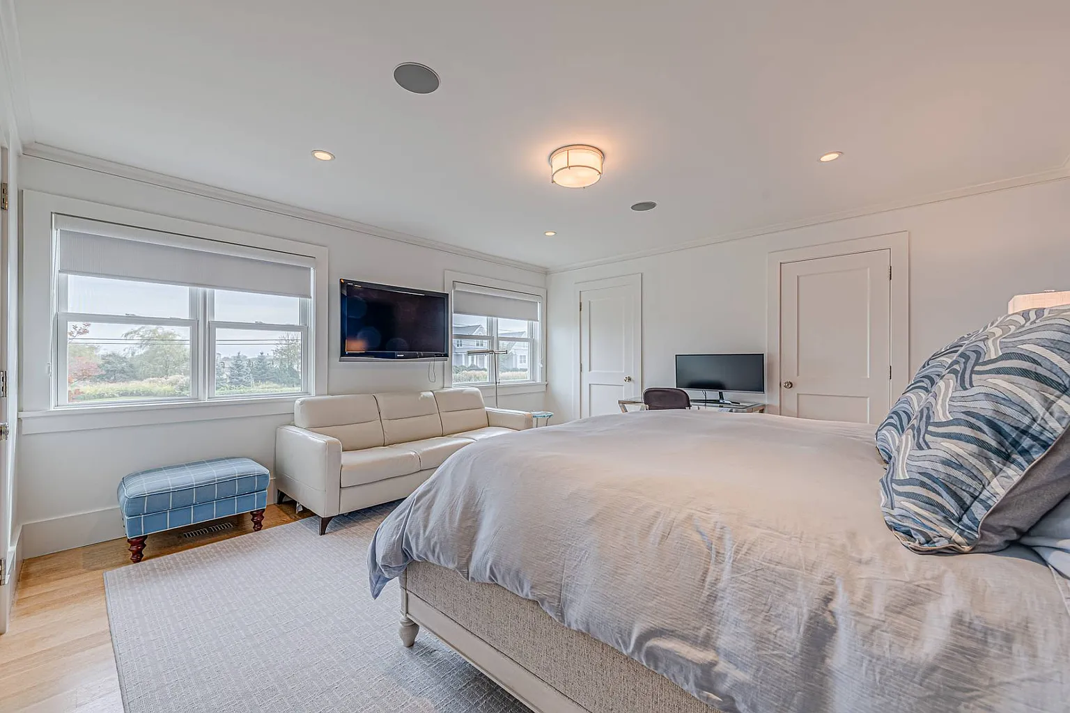 Accommodating family and friends, the home boasts seven bedrooms and six and a half baths. On the first floor, you’ll find a junior master suite with a king bed and water views, along with an additional bedroom featuring a double bed. The luxurious master suite on the second floor includes a king bed and offers breathtaking south-facing views, complemented by a master bath with a steam shower and soaking tub. Additional bedrooms include Bedroom #4 with two queen beds and water views, Bedroom #5 with a queen bed, Bedroom #6 with a king bed, and Bedroom #7 featuring a full bed and a queen sofa bed. Many rooms are equipped with TVs and desks for those needing a workspace, and high-speed ethernet is available throughout the home.