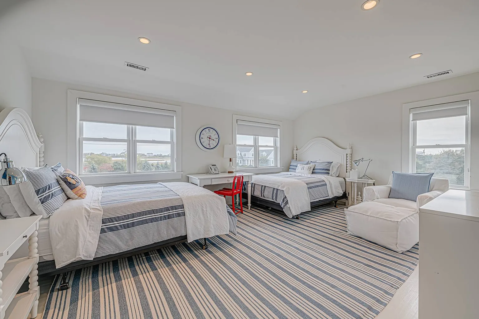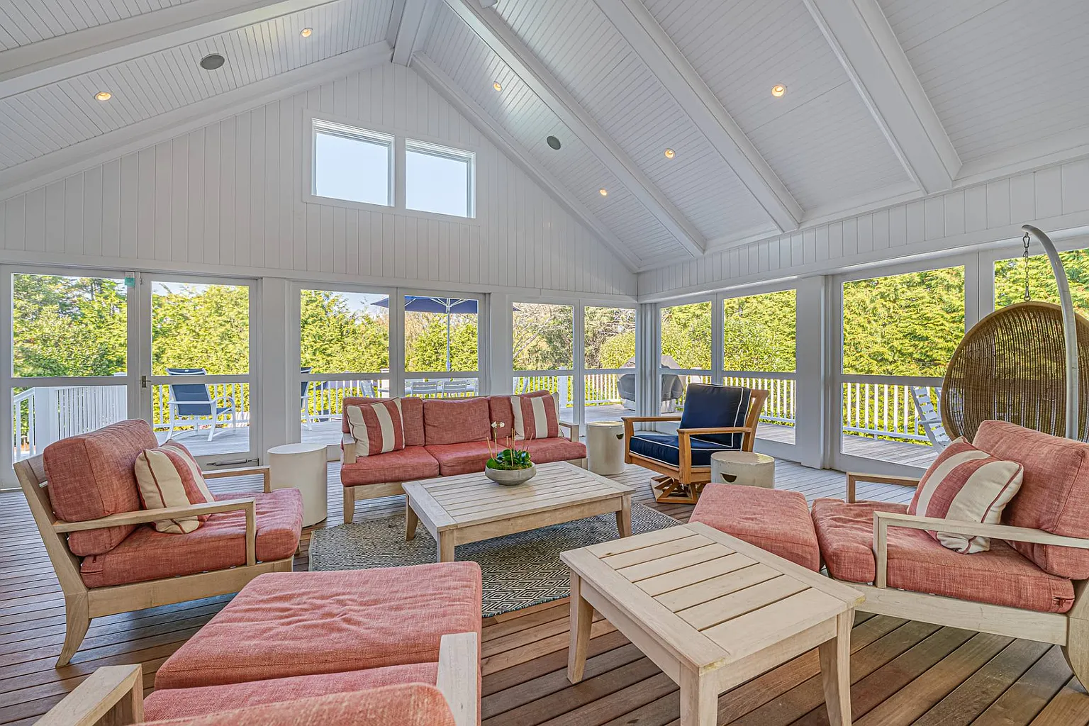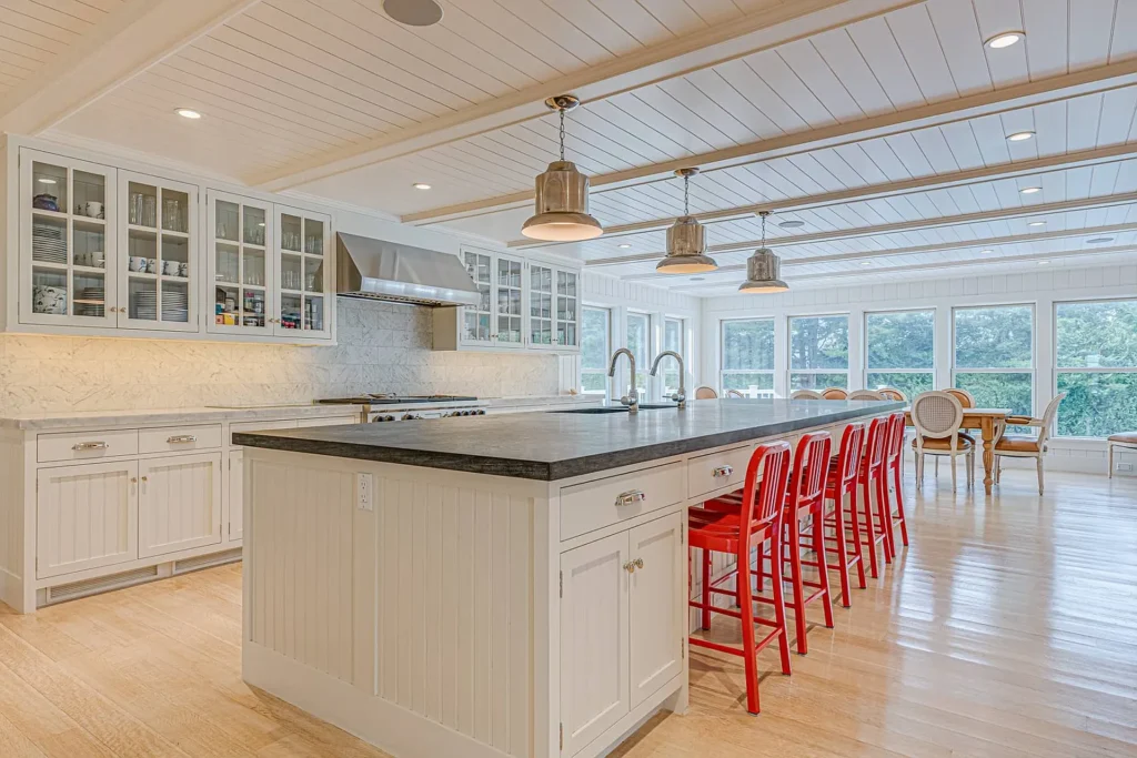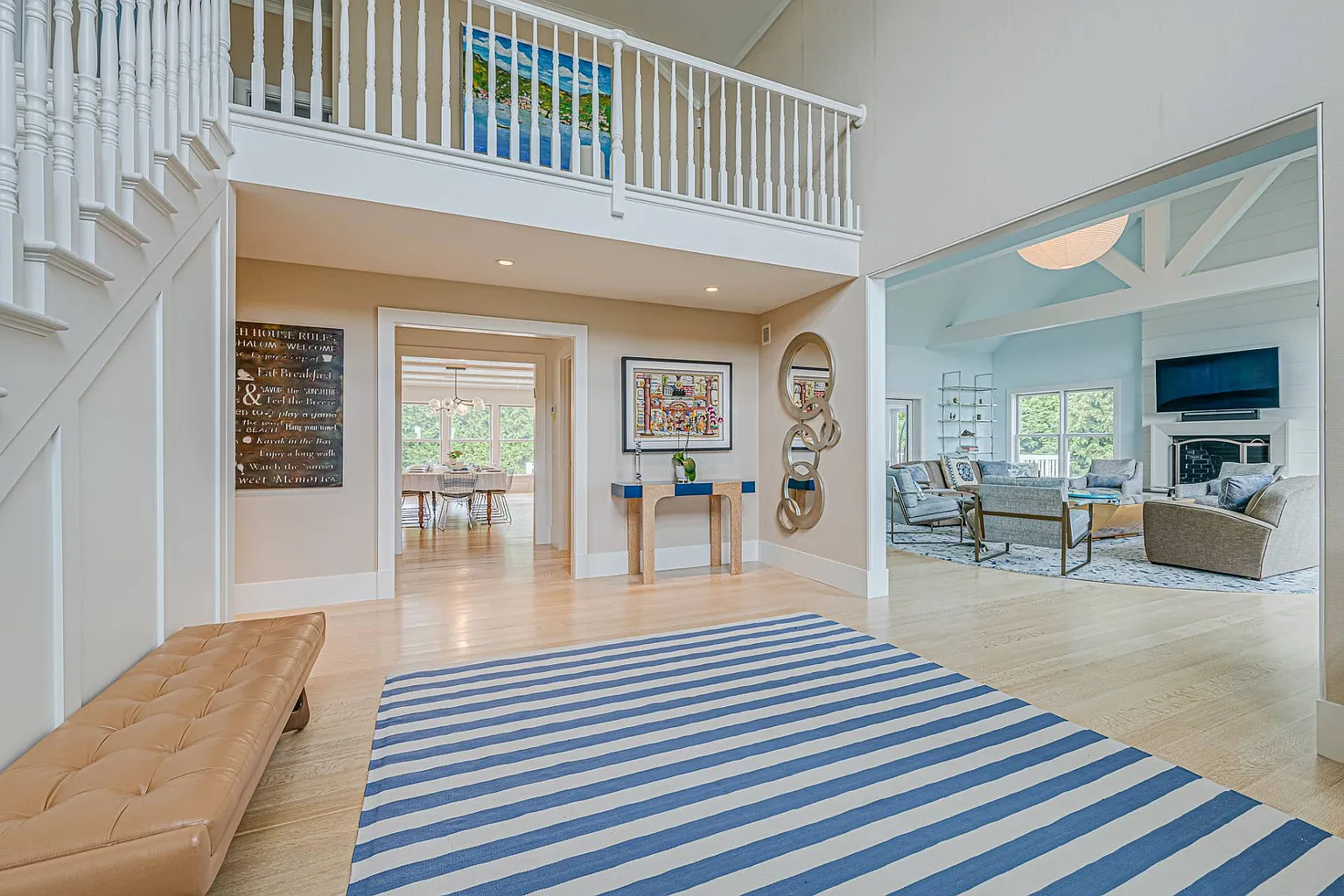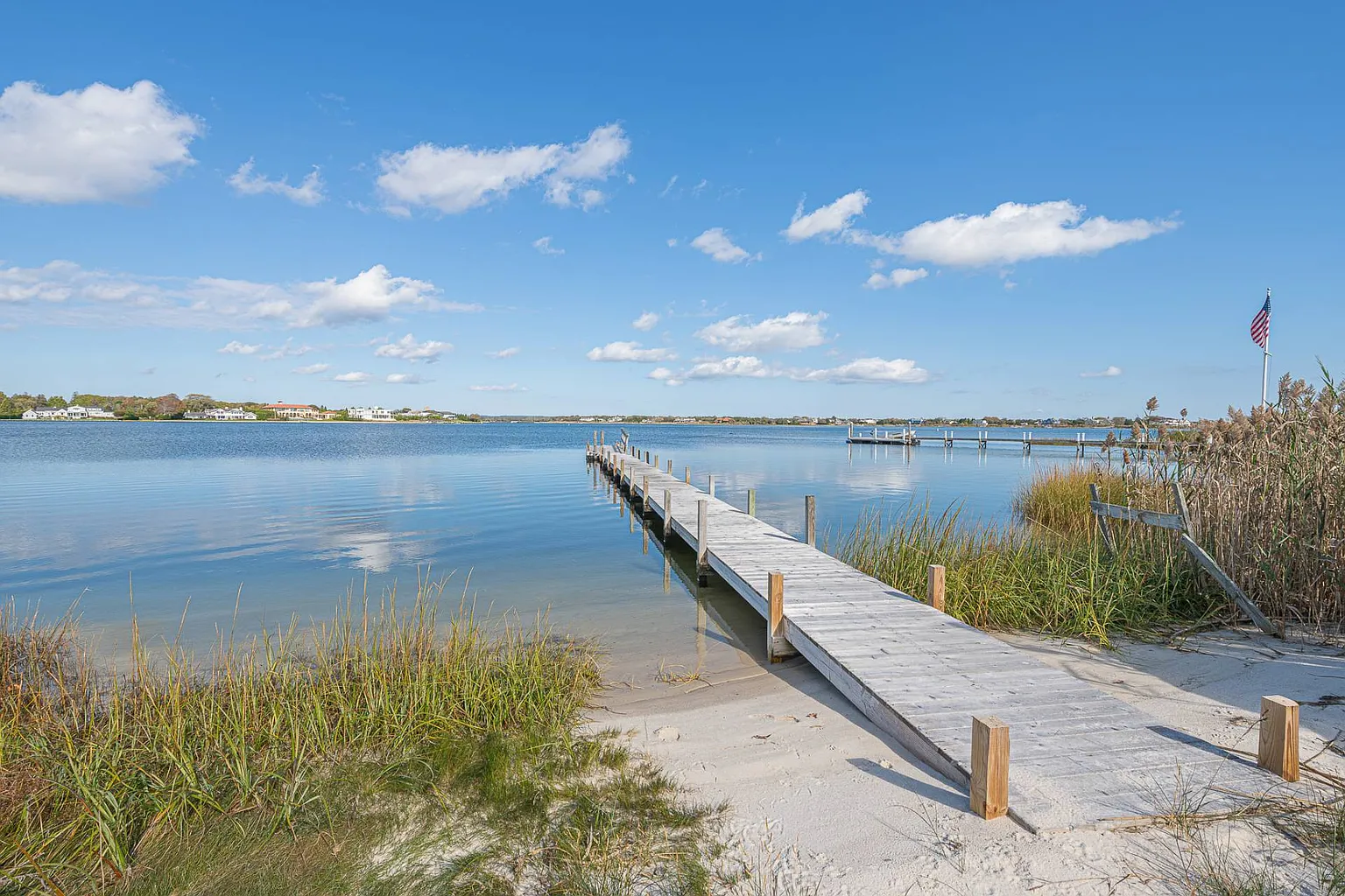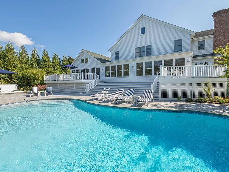 Featuring stunning bay views that extend to Dune Road, this 7,000 sq. ft. summer rental embodies a chic, resort-style atmosphere, complete with all the upscale amenities a discerning guest could desire. The expansive layout is designed for relaxation and entertainment, showcasing a beautifully renovated interior that includes a grand entryway, a spacious living room with a fireplace, and a dining room accommodating over ten guests. The eat-in gourmet kitchen is a chef’s dream, equipped with Wolf appliances, two ovens, a range, a warmer, a wine fridge, and a cooler. For leisure, enjoy the large screened porch with a fun ‘Pop-A-Shot’ basketball game, a media room featuring an oversized screen TV, and a convenient laundry room. Most rooms are outfitted with Sonos speakers for an enhanced audio experience.