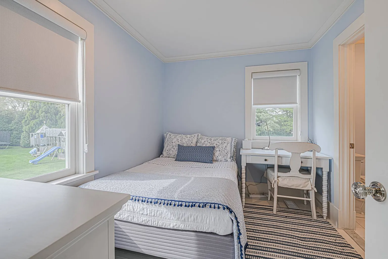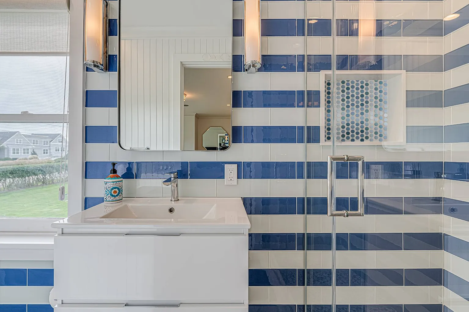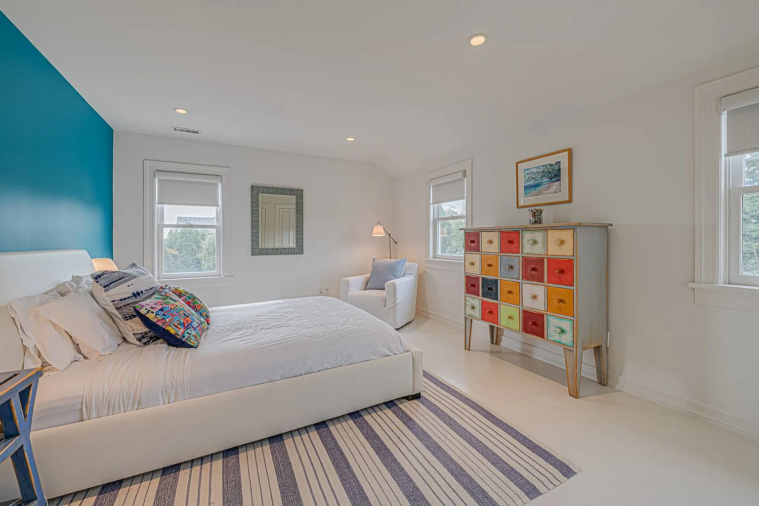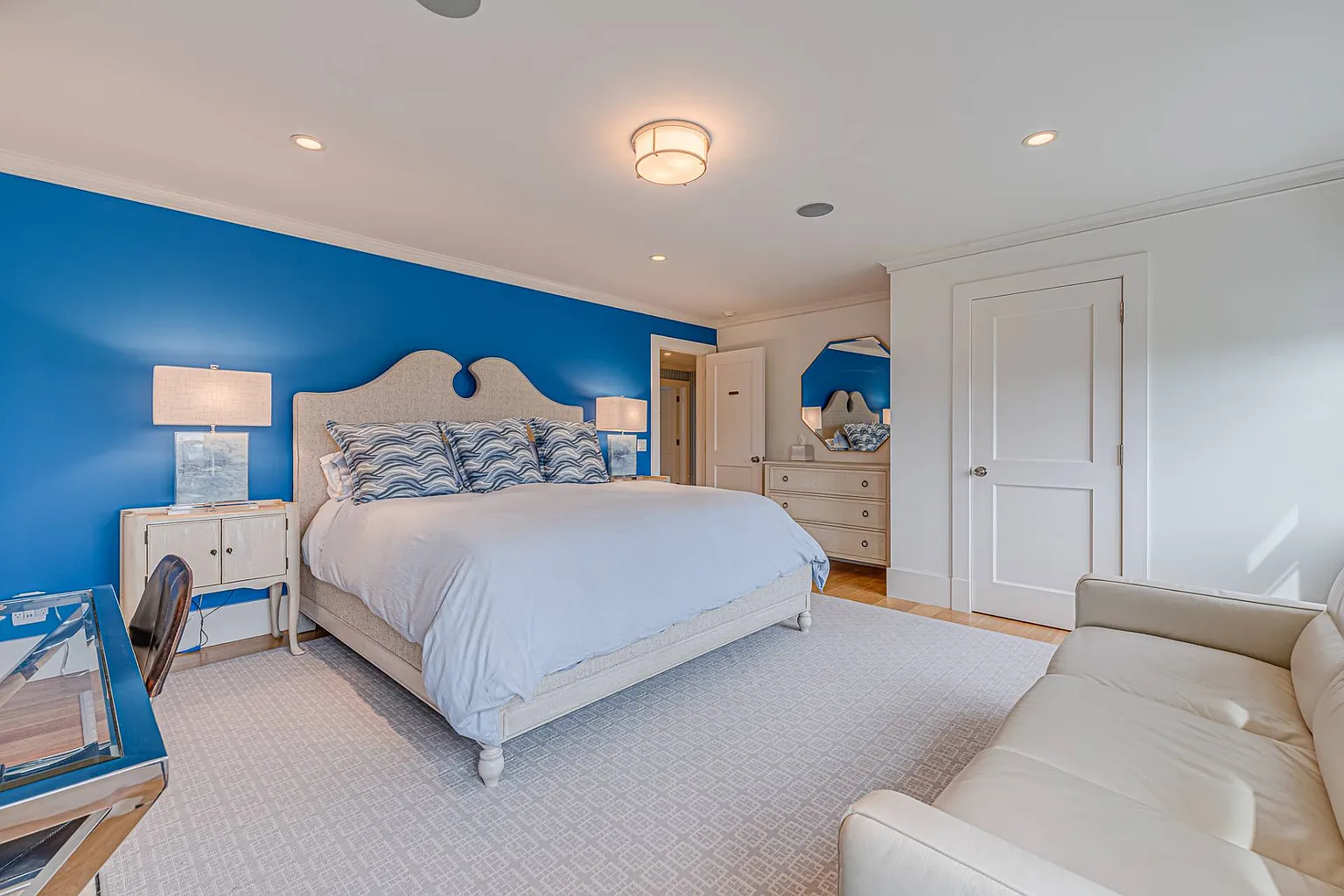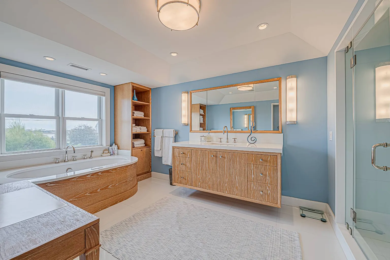 Featuring stunning bay views that extend to Dune Road, this 7,000 sq. ft. summer rental embodies a chic, resort-style atmosphere, complete with all the upscale amenities a discerning guest could desire. The expansive layout is designed for relaxation and entertainment, showcasing a beautifully renovated interior that includes a grand entryway, a spacious living room with a fireplace, and a dining room accommodating over ten guests. The eat-in gourmet kitchen is a chef’s dream, equipped with Wolf appliances, two ovens, a range, a warmer, a wine fridge, and a cooler. For leisure, enjoy the large screened porch with a fun ‘Pop-A-Shot’ basketball game, a media room featuring an oversized screen TV, and a convenient laundry room. Most rooms are outfitted with Sonos speakers for an enhanced audio experience.