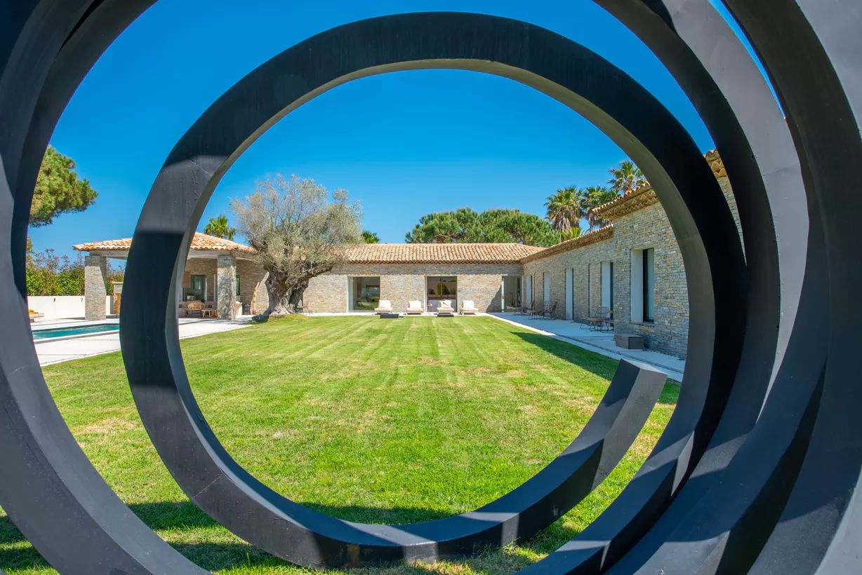 Nestled among towering Roman pines, the villa’s elegant L-shaped façade is beautifully outlined by rustic stone walls and charming pink-tiled roofs. Inside, the décor effortlessly blends modern sophistication with playful touches inspired by pop art and contemporary design. Bold Roy Lichtenstein prints sit alongside whimsical animal figurines and vibrant cushions, creating an inviting space full of personality. The crisp white walls, classic tiled floors, and sleek surfaces evoke a cool, monochromatic calm—offering a perfect retreat from the summer heat—while bursts of lively green and turquoise add refreshing pops of color throughout.