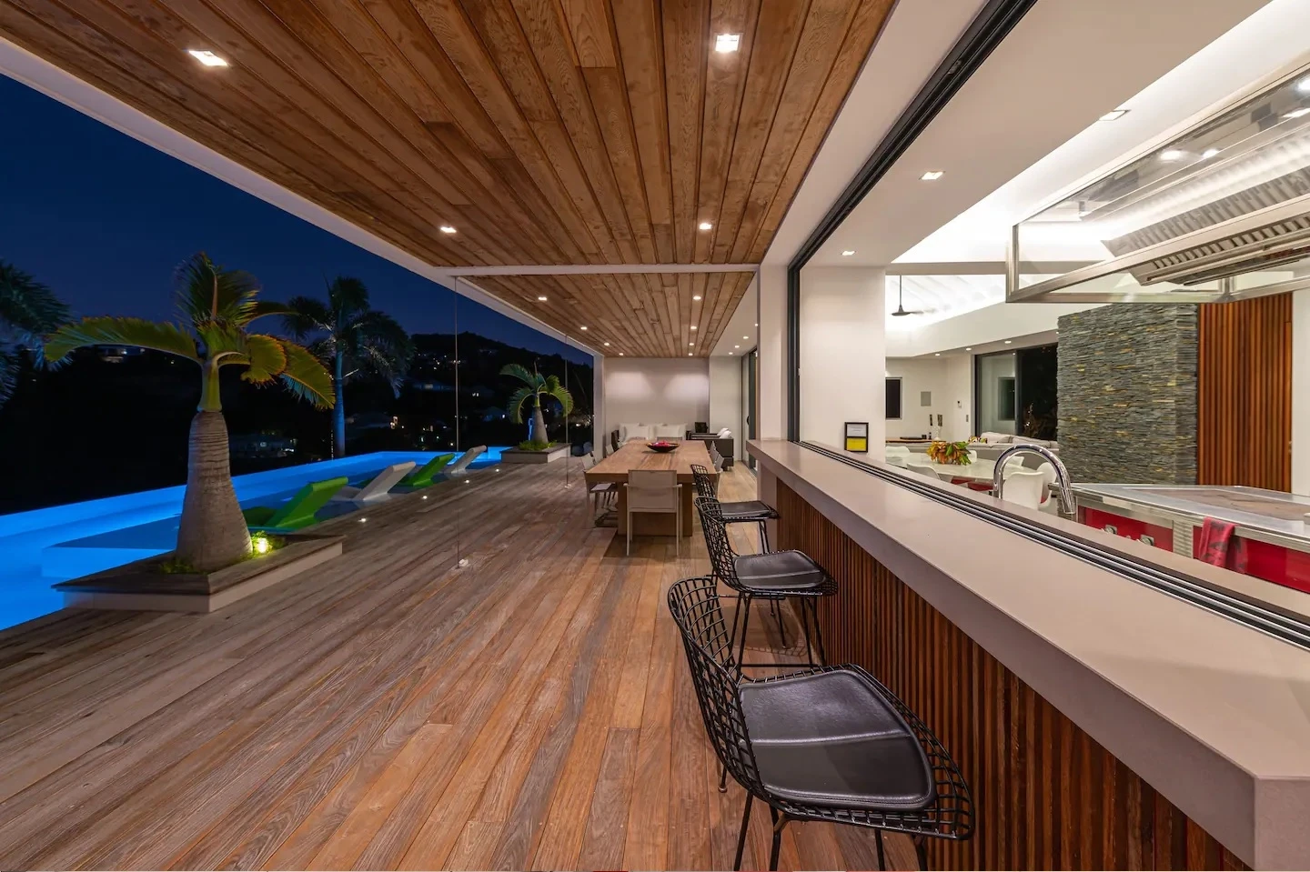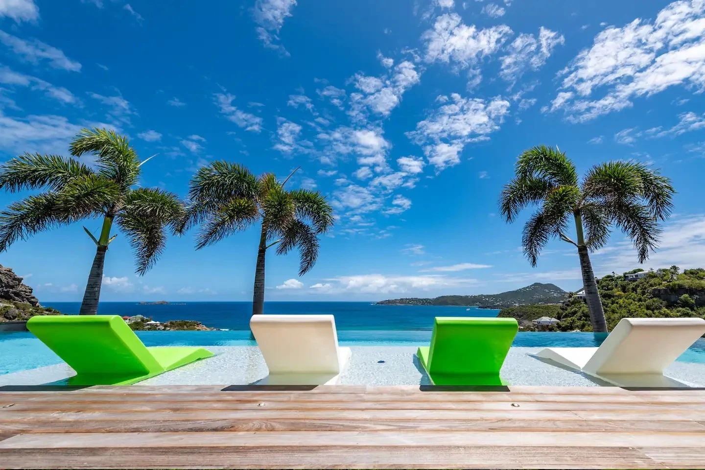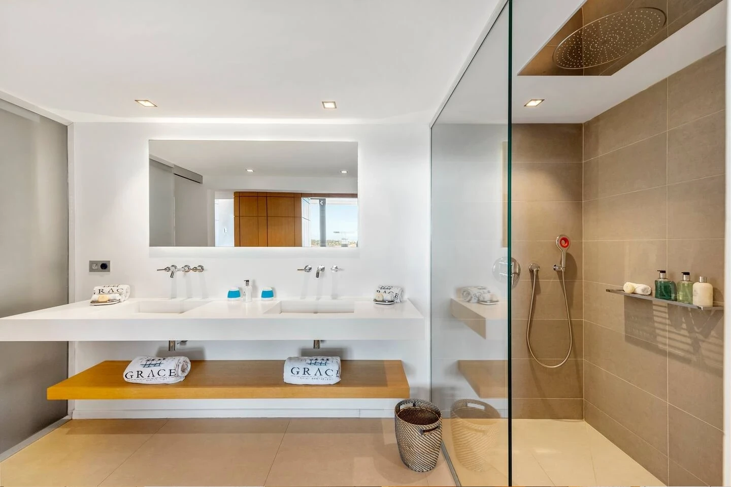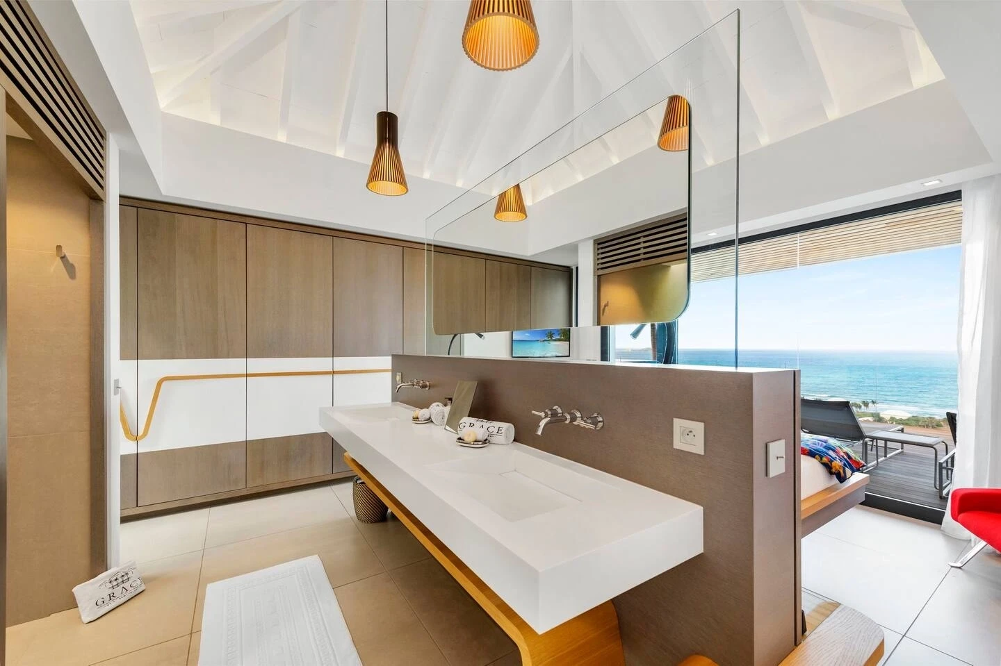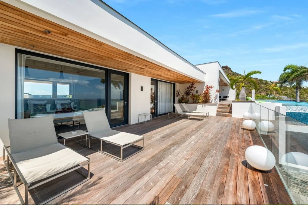 At the front, the terrace shows the breathtakingly beautiful ocean view. The heated infinity swimming pool sparkles as the turquoise waters of St. Barth. You’ll love the loungers set up in a shallow part of the pool, a perfect place to enjoy the refined beauty of The Grace Villa. Tall palm trees are planted around the pool, making the horizon even more beautiful with their chiseled shapes, while the sky reveals the glow of the island’s sun.
