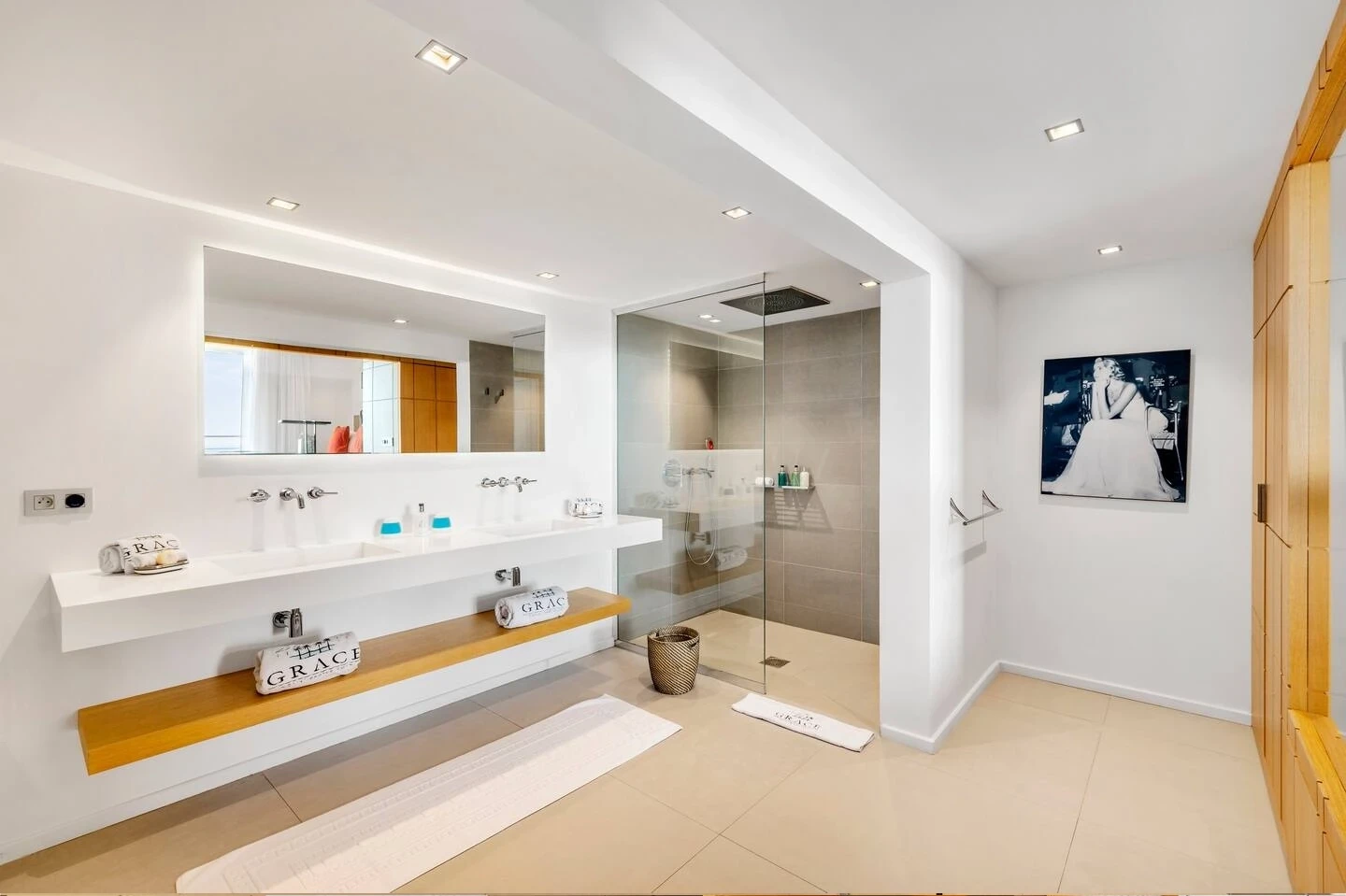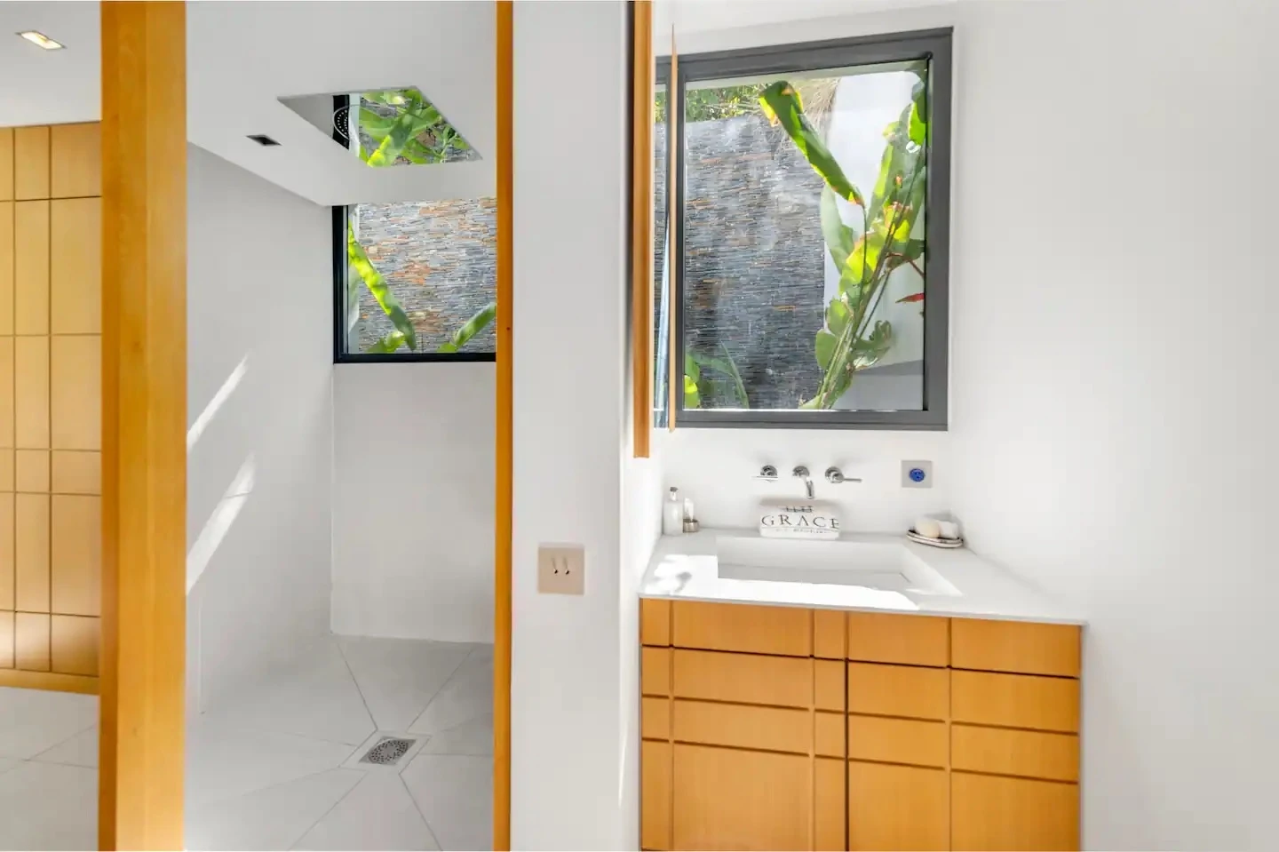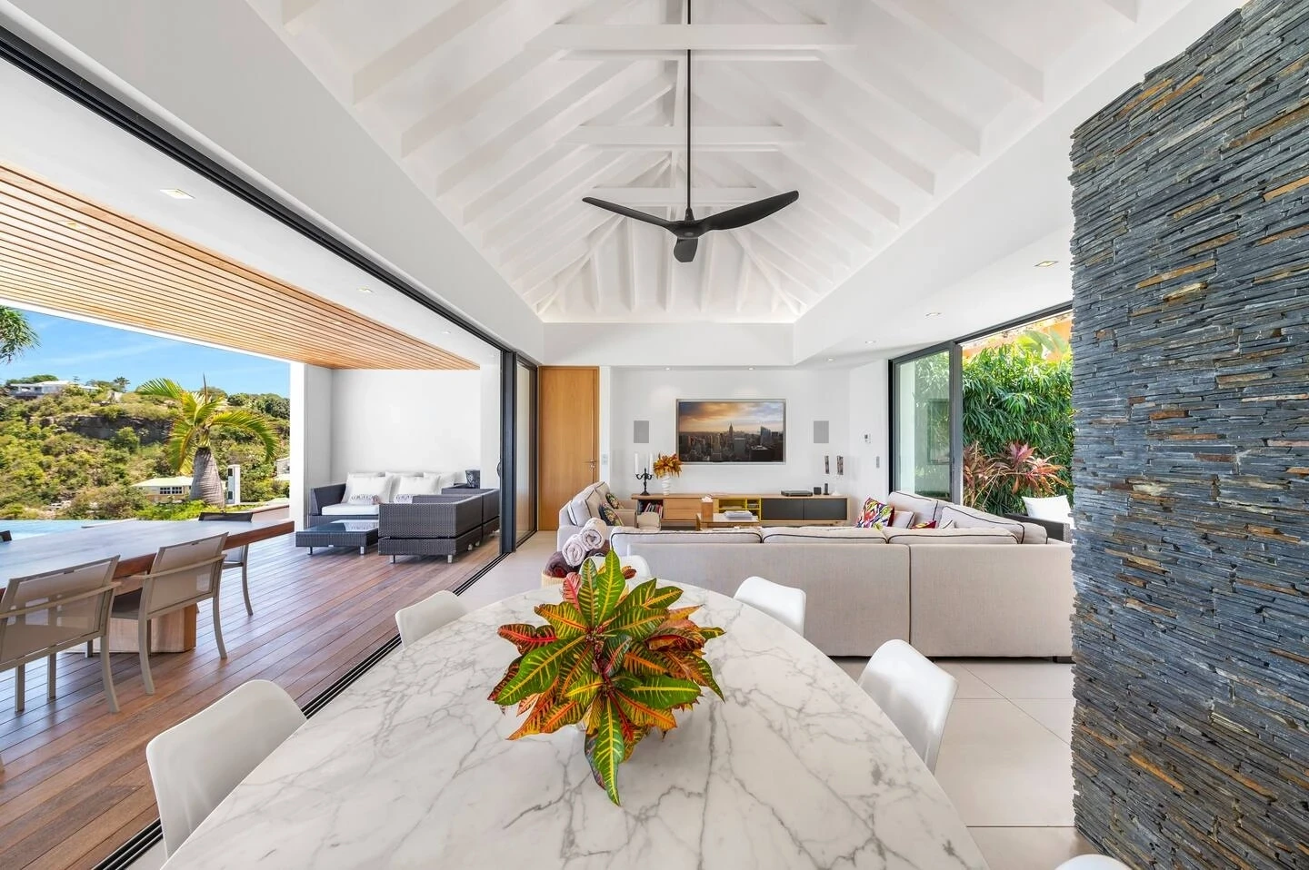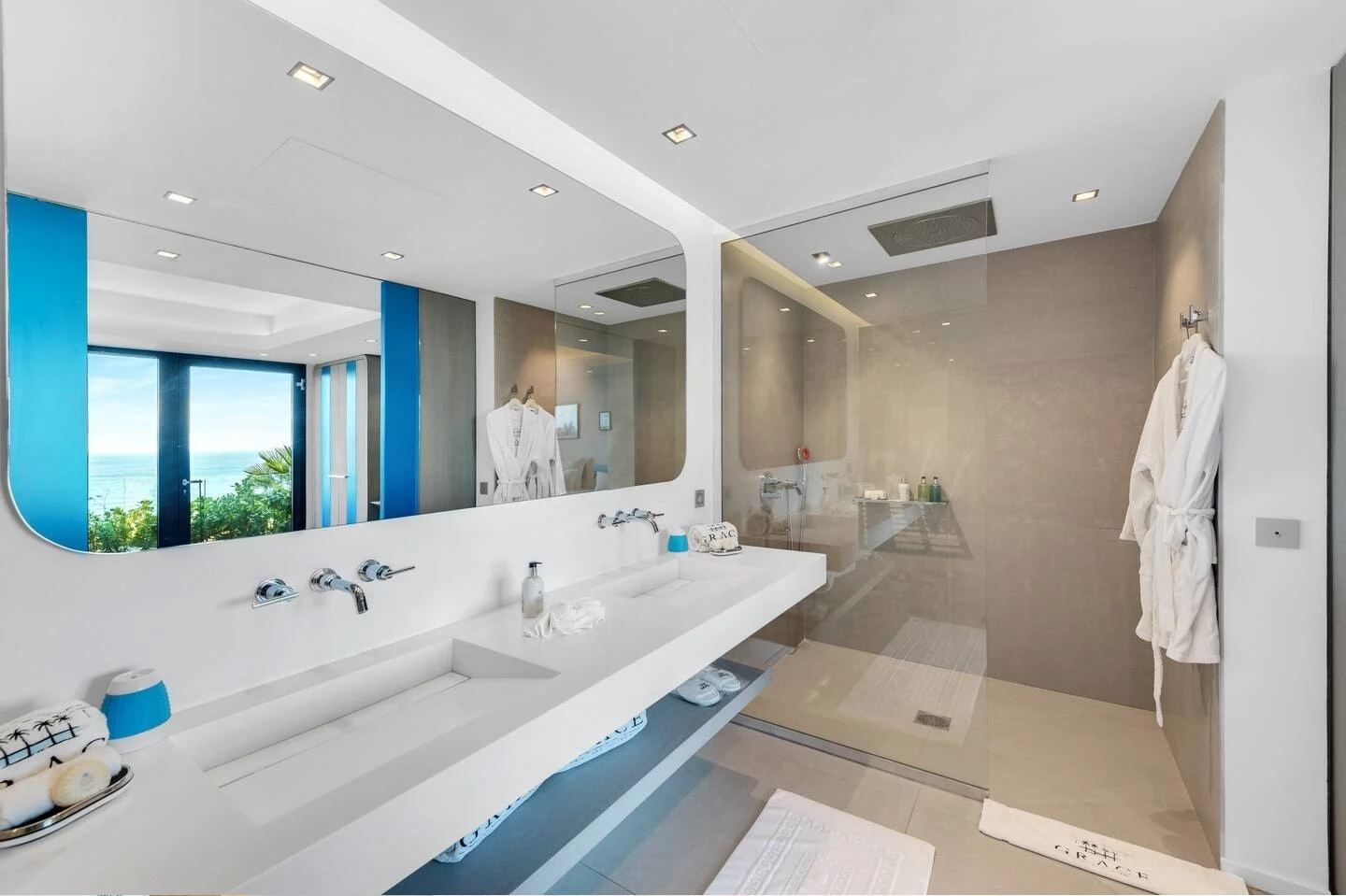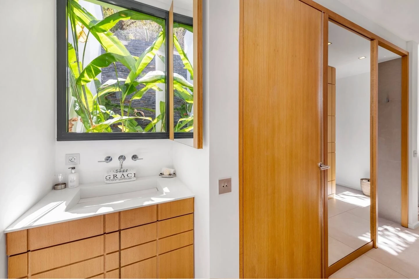 At the front, the terrace shows the breathtakingly beautiful ocean view. The heated infinity swimming pool sparkles as the turquoise waters of St. Barth. You’ll love the loungers set up in a shallow part of the pool, a perfect place to enjoy the refined beauty of The Grace Villa. Tall palm trees are planted around the pool, making the horizon even more beautiful with their chiseled shapes, while the sky reveals the glow of the island’s sun.