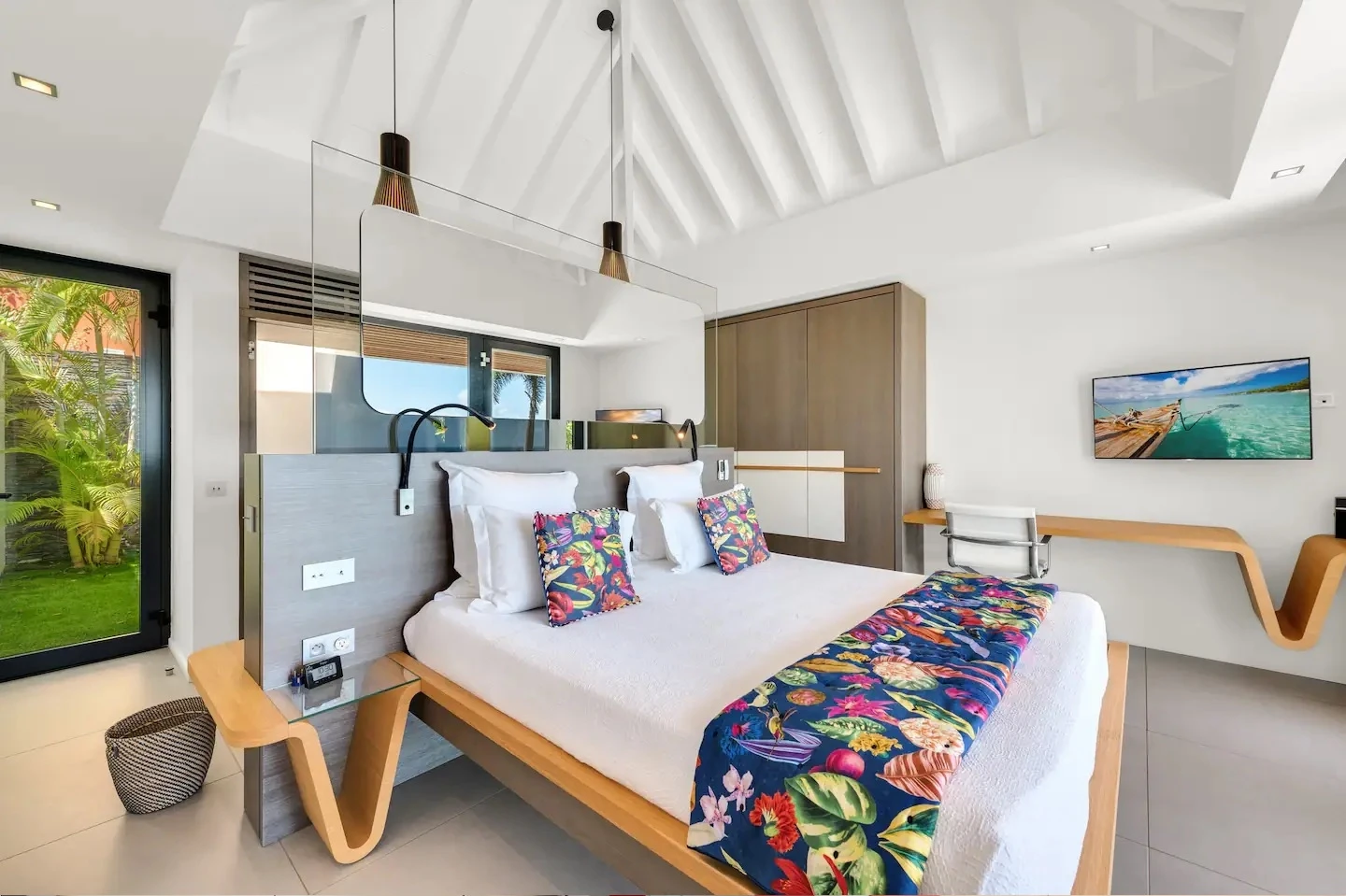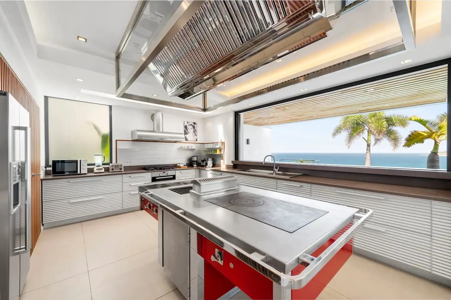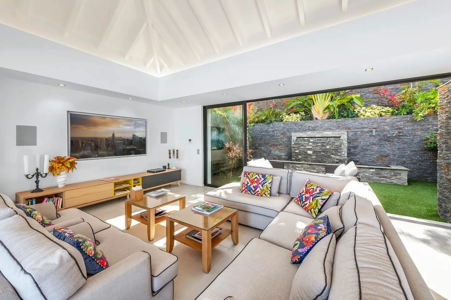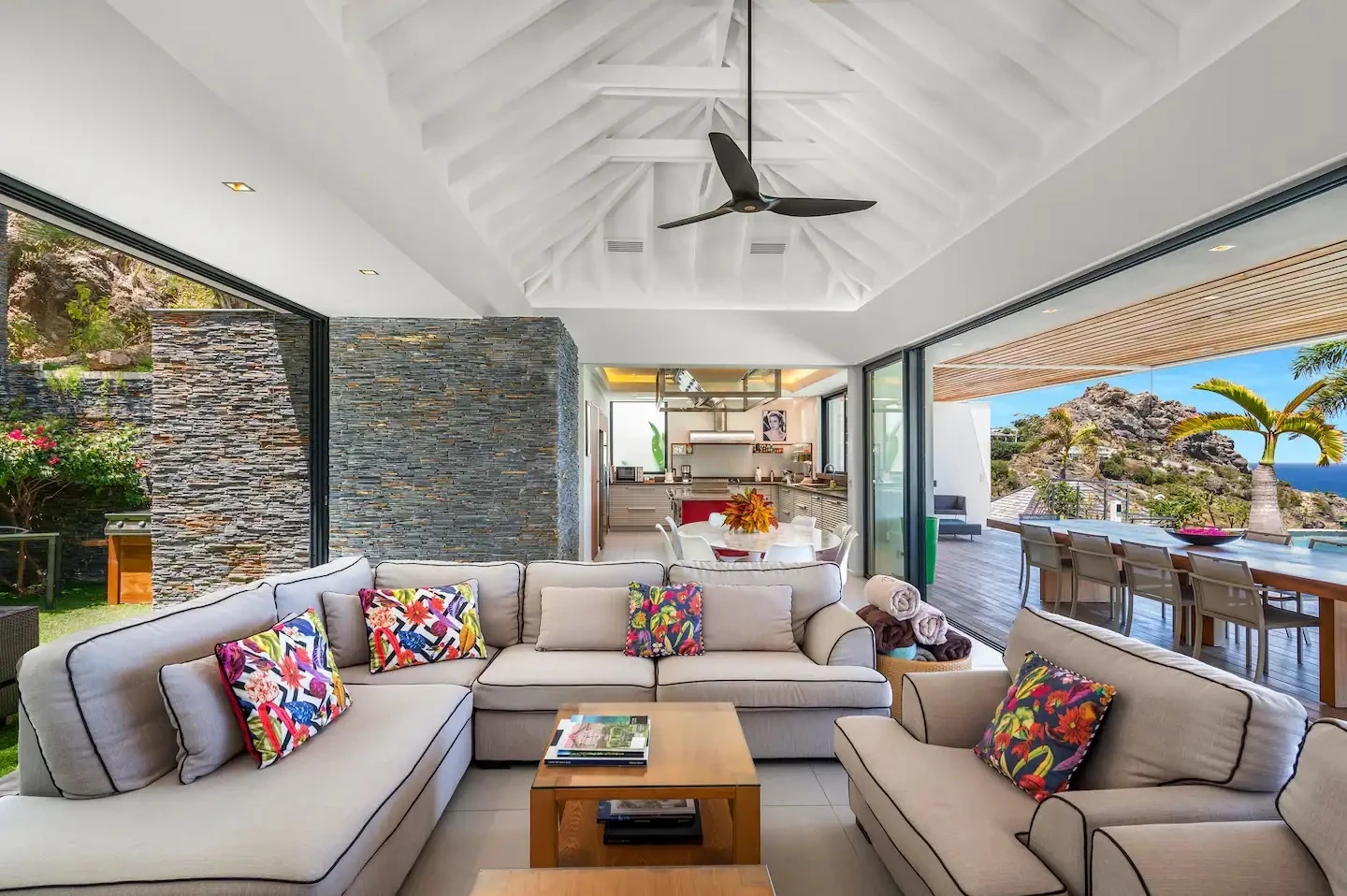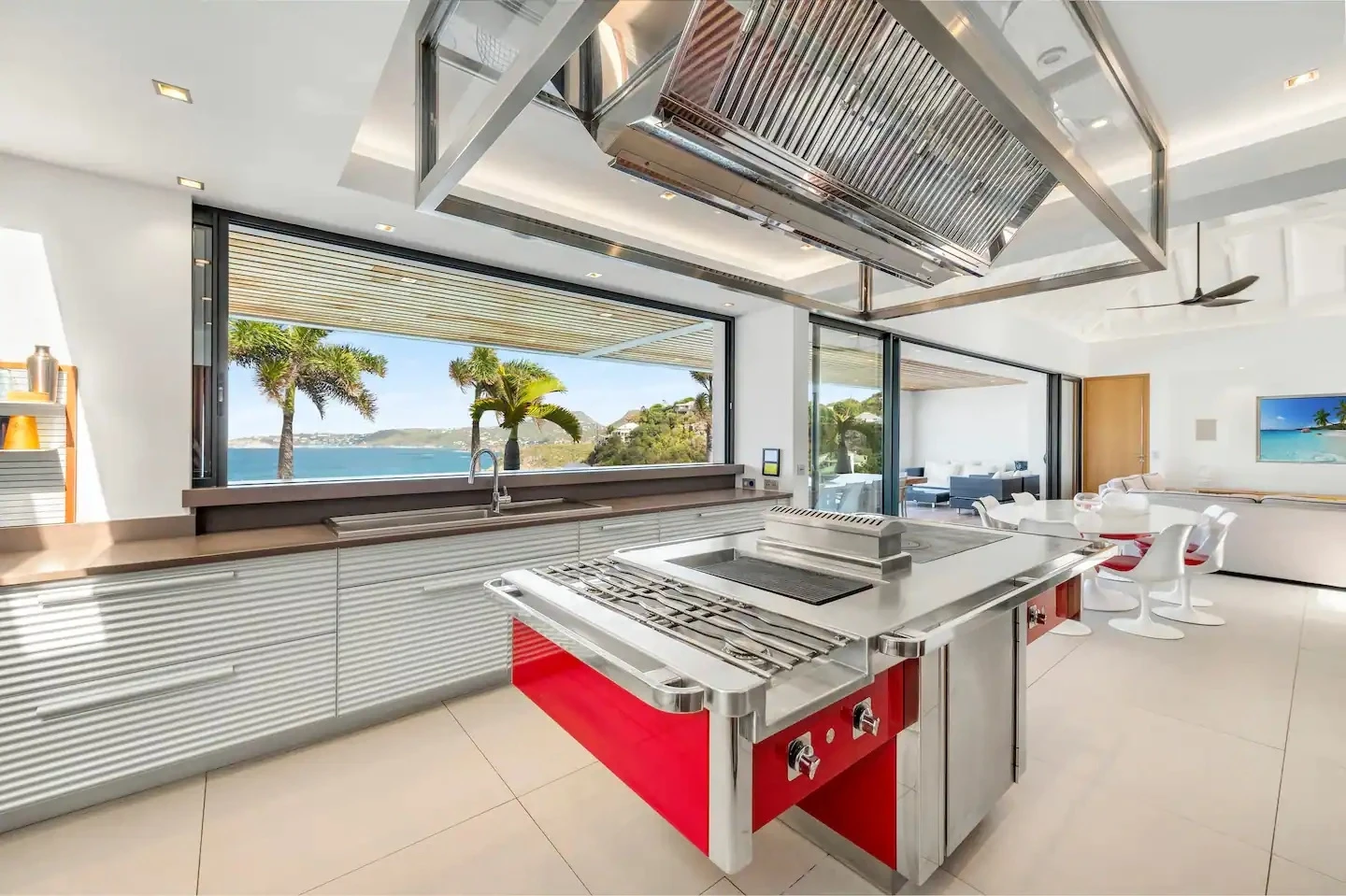 At the front, the terrace shows the breathtakingly beautiful ocean view. The heated infinity swimming pool sparkles as the turquoise waters of St. Barth. You’ll love the loungers set up in a shallow part of the pool, a perfect place to enjoy the refined beauty of The Grace Villa. Tall palm trees are planted around the pool, making the horizon even more beautiful with their chiseled shapes, while the sky reveals the glow of the island’s sun.
