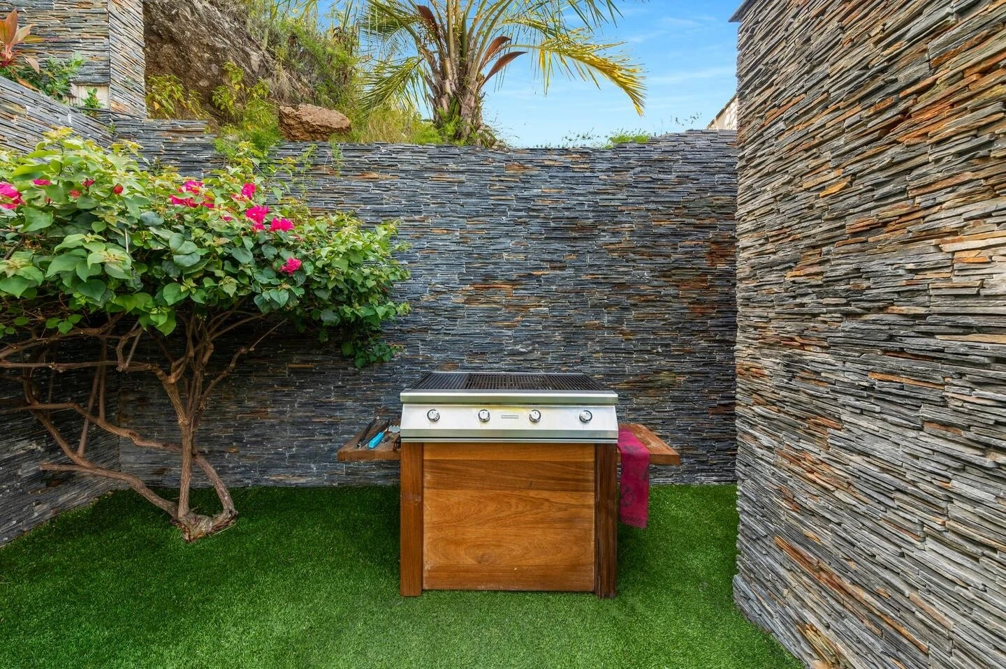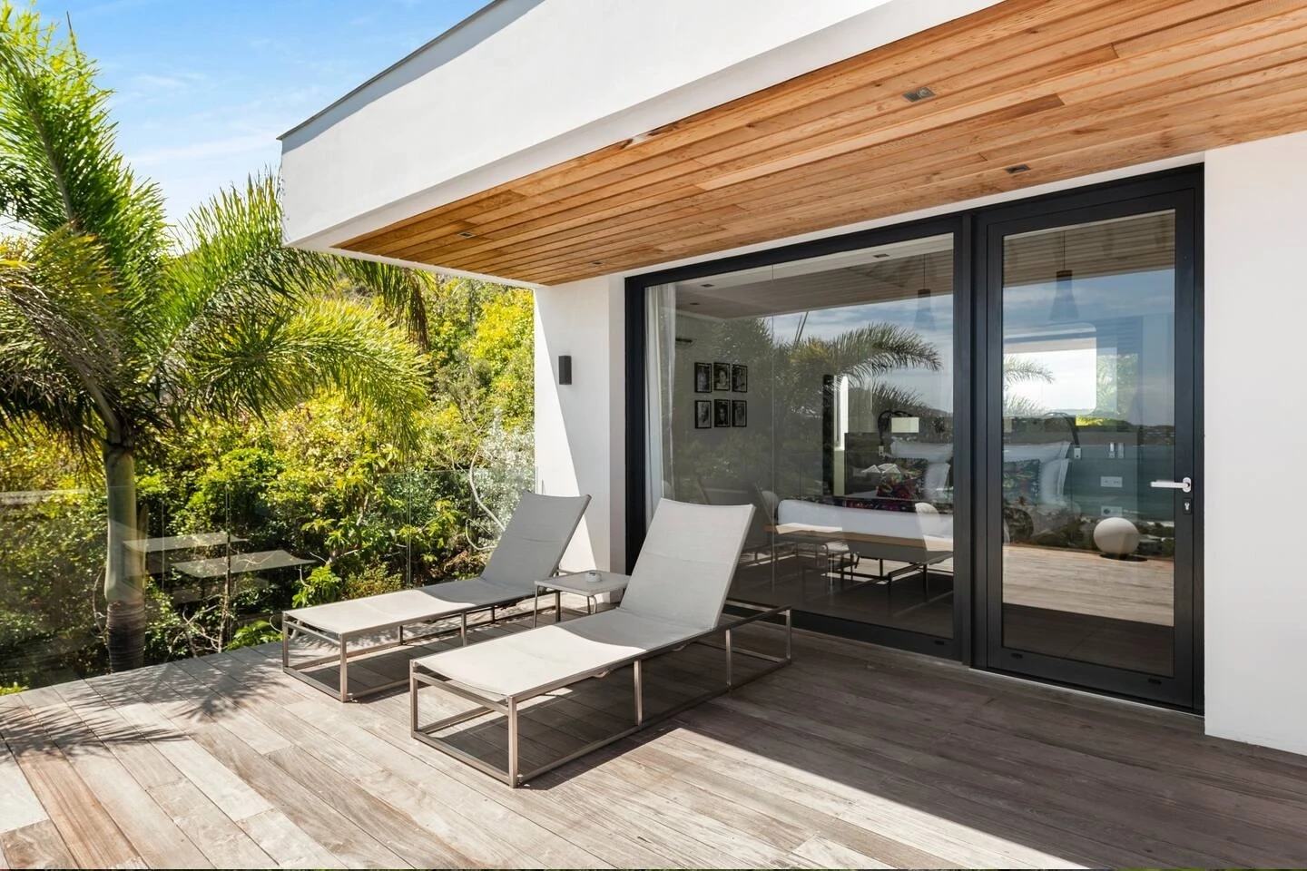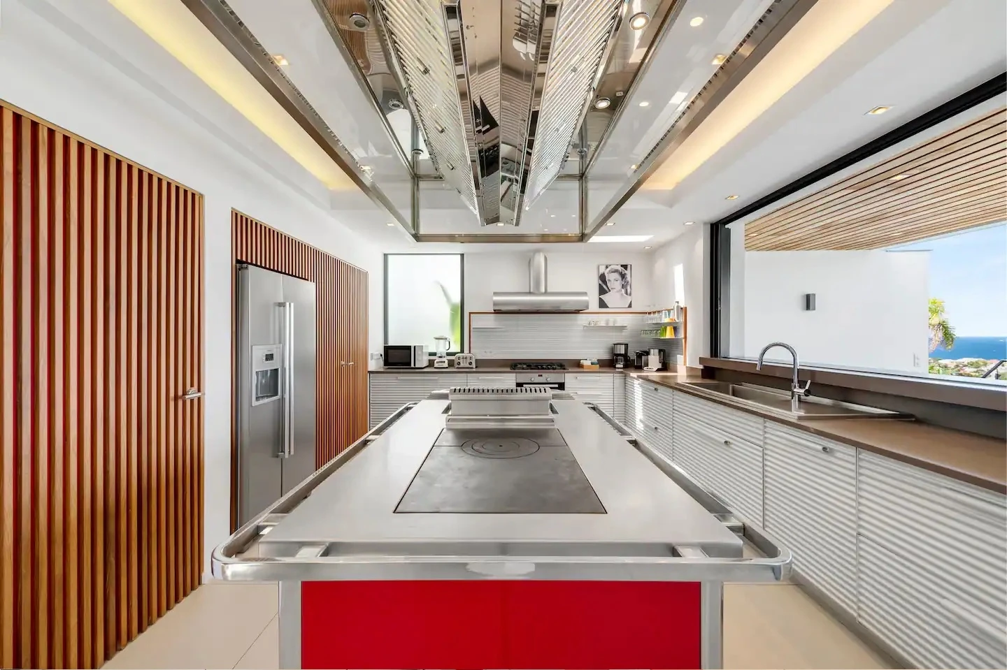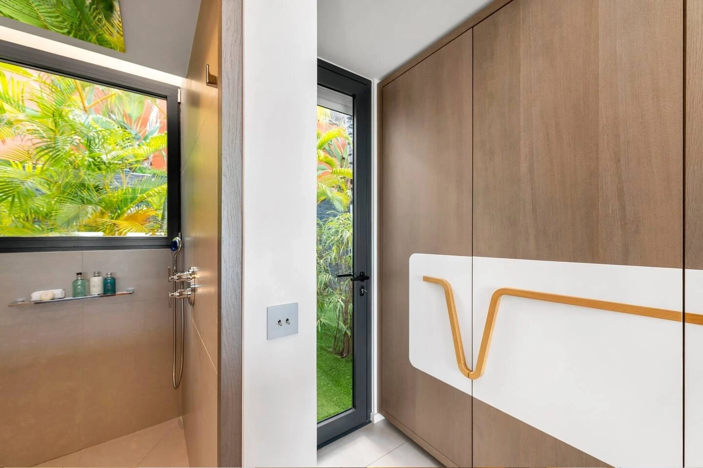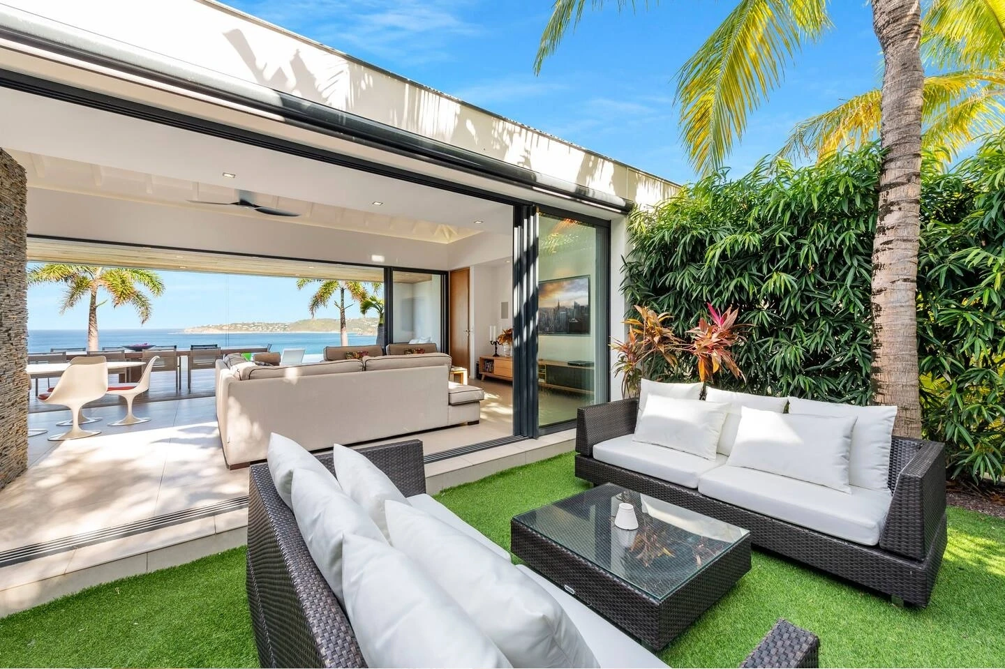 At the front, the terrace shows the breathtakingly beautiful ocean view. The heated infinity swimming pool sparkles as the turquoise waters of St. Barth. You’ll love the loungers set up in a shallow part of the pool, a perfect place to enjoy the refined beauty of The Grace Villa. Tall palm trees are planted around the pool, making the horizon even more beautiful with their chiseled shapes, while the sky reveals the glow of the island’s sun.