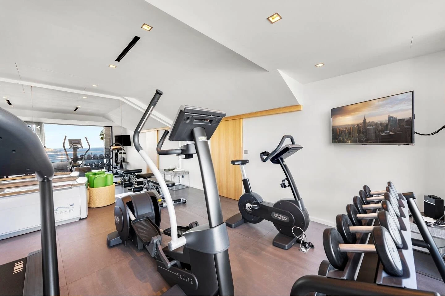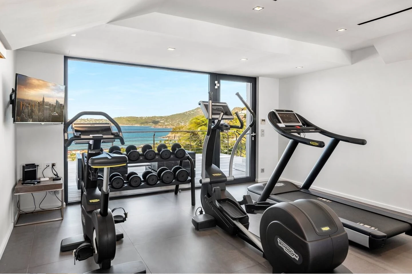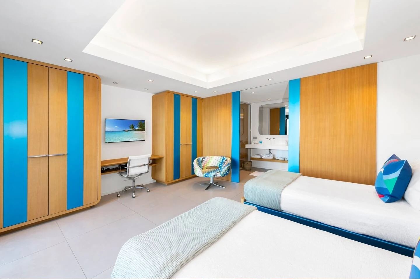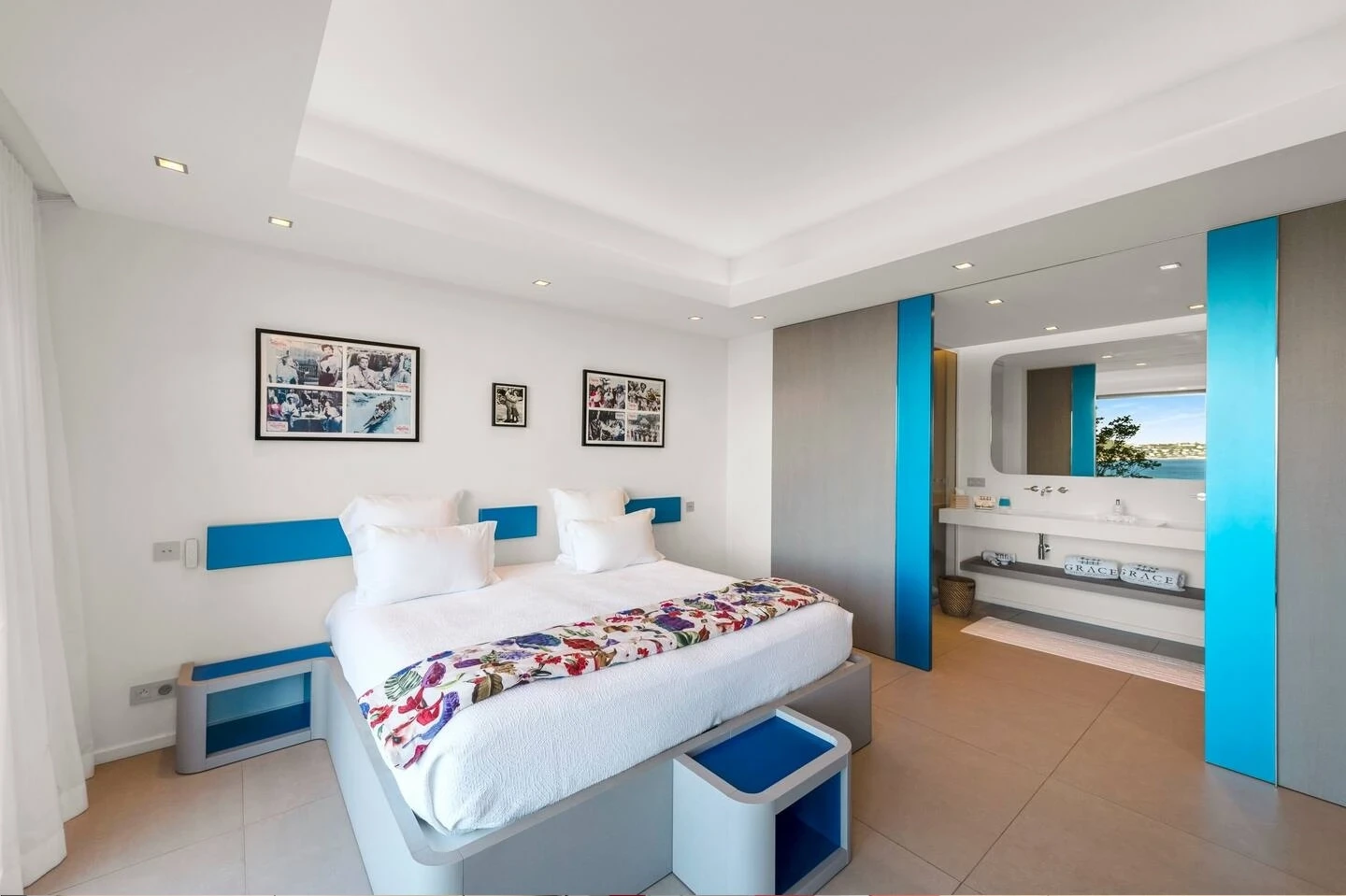 The Grace Villa consists of six air-conditioned bedrooms with ocean views and access to terraces. Three of them are on the main level, while the other three ones are on the lower one. All bedrooms feature en-suite bathrooms, one with an outdoor shower, and are furnished with queen or twin beds. The decor is most refined, with black-and-white pictures and soft fabrics with shimmering colors as in the living room. On this lower level, there is also a fully equipped fitness room with ocean views.