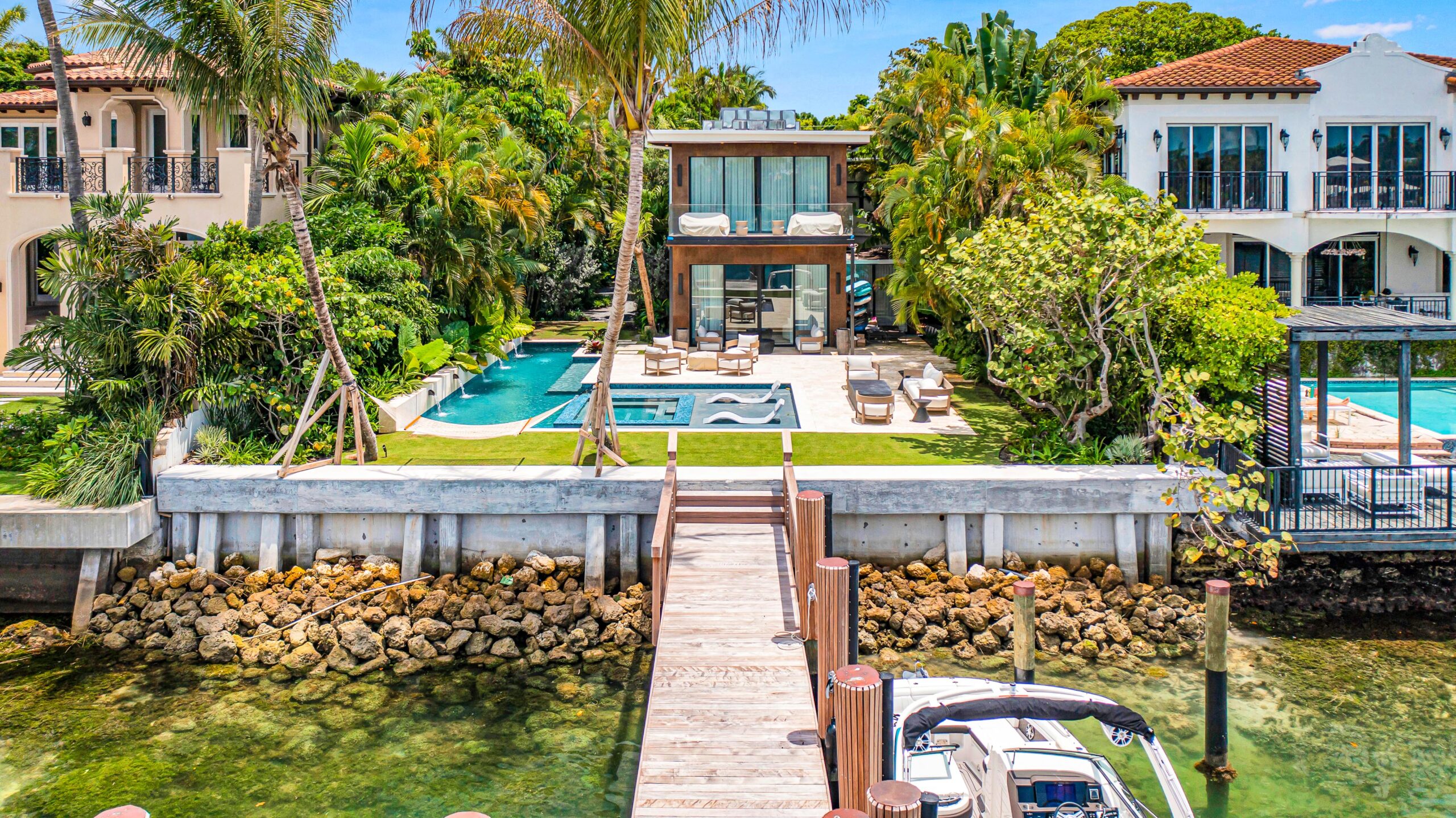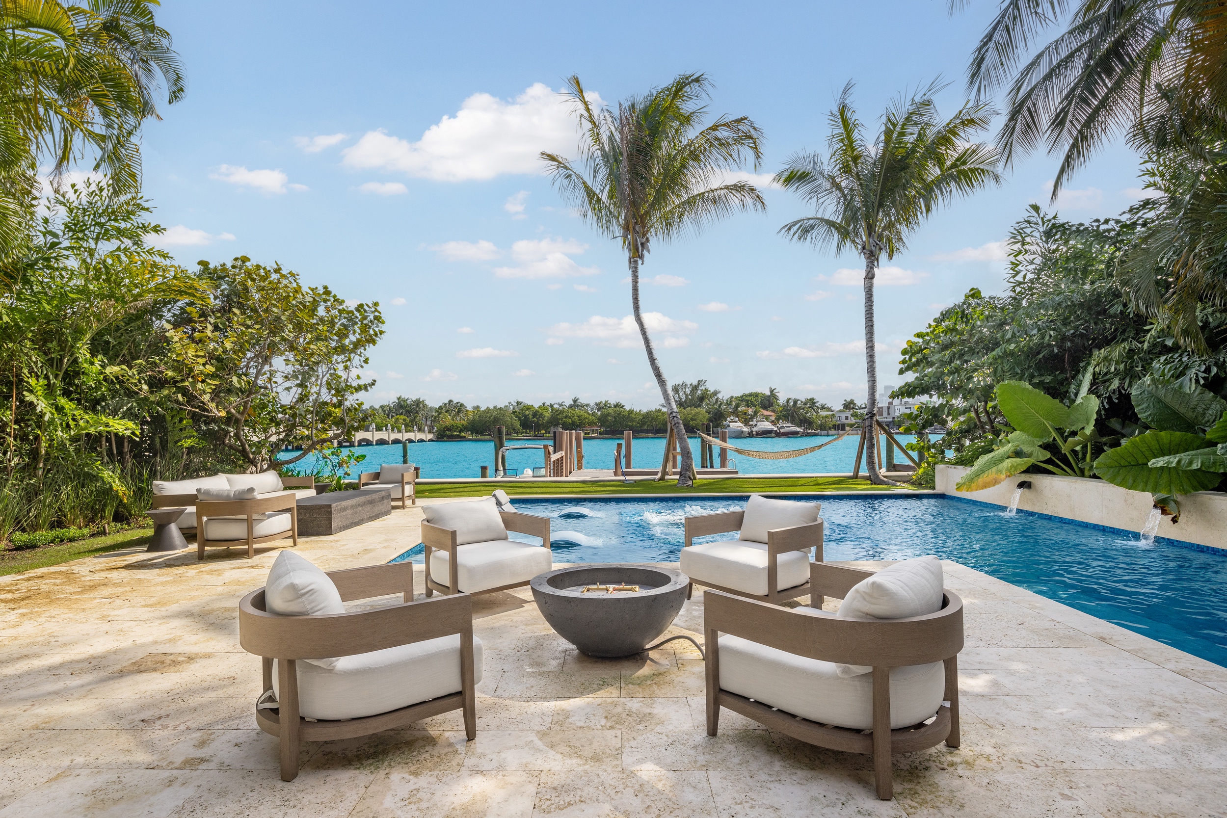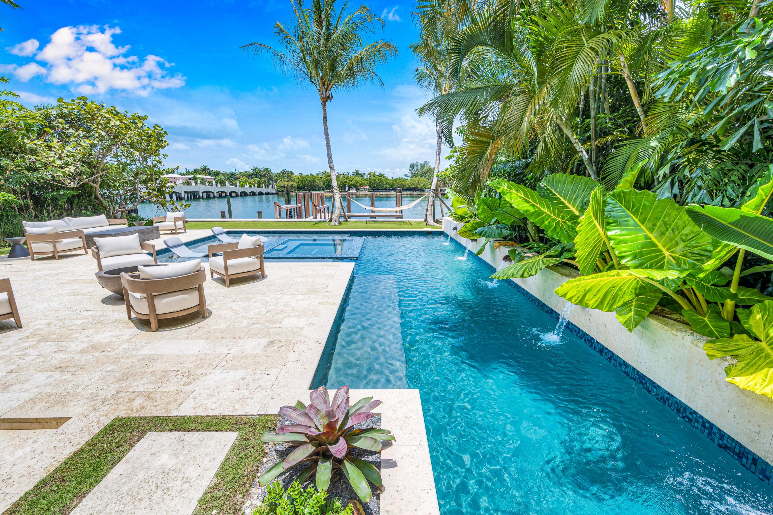 The home showcases premium fixtures and finishes that define contemporary luxury throughout. Step outside to an impressive backyard oasis, thoughtfully crafted to captivate with stunning water features, lush landscaping, and an expansive 60 feet of waterfront frontage—offering the perfect setting for relaxation and entertaining against a breathtaking coastal backdrop.