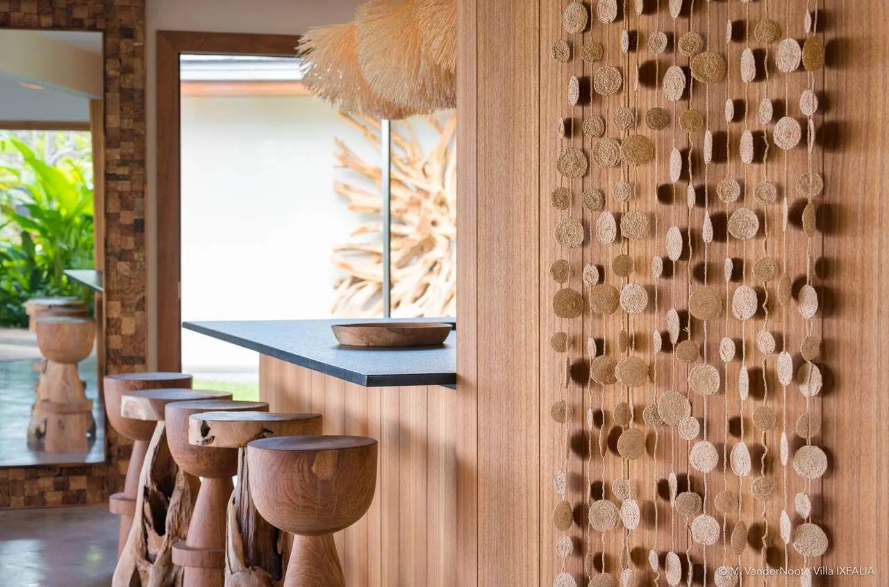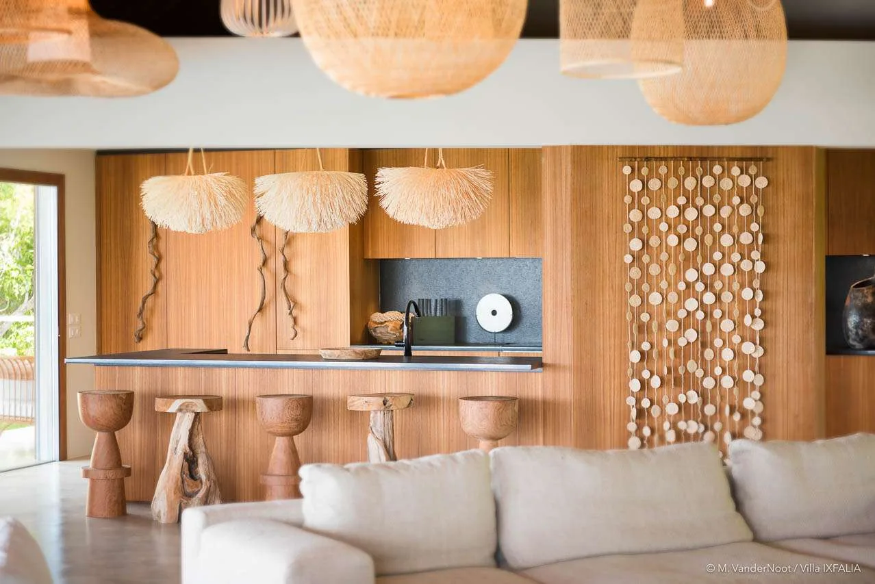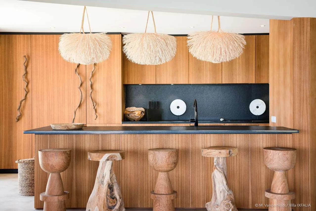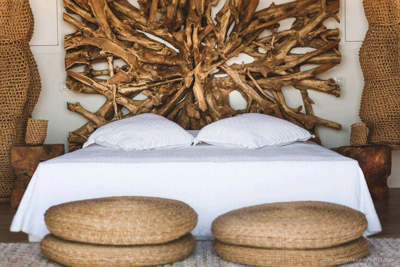 Upon entering the spacious living room, you’ll be greeted by a stylish and comfortable interior that combines simplicity with contemporary design, featuring driftwood and woven materials. The high ceilings enhance the refined, chic-ethnic décor, which draws inspiration from African motifs. With sofas, armchairs, honey-toned benches, and wooden tables, the space exudes warmth and elegance, all illuminated by beautiful hanging lights. The dining area, made from wood and natural fibers, seats up to ten guests and is positioned next to the fully equipped kitchen, which includes a breakfast bar with wooden stools. The entire space embodies the relaxed and sophisticated atmosphere that defines IXFALIA.