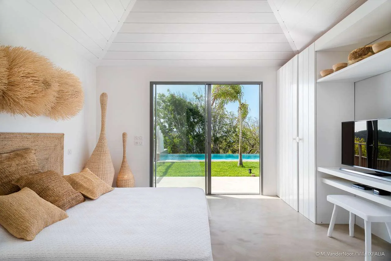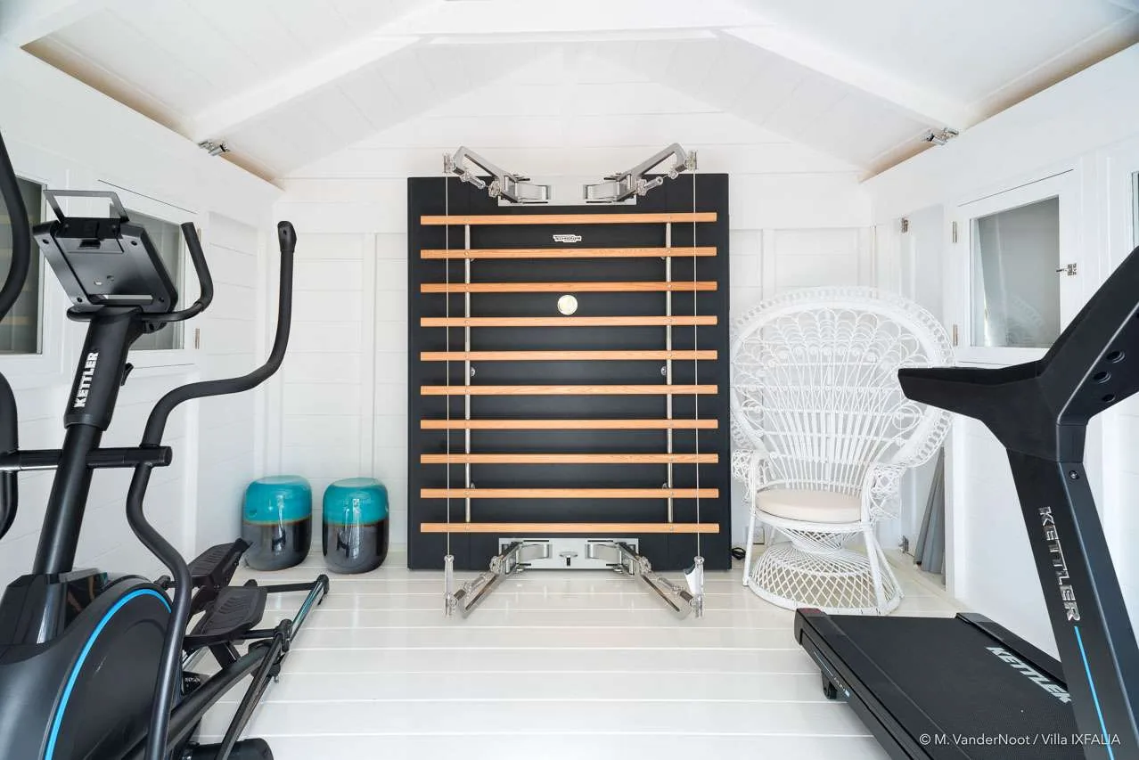 The Ixfalia Villa features four air-conditioned bedrooms, each designed in neutral tones accented with the warmth of wood. Each suite includes a king-size bed, ample storage, and an en-suite bathroom with modern, spacious showers. Every room offers breathtaking views, ensuring a serene and dreamlike atmosphere. For fitness enthusiasts, the villa also includes an air-conditioned, well-equipped gym. Three bedrooms are located in the main house, while the master bedroom and fitness room are housed in private pavilions.
