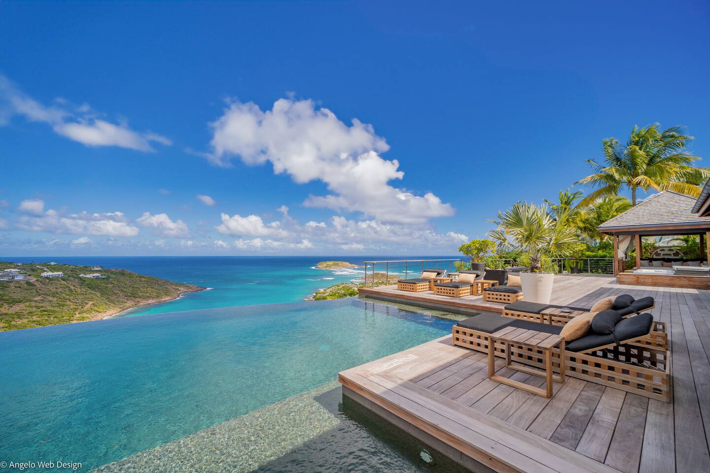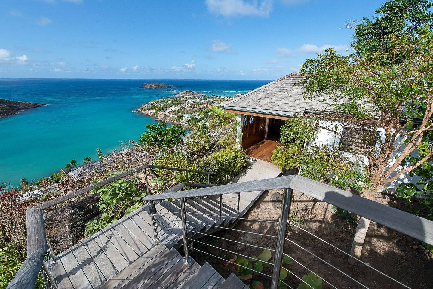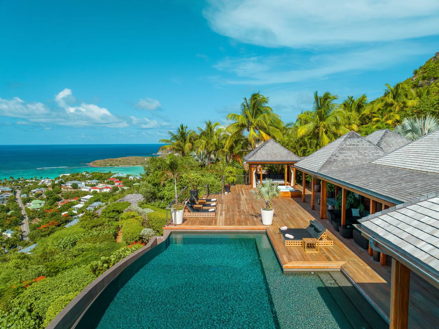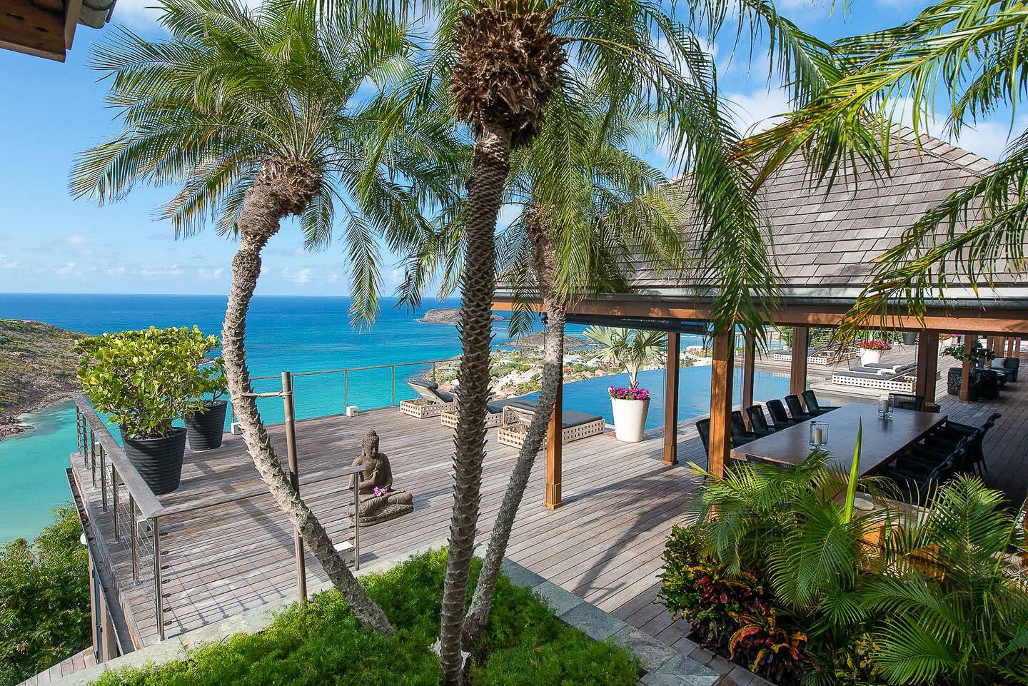 Spread across multiple levels and five separate buildings, The Jade Villa offers eight luxurious air-conditioned bedrooms, each uniquely themed and designed as exquisite works of art with a soft Asian-inspired ambiance. The main pavilion includes a family wing with the master bedroom and two children’s rooms, all overlooking the terrace and close to the living space. Four additional master suites, elegantly furnished and decorated, are situated in private pavilions for added privacy. A final suite in a lower bungalow is ideal for staff or teenagers, completing this exceptional villa that perfectly balances luxury, privacy, and breathtaking ocean views.