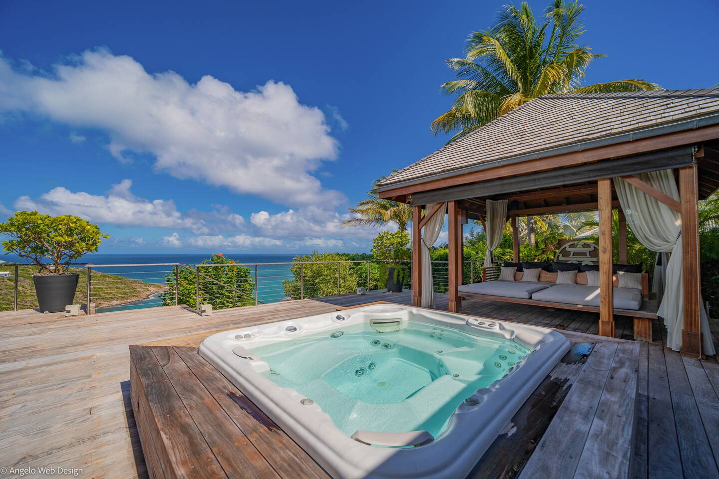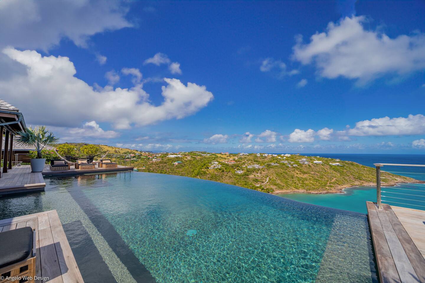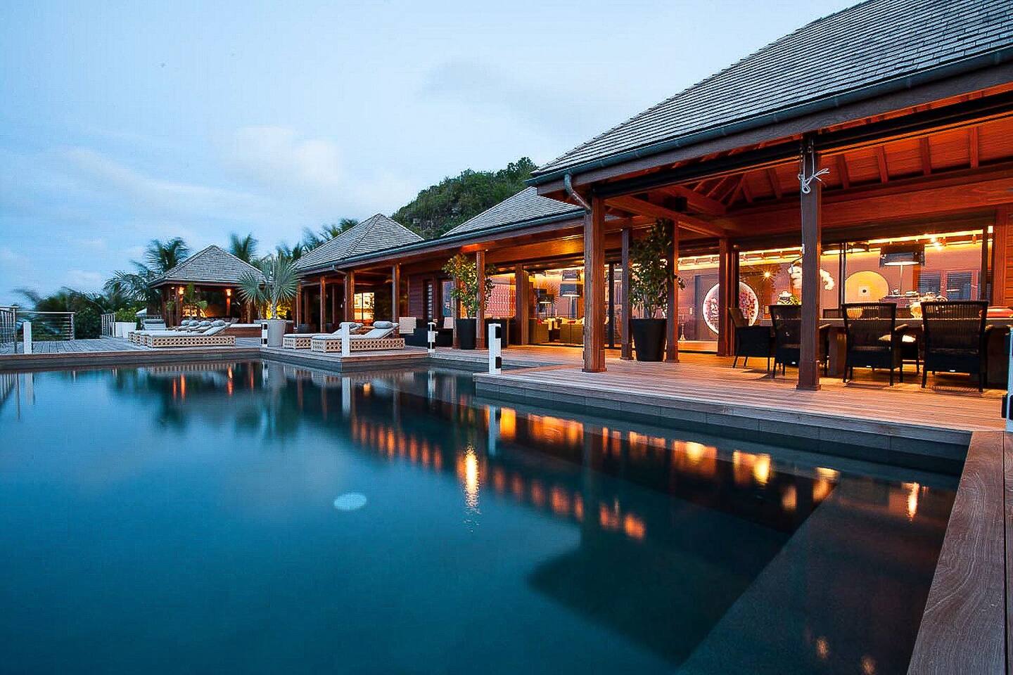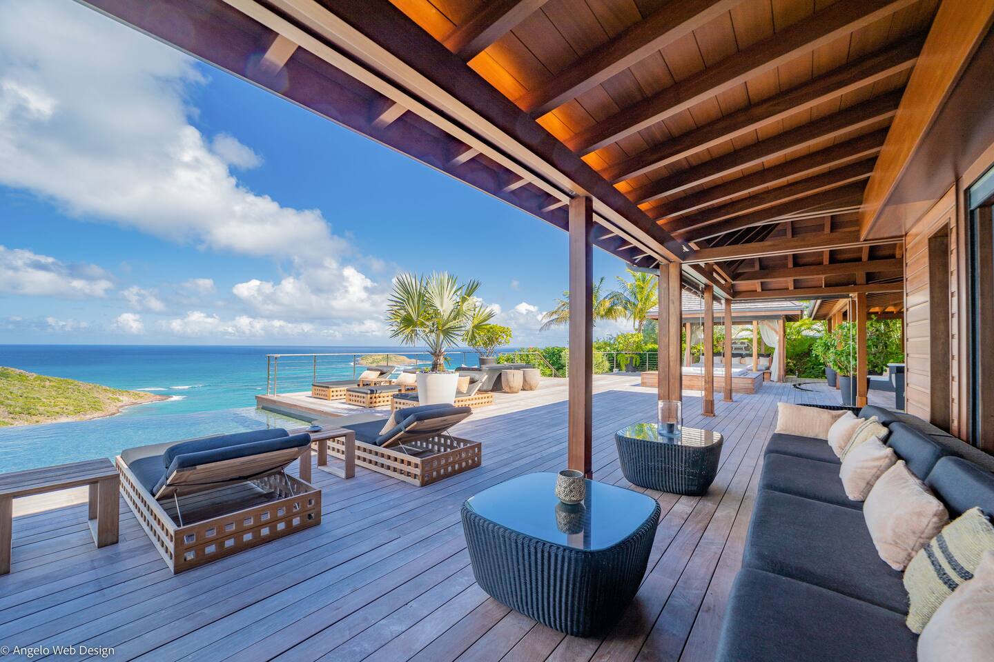 Spread across multiple levels and five separate buildings, The Jade Villa offers eight luxurious air-conditioned bedrooms, each uniquely themed and designed as exquisite works of art with a soft Asian-inspired ambiance. The main pavilion includes a family wing with the master bedroom and two children’s rooms, all overlooking the terrace and close to the living space. Four additional master suites, elegantly furnished and decorated, are situated in private pavilions for added privacy. A final suite in a lower bungalow is ideal for staff or teenagers, completing this exceptional villa that perfectly balances luxury, privacy, and breathtaking ocean views.