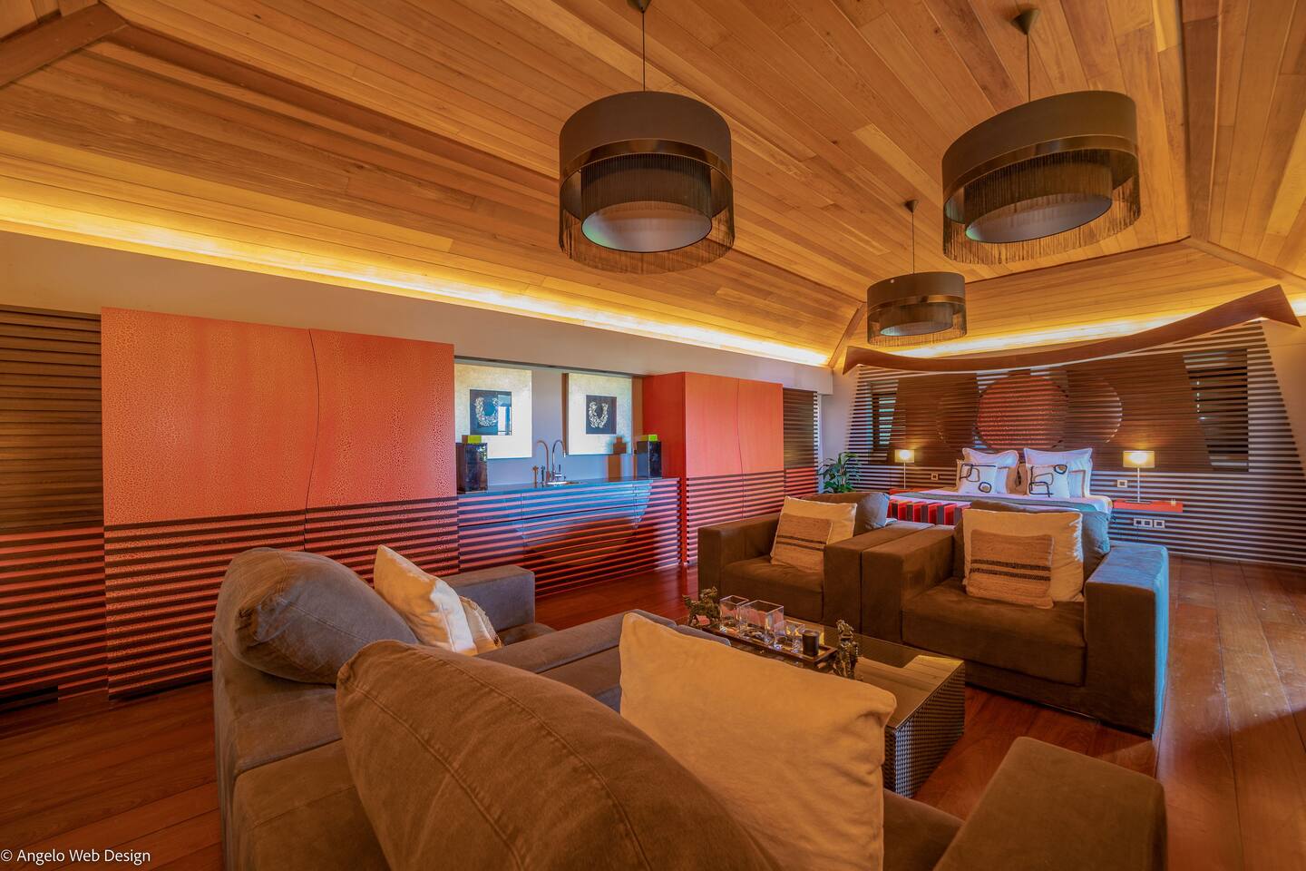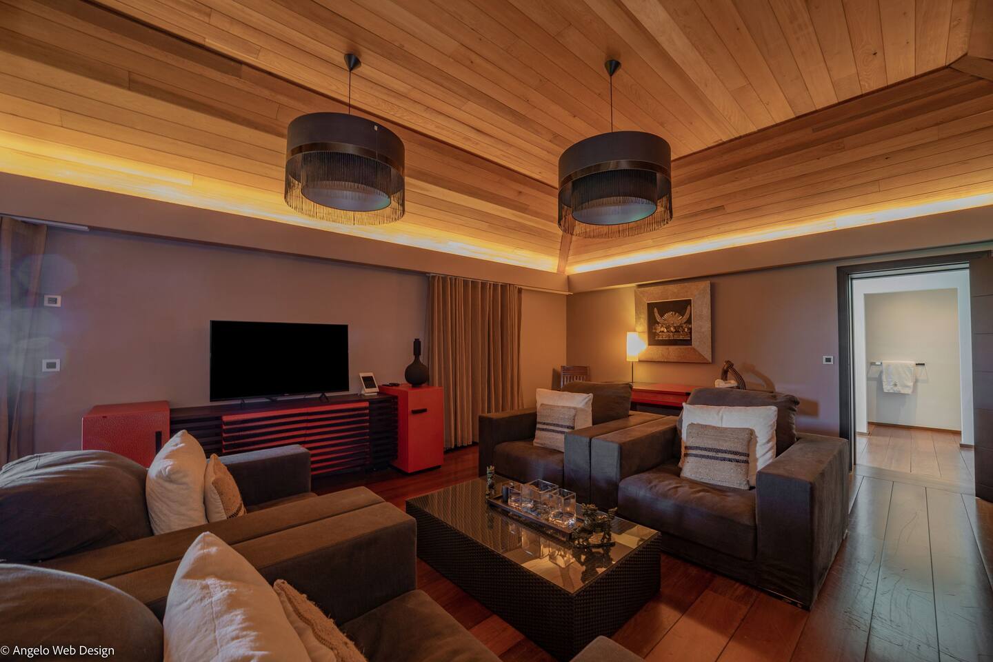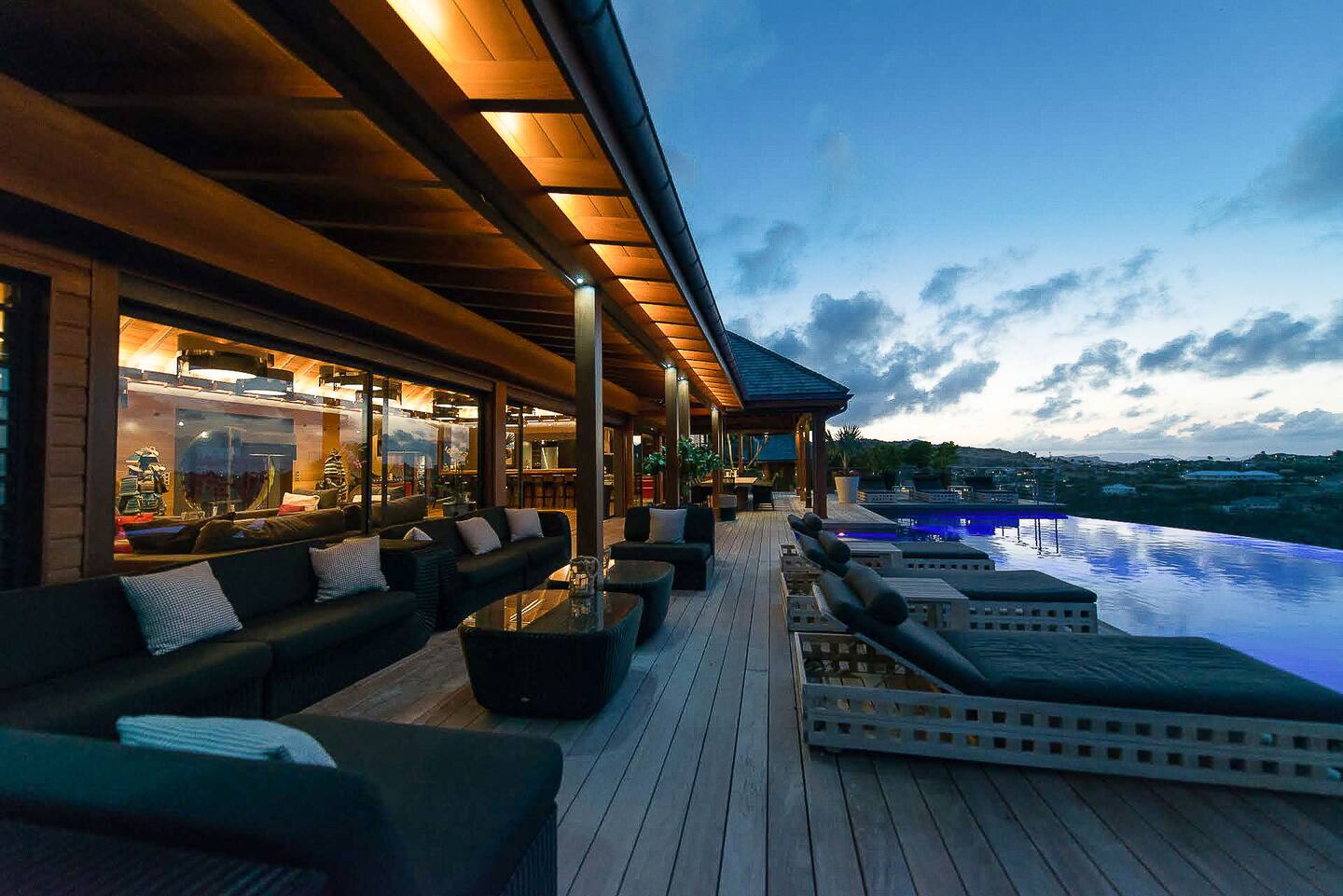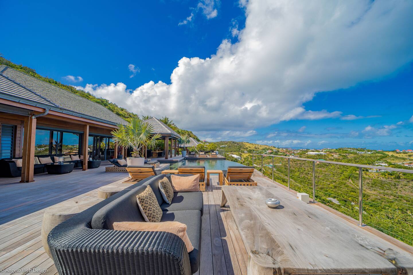 The Jade Villa is a stunning tribute to Asia, blending modern elegance with timeless charm, crafted with love by its owners. Upon arrival, a quaint wooden deck leads you over a serene pond filled with water lilies and koi fish, setting a tranquil tone. A striking round glass door opens into the expansive living room, flanked by two 17th-century samurai statues. This grand, air-conditioned space is beautifully decorated with authentic artworks and features a warm, soothing Balinese style. The impressive high wooden ceiling is adorned with fourteen black Moooi pendant lamps, complementing the custom-made cabinetry that houses a large television. At the rear, a professional kitchen and bar with over eight stools offer a perfect setting for entertaining, while the wooden dining table on the covered terrace comfortably seats up to fourteen guests, all while overlooking breathtaking panoramic views.