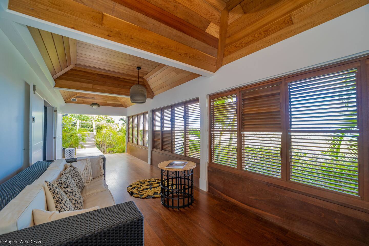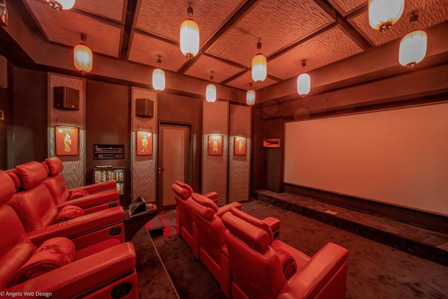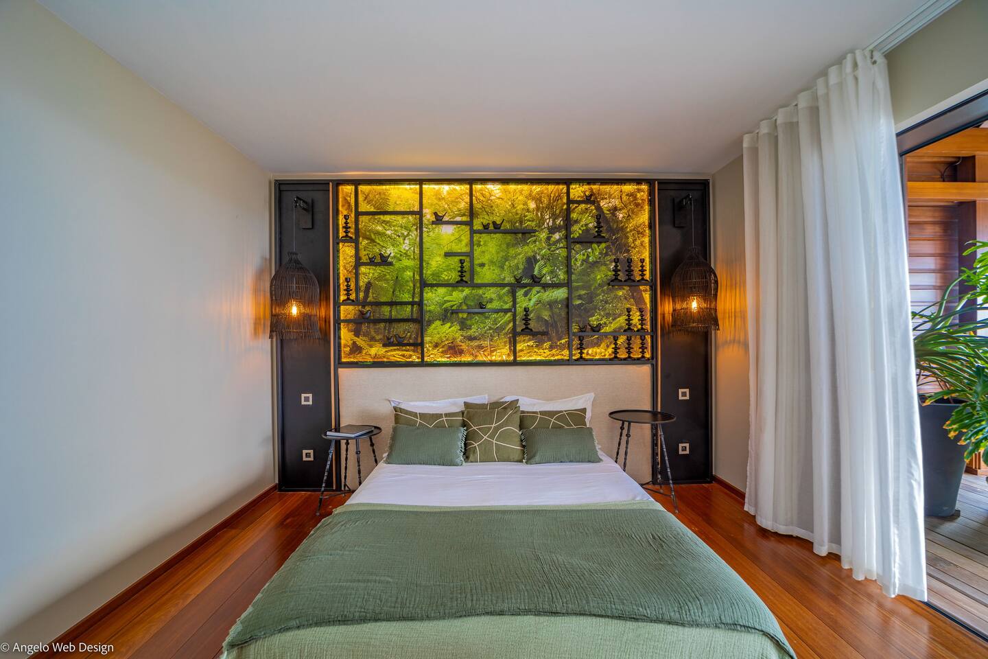 The Jade Villa is a stunning tribute to Asia, blending modern elegance with timeless charm, crafted with love by its owners. Upon arrival, a quaint wooden deck leads you over a serene pond filled with water lilies and koi fish, setting a tranquil tone. A striking round glass door opens into the expansive living room, flanked by two 17th-century samurai statues. This grand, air-conditioned space is beautifully decorated with authentic artworks and features a warm, soothing Balinese style. The impressive high wooden ceiling is adorned with fourteen black Moooi pendant lamps, complementing the custom-made cabinetry that houses a large television. At the rear, a professional kitchen and bar with over eight stools offer a perfect setting for entertaining, while the wooden dining table on the covered terrace comfortably seats up to fourteen guests, all while overlooking breathtaking panoramic views.