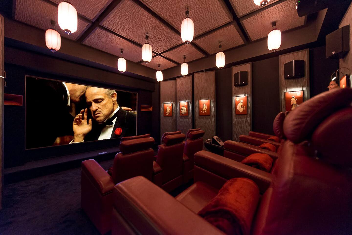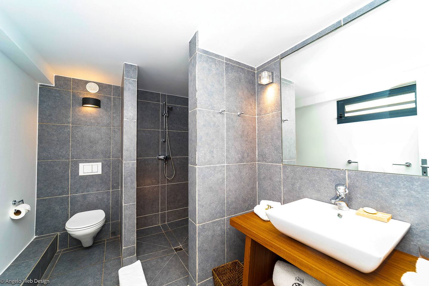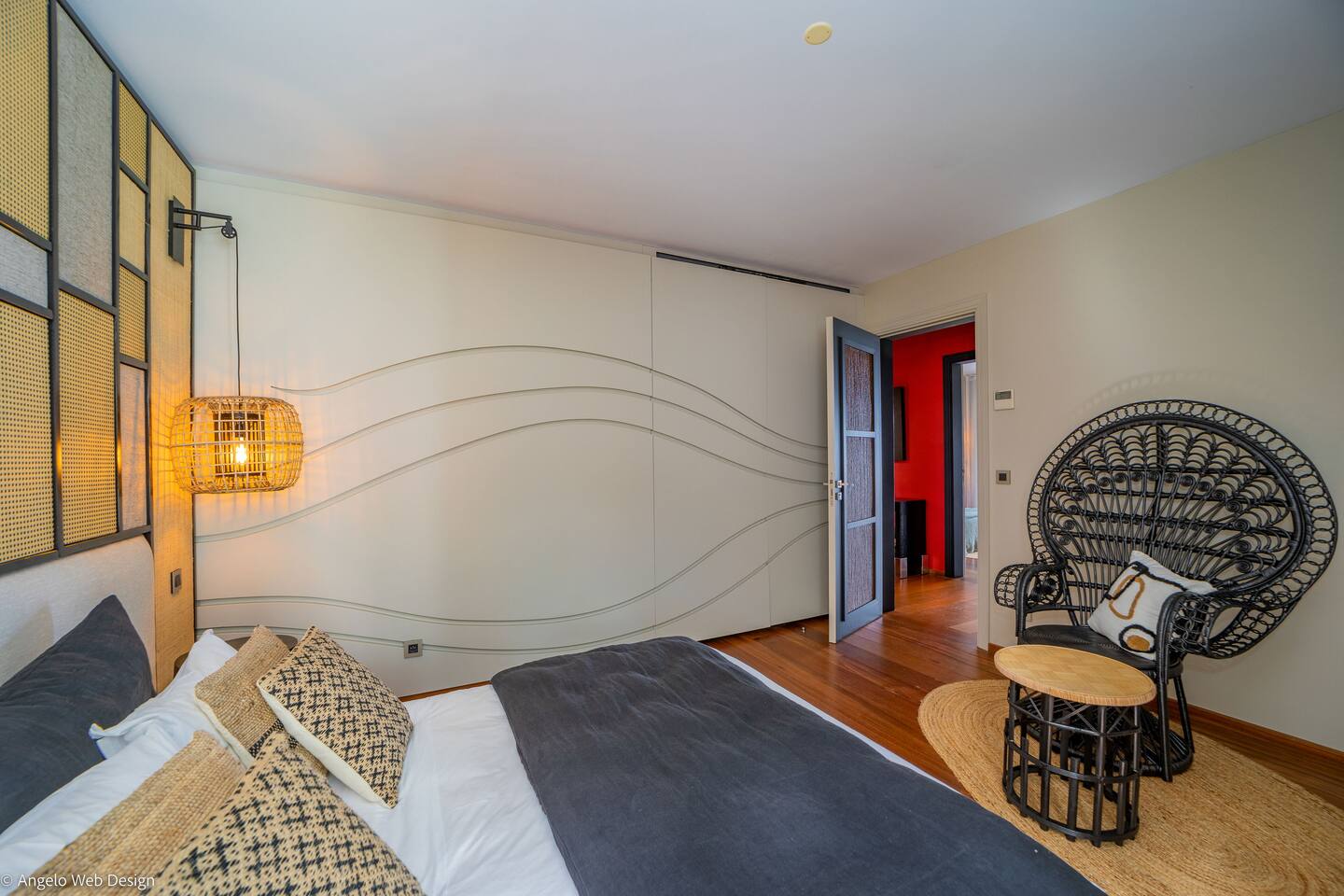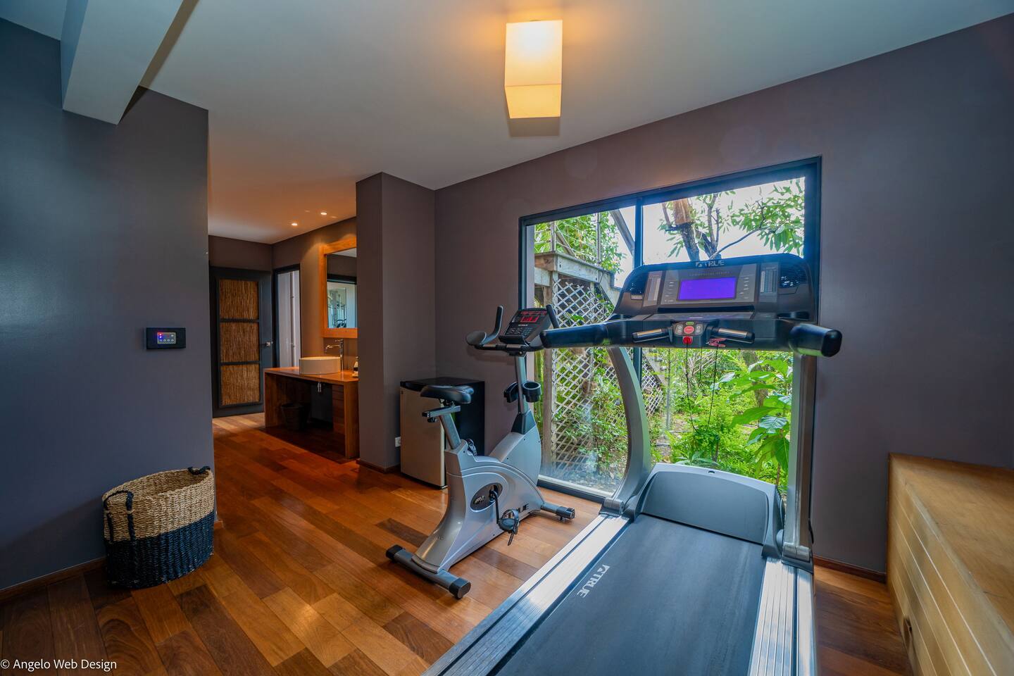 The Jade Villa is a stunning tribute to Asia, blending modern elegance with timeless charm, crafted with love by its owners. Upon arrival, a quaint wooden deck leads you over a serene pond filled with water lilies and koi fish, setting a tranquil tone. A striking round glass door opens into the expansive living room, flanked by two 17th-century samurai statues. This grand, air-conditioned space is beautifully decorated with authentic artworks and features a warm, soothing Balinese style. The impressive high wooden ceiling is adorned with fourteen black Moooi pendant lamps, complementing the custom-made cabinetry that houses a large television. At the rear, a professional kitchen and bar with over eight stools offer a perfect setting for entertaining, while the wooden dining table on the covered terrace comfortably seats up to fourteen guests, all while overlooking breathtaking panoramic views.