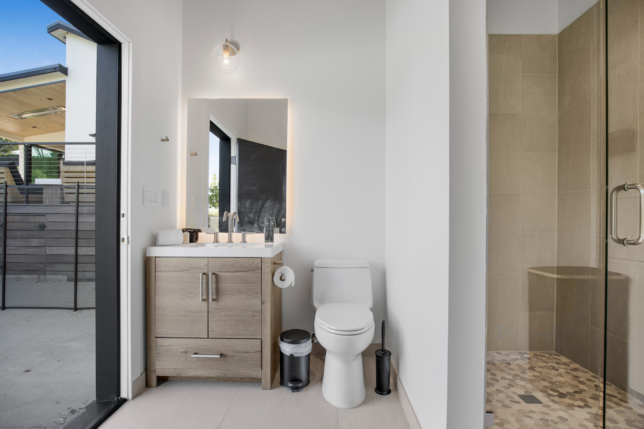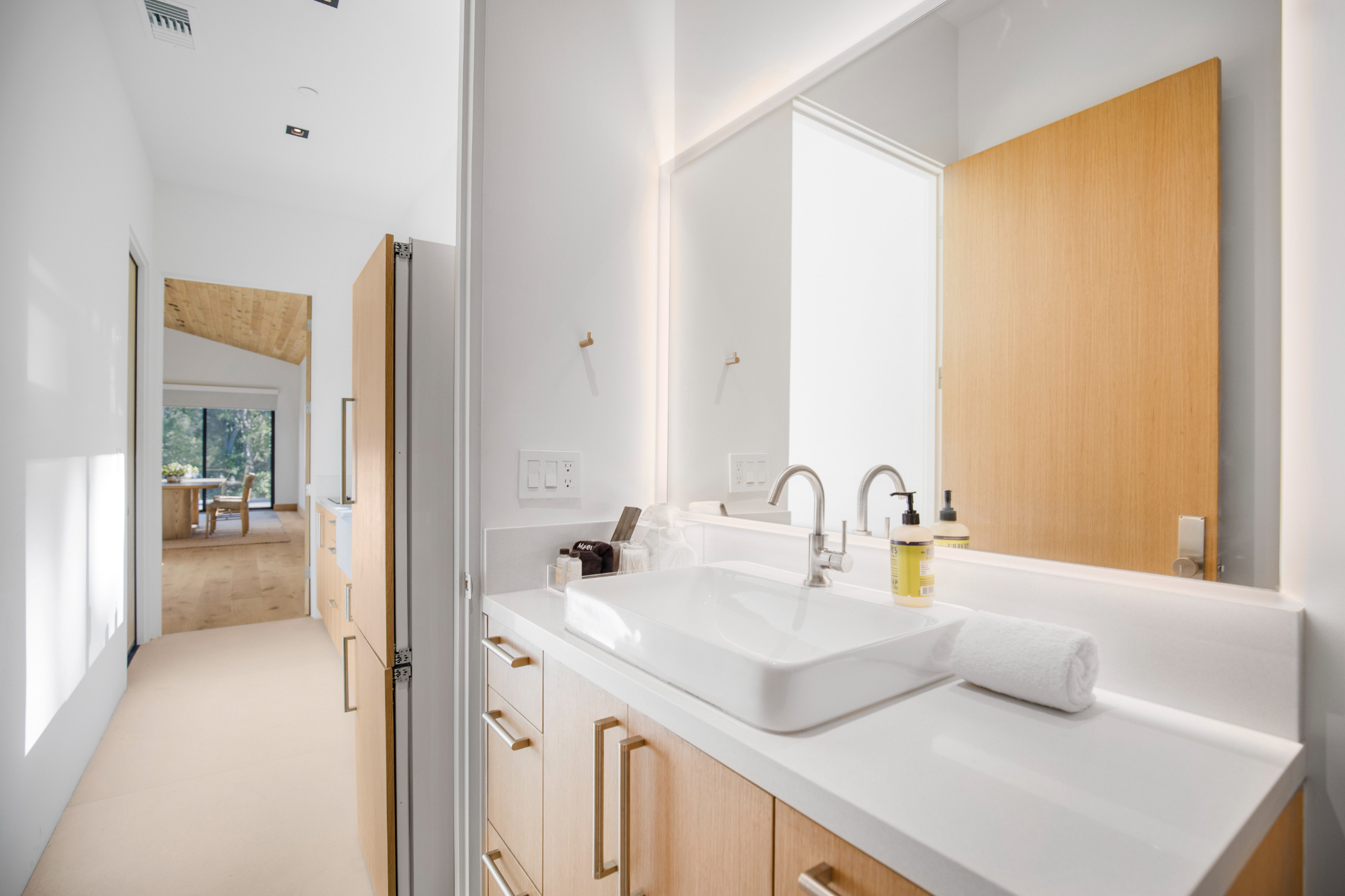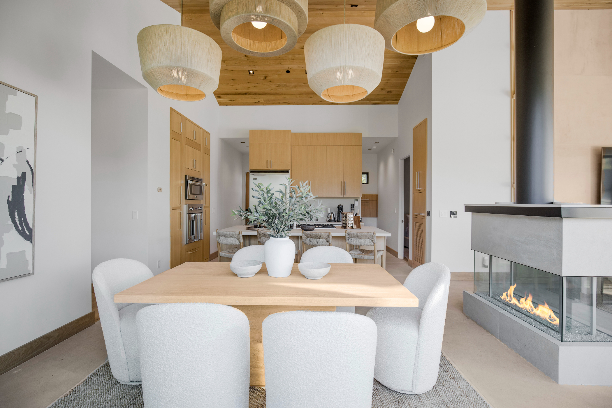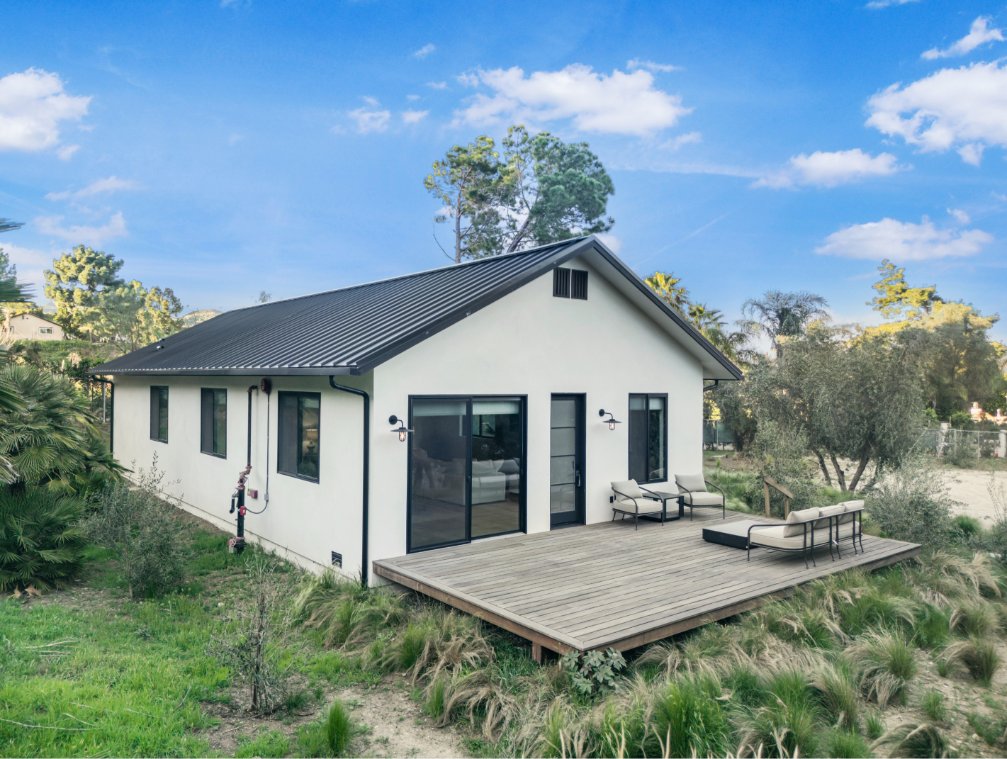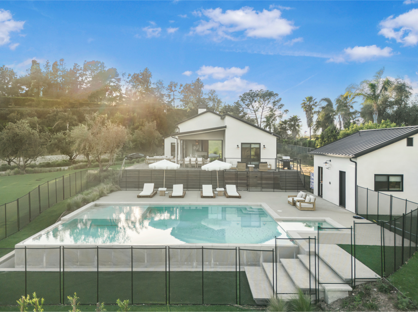 The brand-new main residence features soaring ceilings, rich hardwood and porcelain flooring, and expansive sliding glass walls that seamlessly blend indoor elegance with outdoor serenity. At the heart of the home is a stunning all-Viking chef’s kitchen, perfectly suited for intimate entertaining or full-scale production catering.