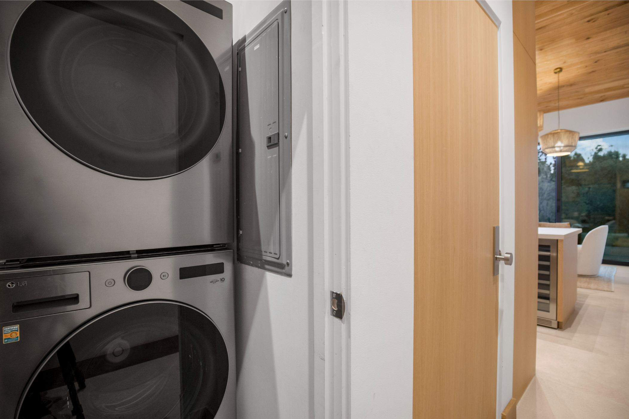 Step outside to a wraparound Ipe wood deck overlooking manicured grounds, a sparkling full-sized pool, a spa, and a tranquil cabana/massage room. The property’s two flat acres offer lush landscaping and multiple outdoor living zones, all enveloped in total seclusion.