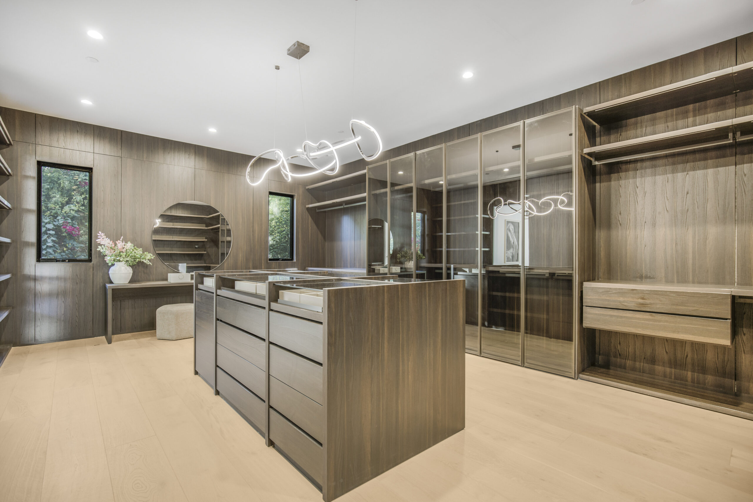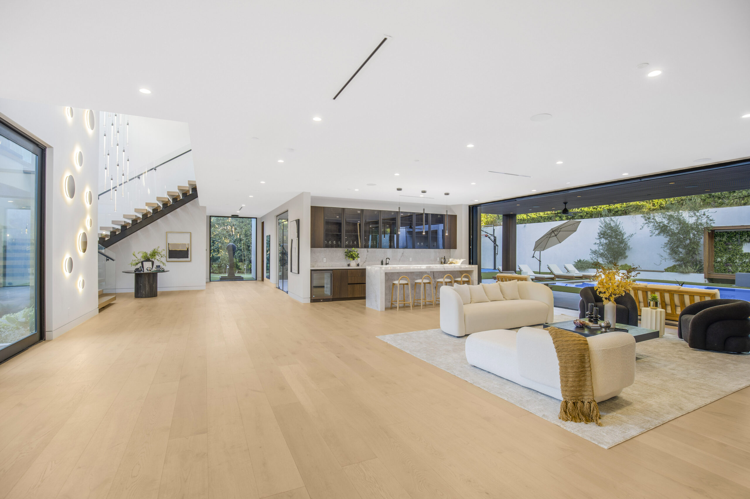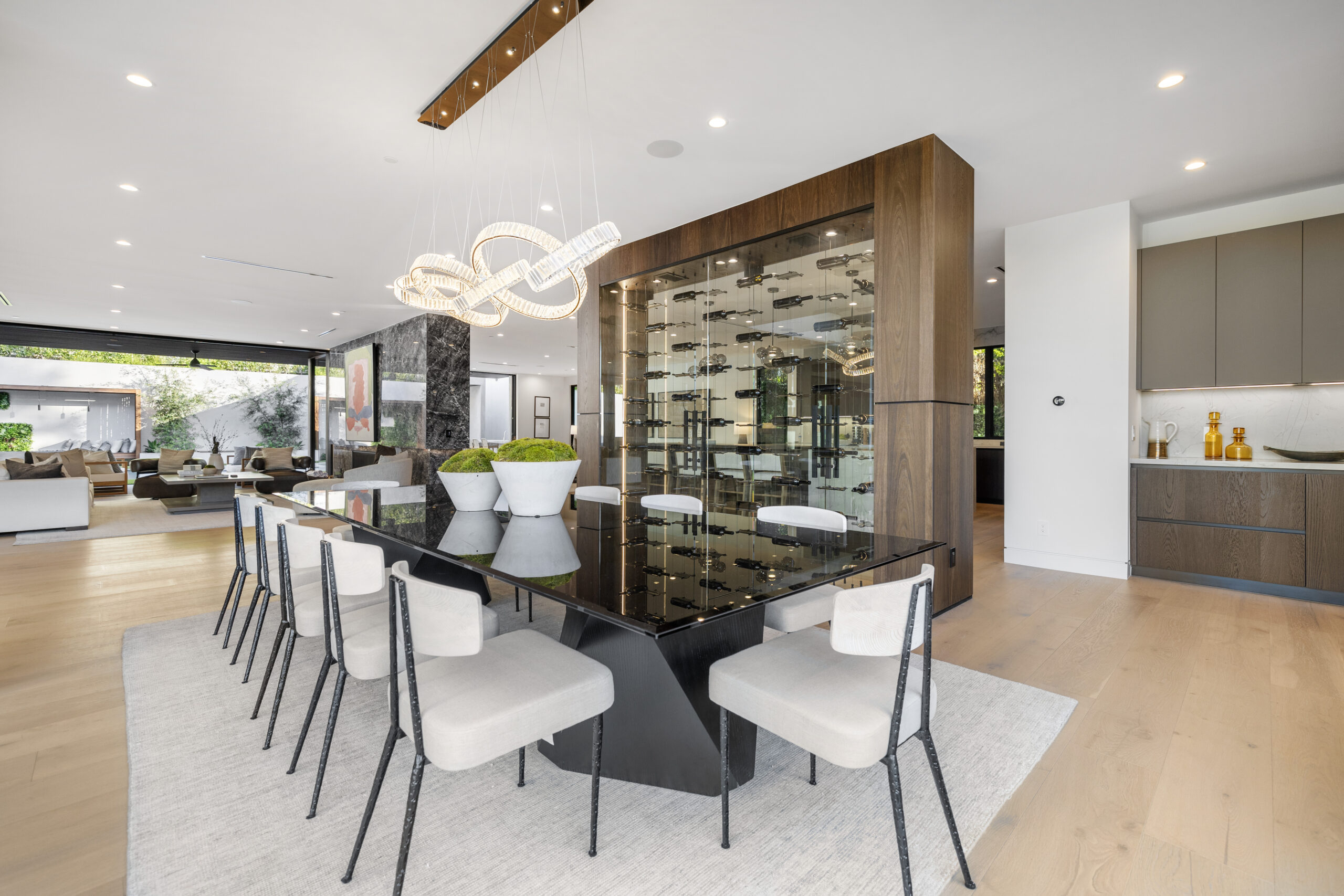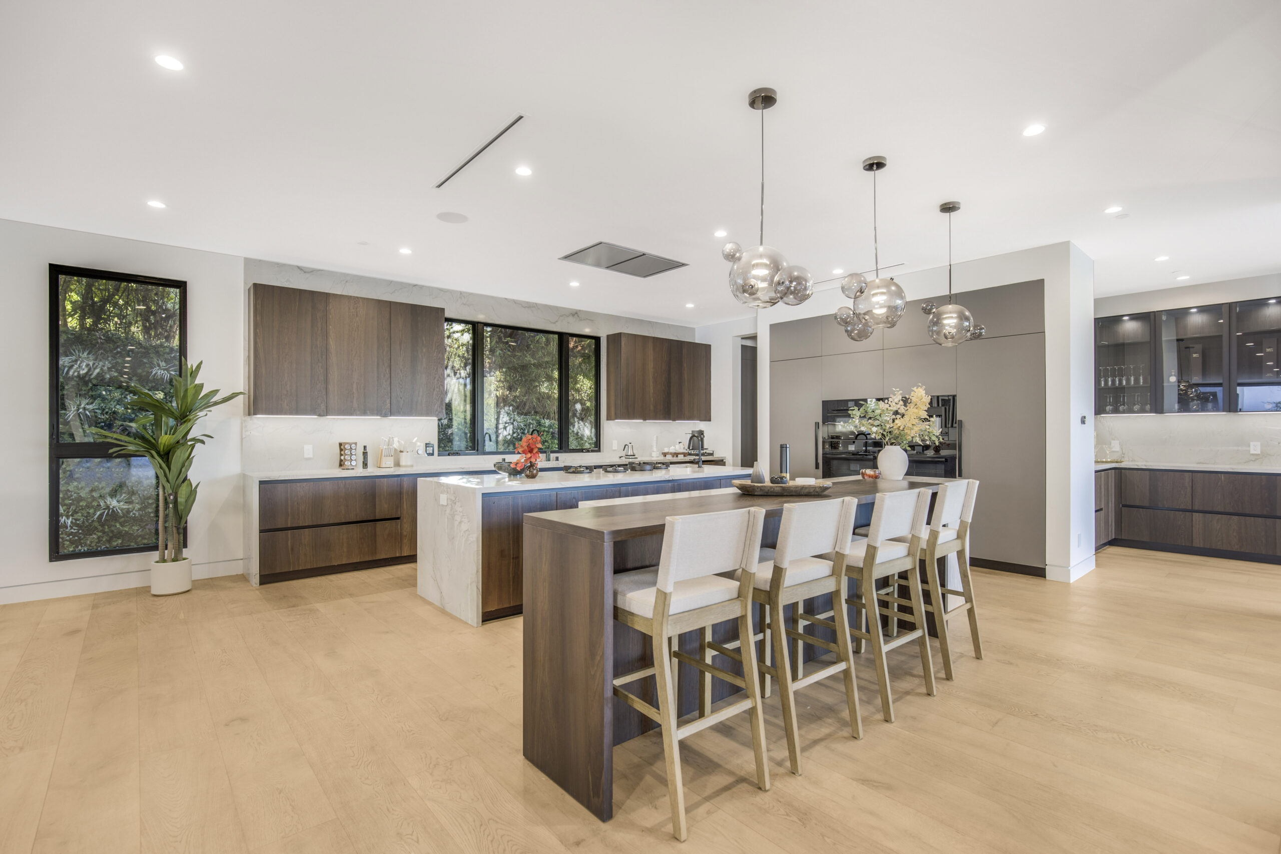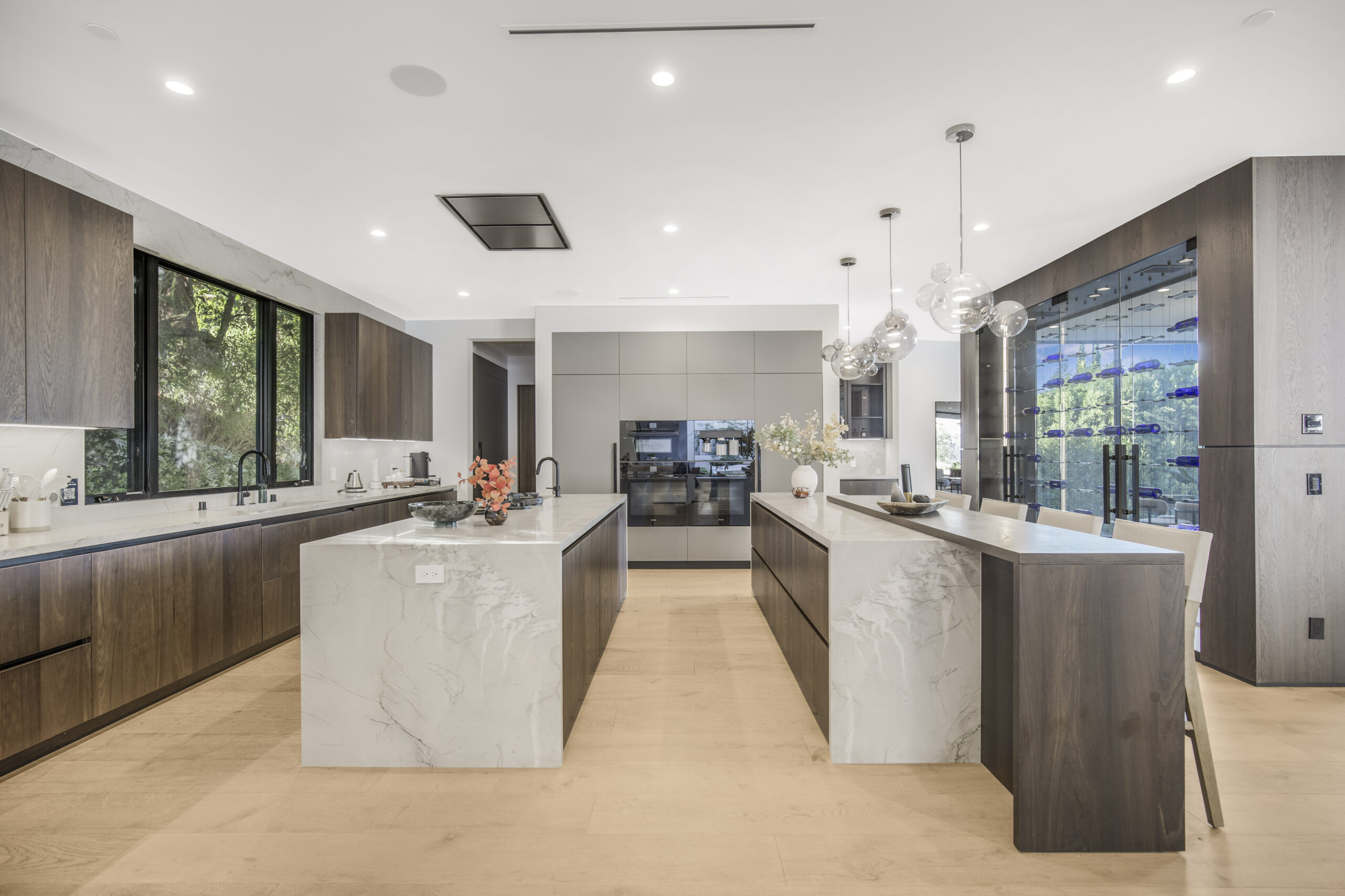 Tucked away at the end of a tranquil cul-de-sac, this 8,476-square-foot estate serves as a masterclass in modern sophistication and architectural scale. The open-concept interior is defined by radiant European oak flooring and soaring floor-to-ceiling glass that invites an abundance of natural light to dance across every room. Designed for the ultimate host, the home features a dramatic great room anchored by a custom stone bar and a glass-enclosed wine display, while the culinary center boasts a chef’s kitchen equipped with dual center islands and professional-grade stainless steel appliances.