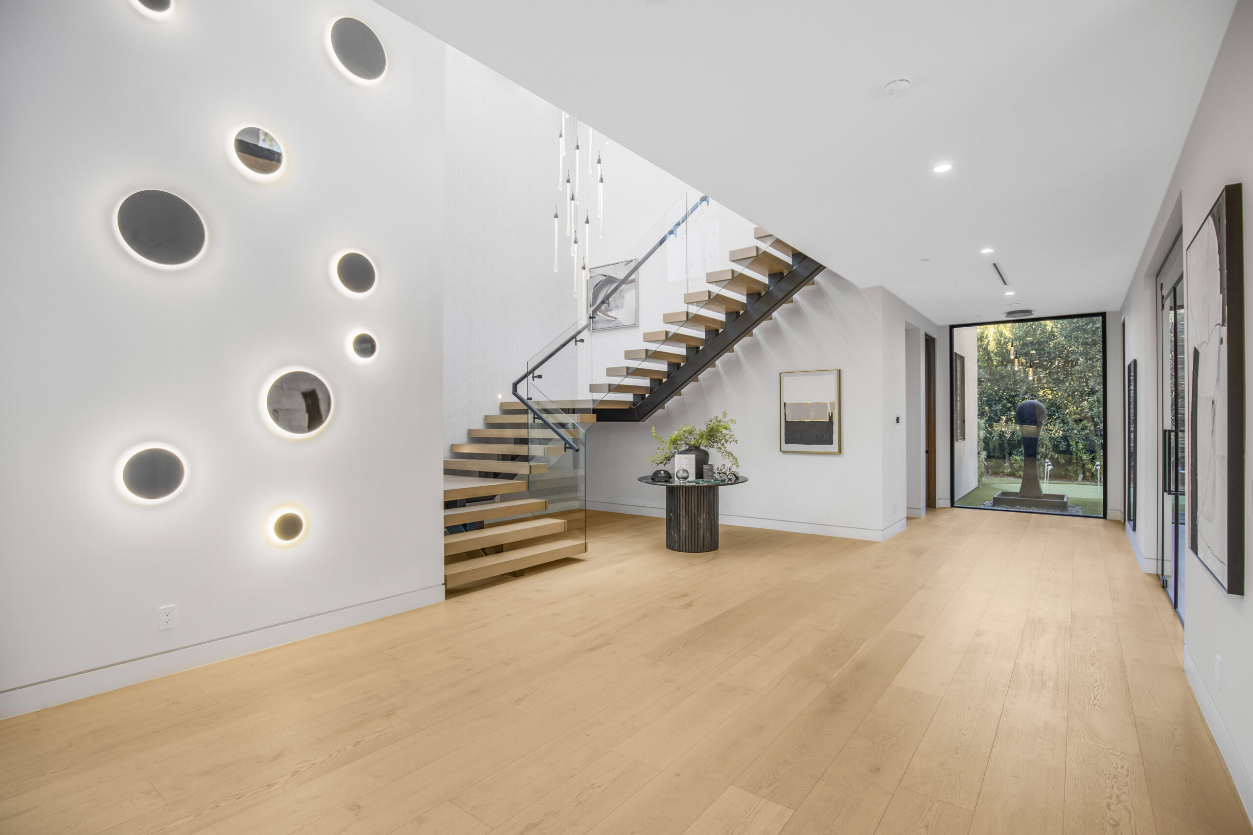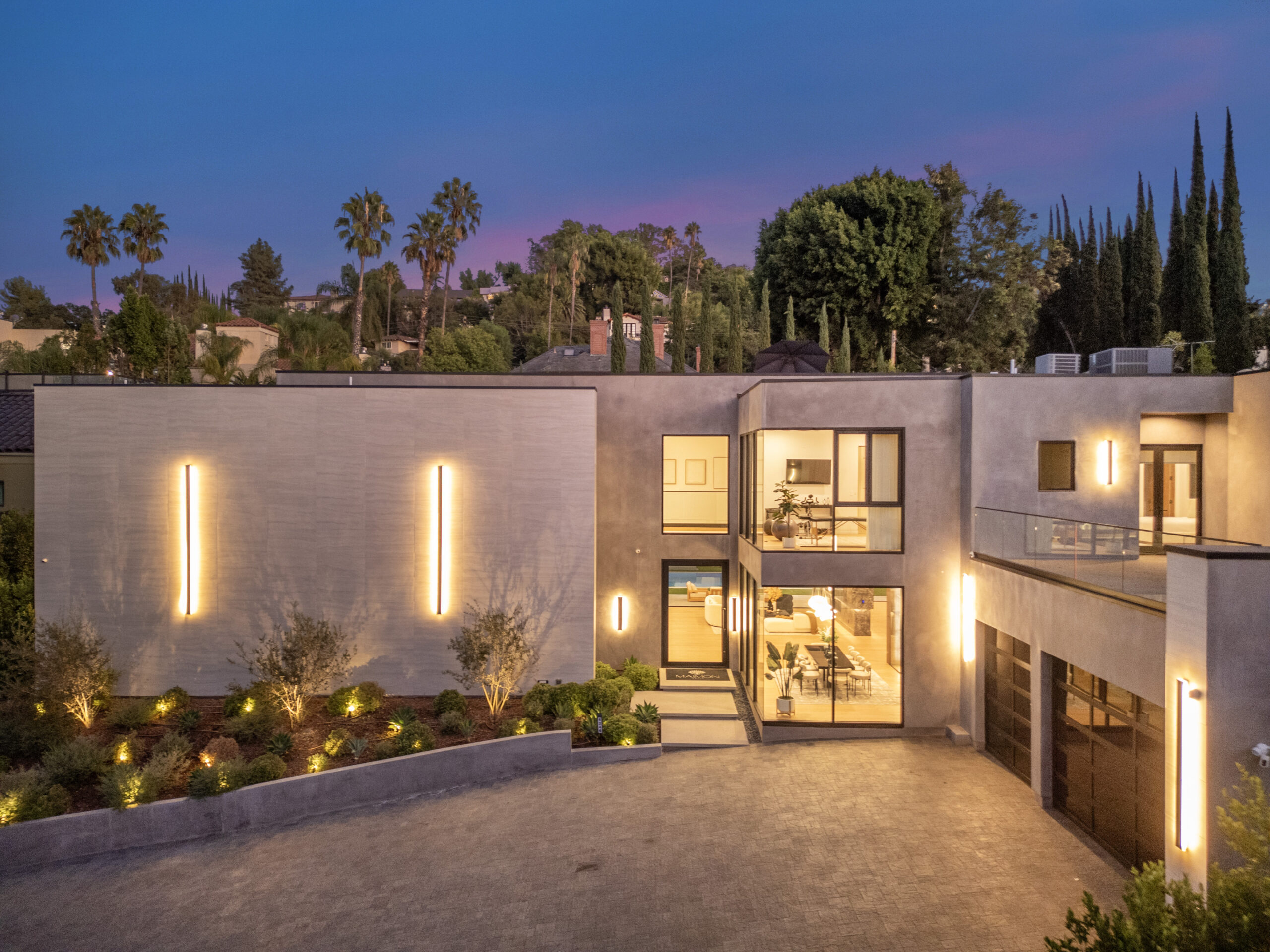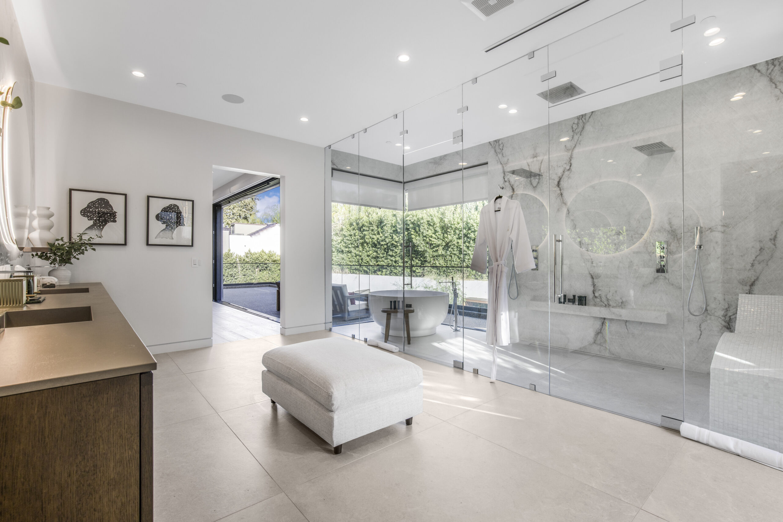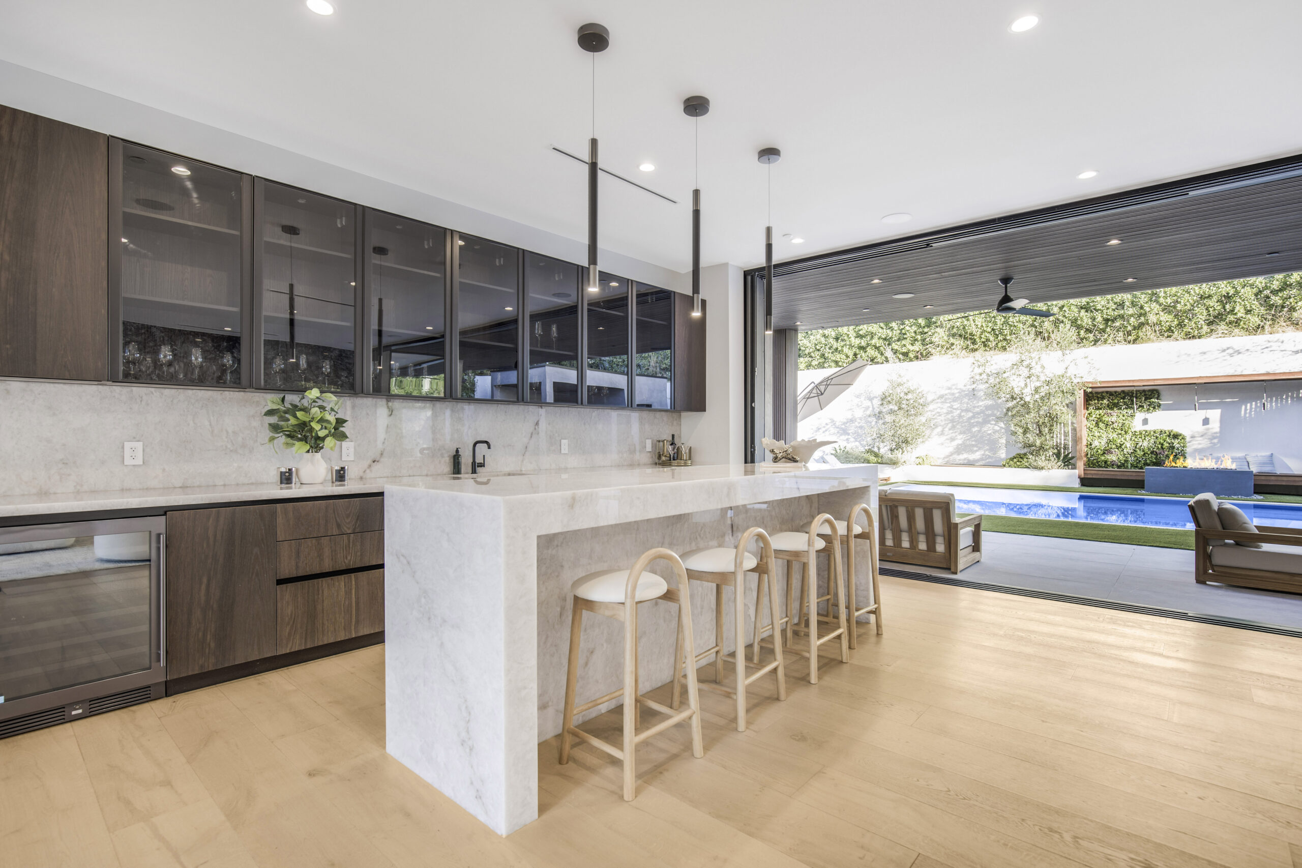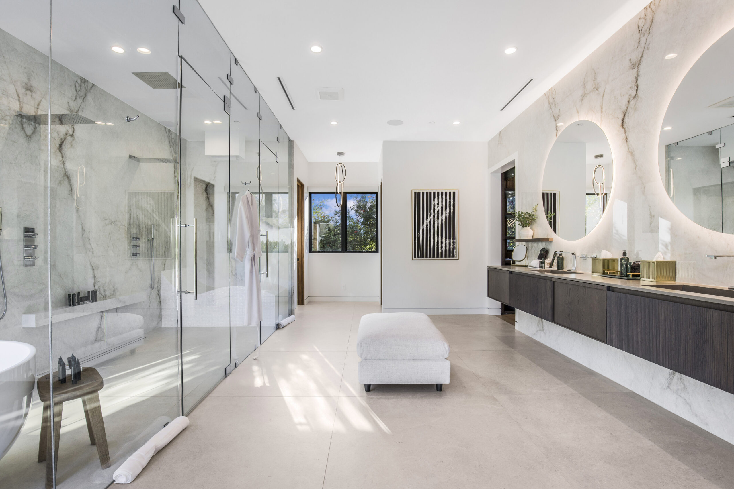Tucked away at the end of a tranquil cul-de-sac, this 8,476-square-foot estate serves as a masterclass in modern sophistication and architectural scale. The open-concept interior is defined by radiant European oak flooring and soaring floor-to-ceiling glass that invites an abundance of natural light to dance across every room. Designed for the ultimate host, the home features a dramatic great room anchored by a custom stone bar and a glass-enclosed wine display, while the culinary center boasts a chef’s kitchen equipped with dual center islands and professional-grade stainless steel appliances.