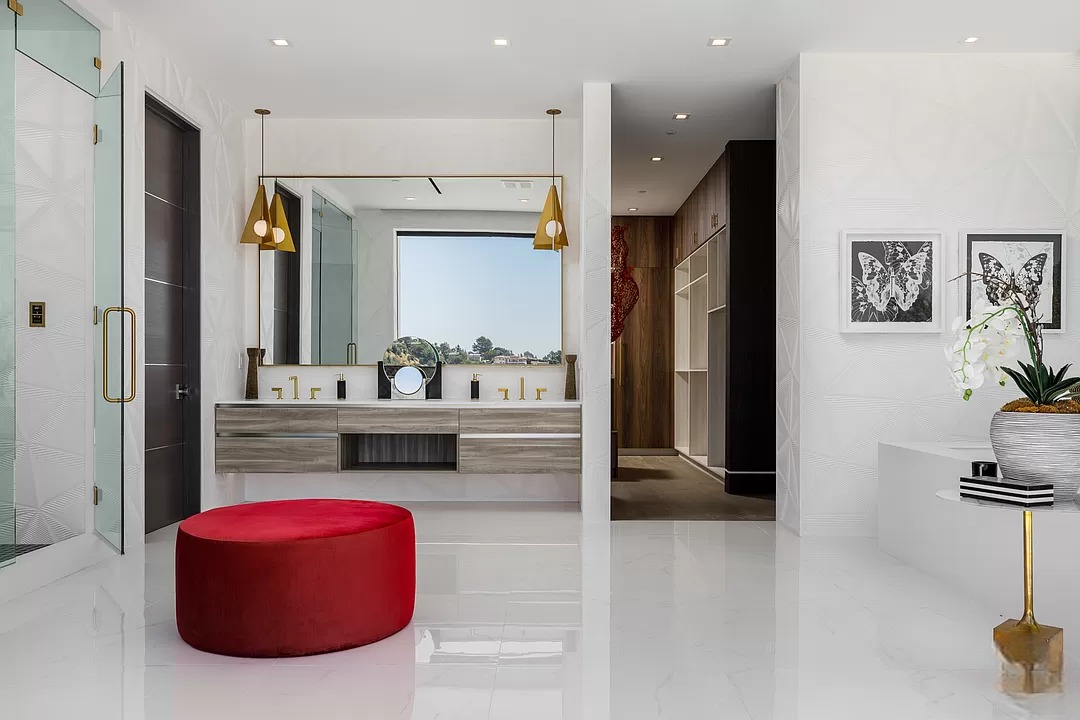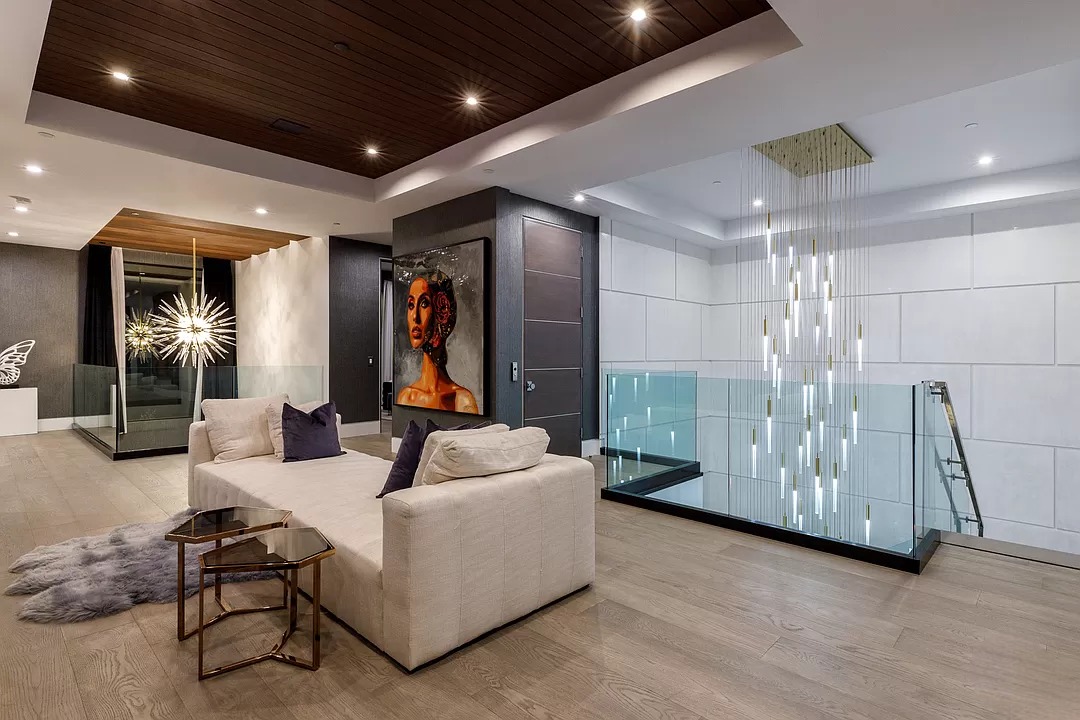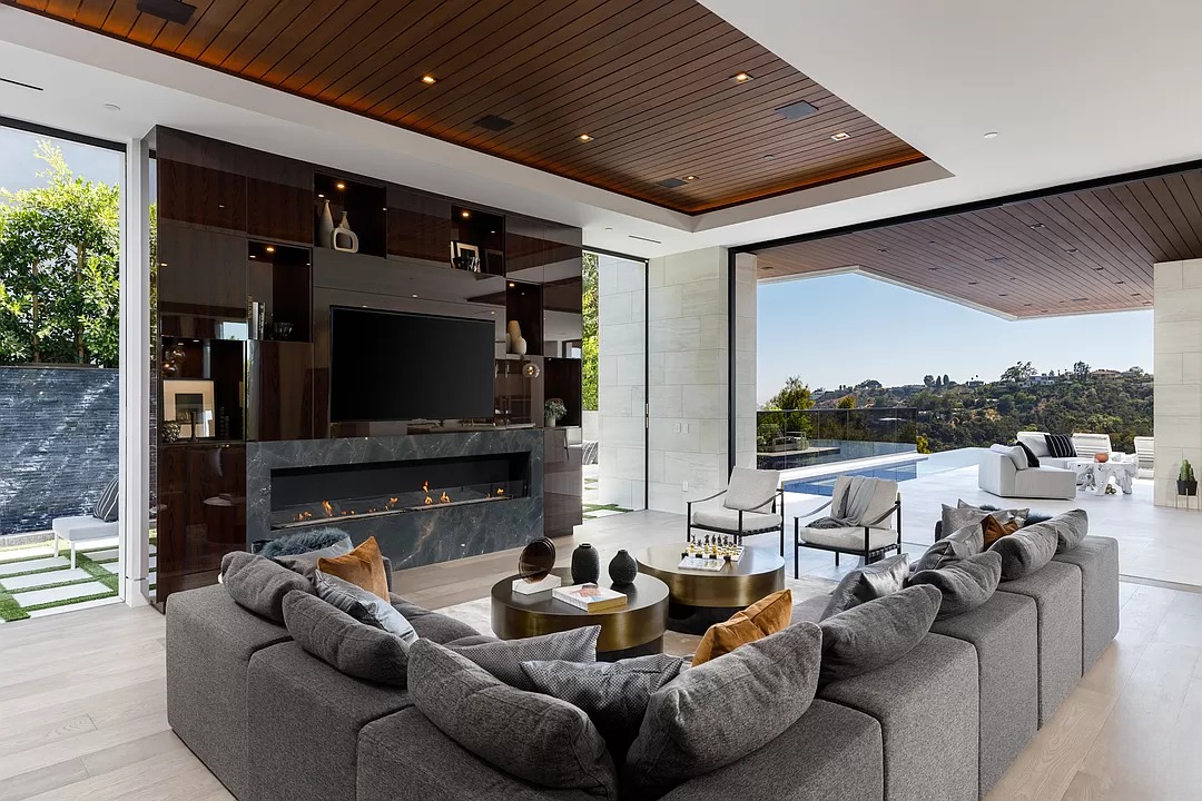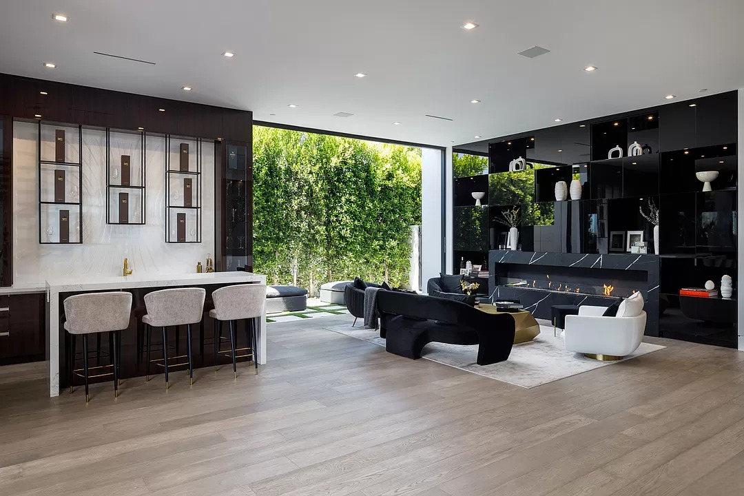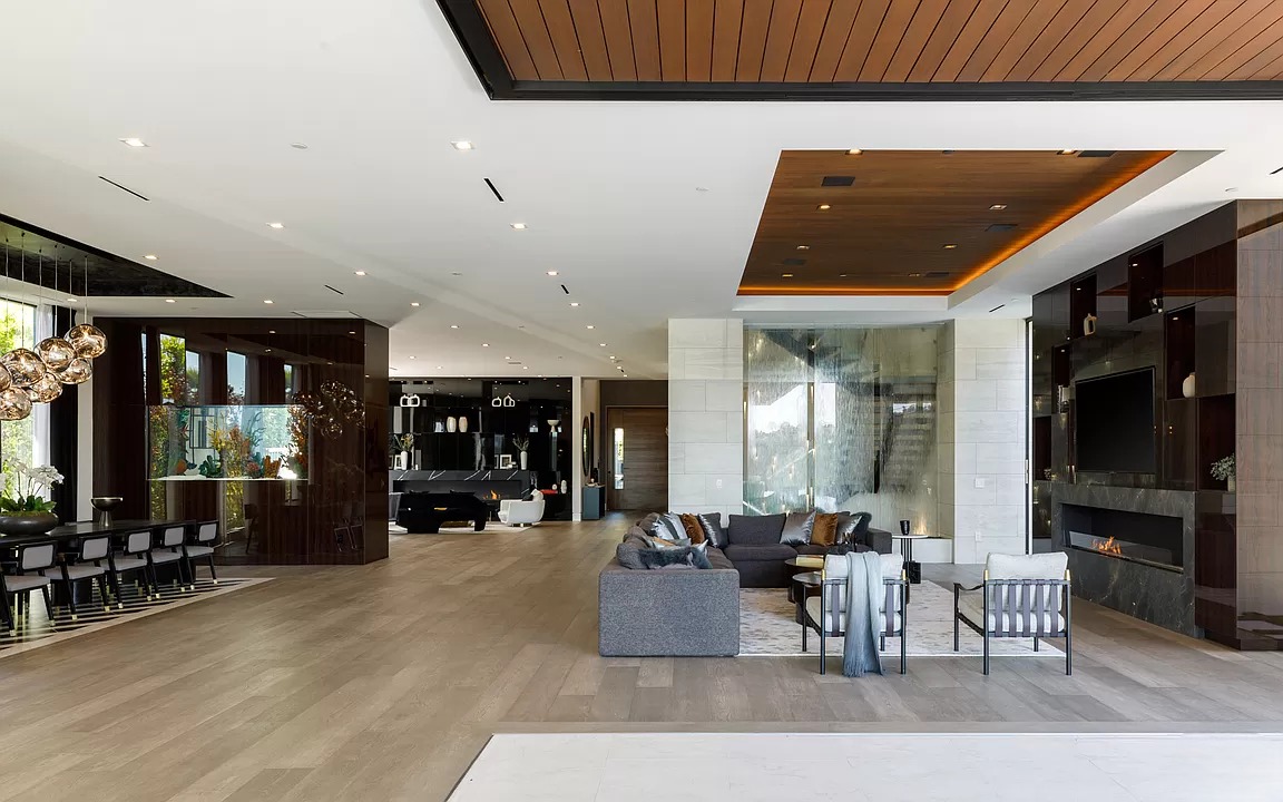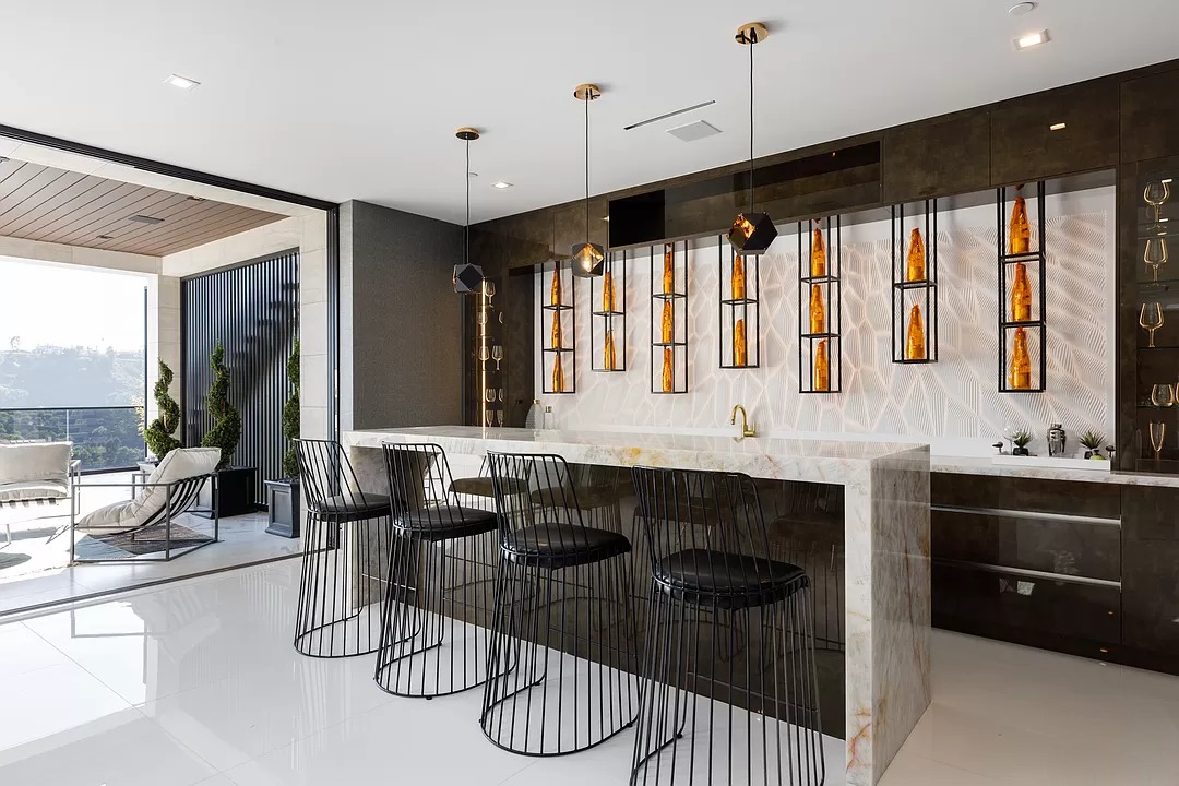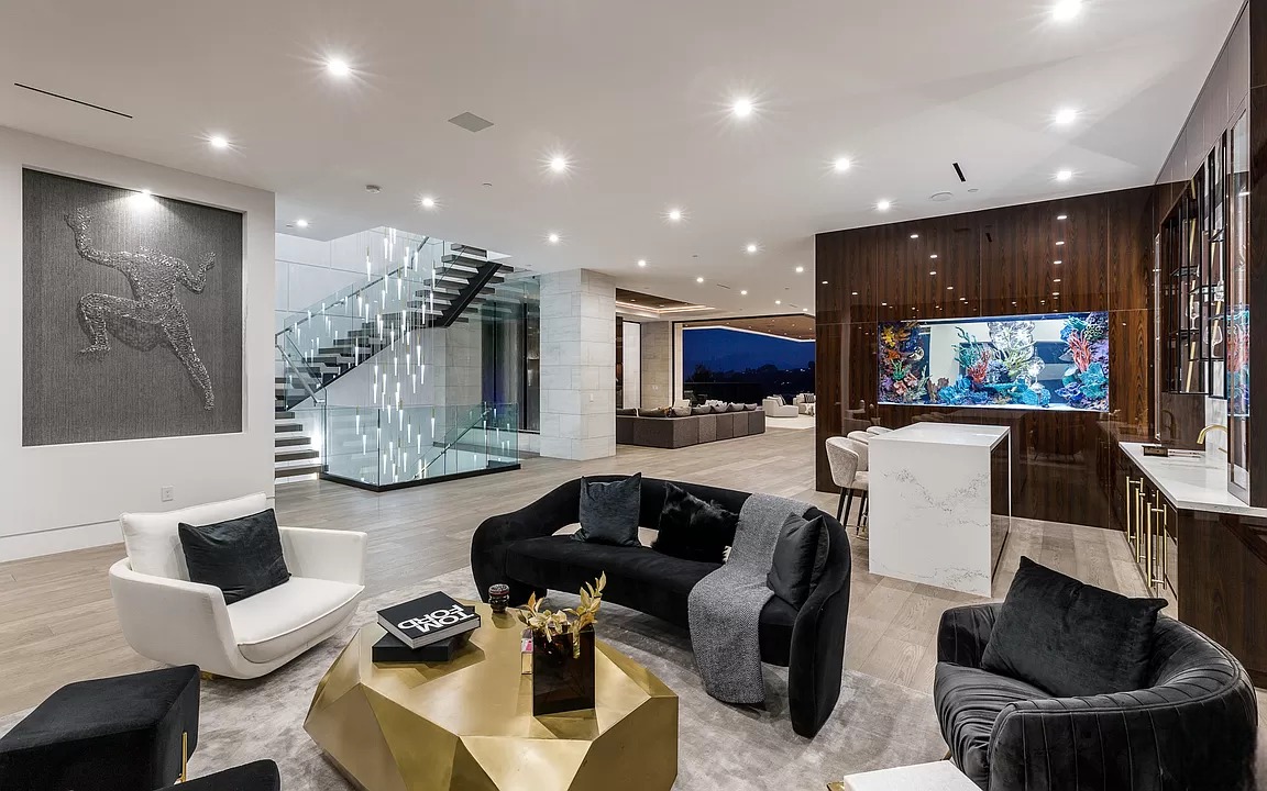 Breaking away from the starkness of traditional modernism, this Bel-Air masterpiece by renowned designer Ray Nosrati balances grand-scale sophistication with rich textures and warm, organic finishes. The experience begins at a striking front-entry infinity pool that leads into a light-drenched open floor plan, where bespoke flooring and opulent lighting frame sweeping views of the canyon and sea. The main level serves as a gallery of high-design features, anchored by a 30-foot soaring chandelier, a dual-sided tropical aquarium, and a custom indoor waterfall that complements the professional chef’s kitchen.