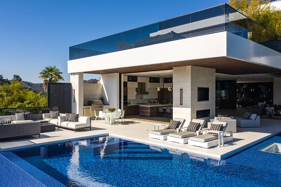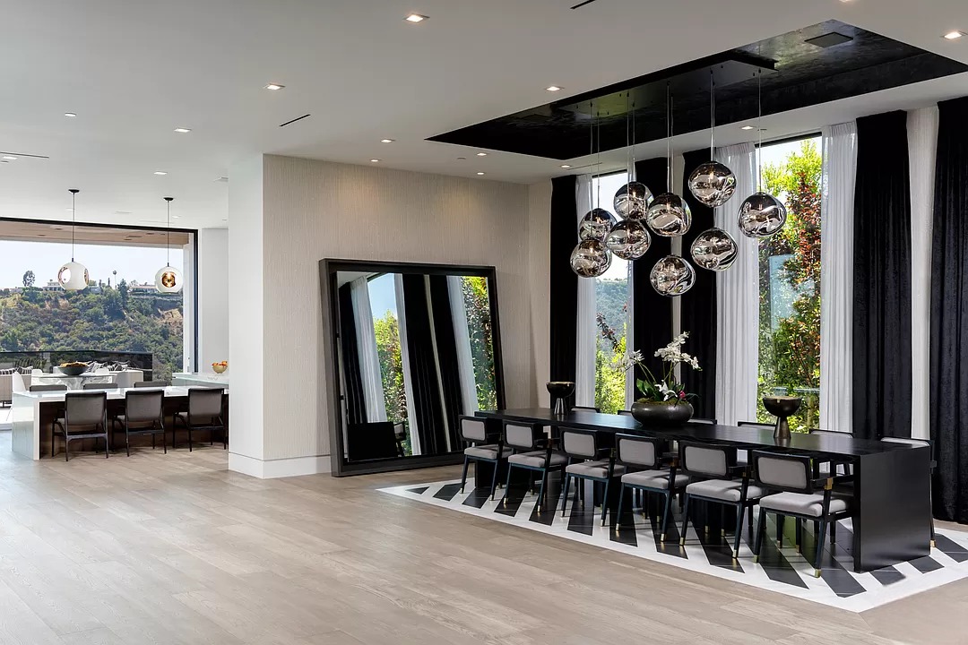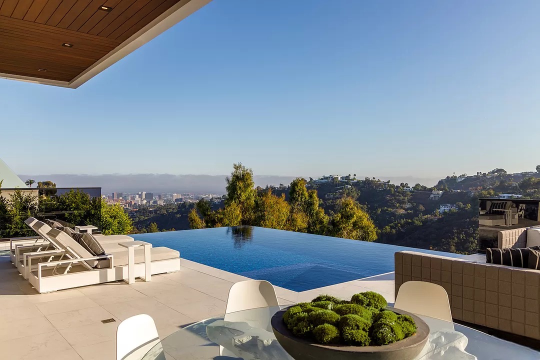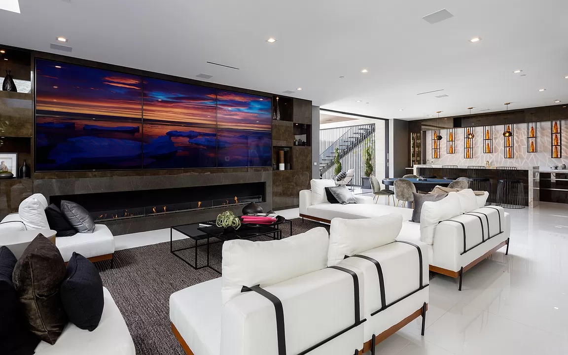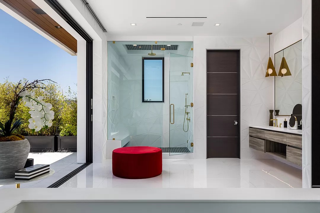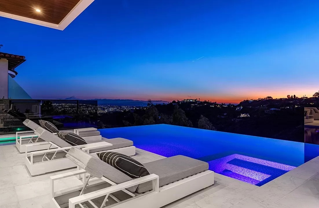 Breaking away from the starkness of traditional modernism, this Bel-Air masterpiece by renowned designer Ray Nosrati balances grand-scale sophistication with rich textures and warm, organic finishes. The experience begins at a striking front-entry infinity pool that leads into a light-drenched open floor plan, where bespoke flooring and opulent lighting frame sweeping views of the canyon and sea. The main level serves as a gallery of high-design features, anchored by a 30-foot soaring chandelier, a dual-sided tropical aquarium, and a custom indoor waterfall that complements the professional chef’s kitchen.