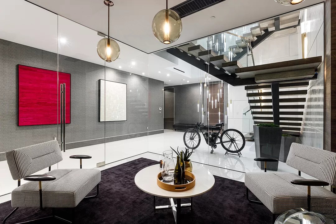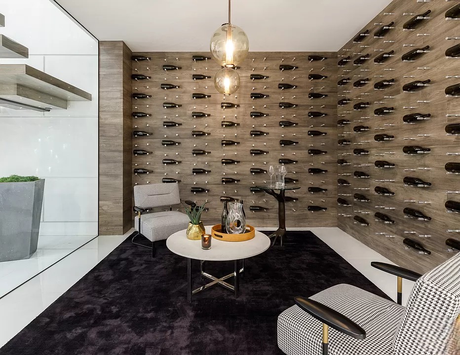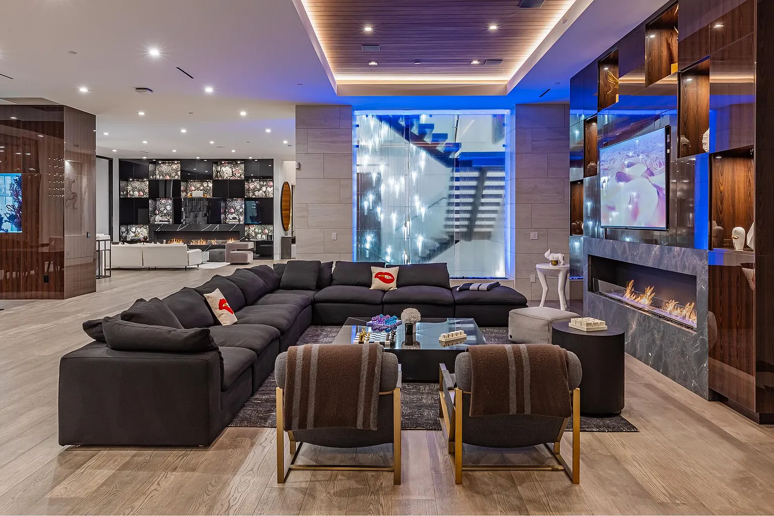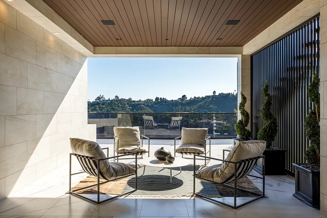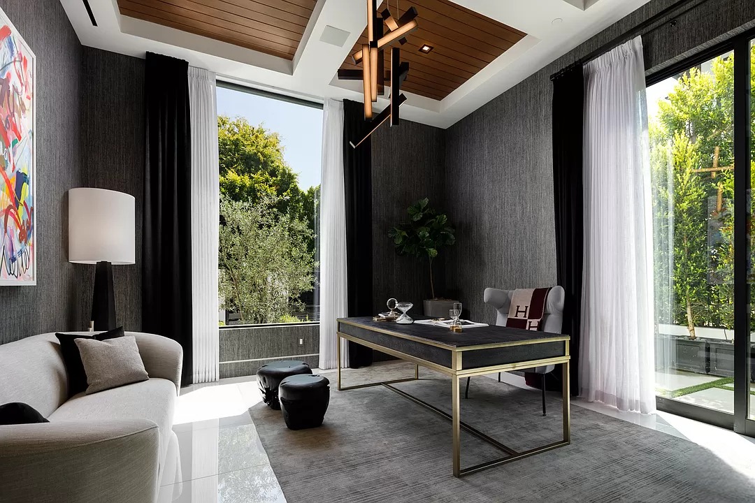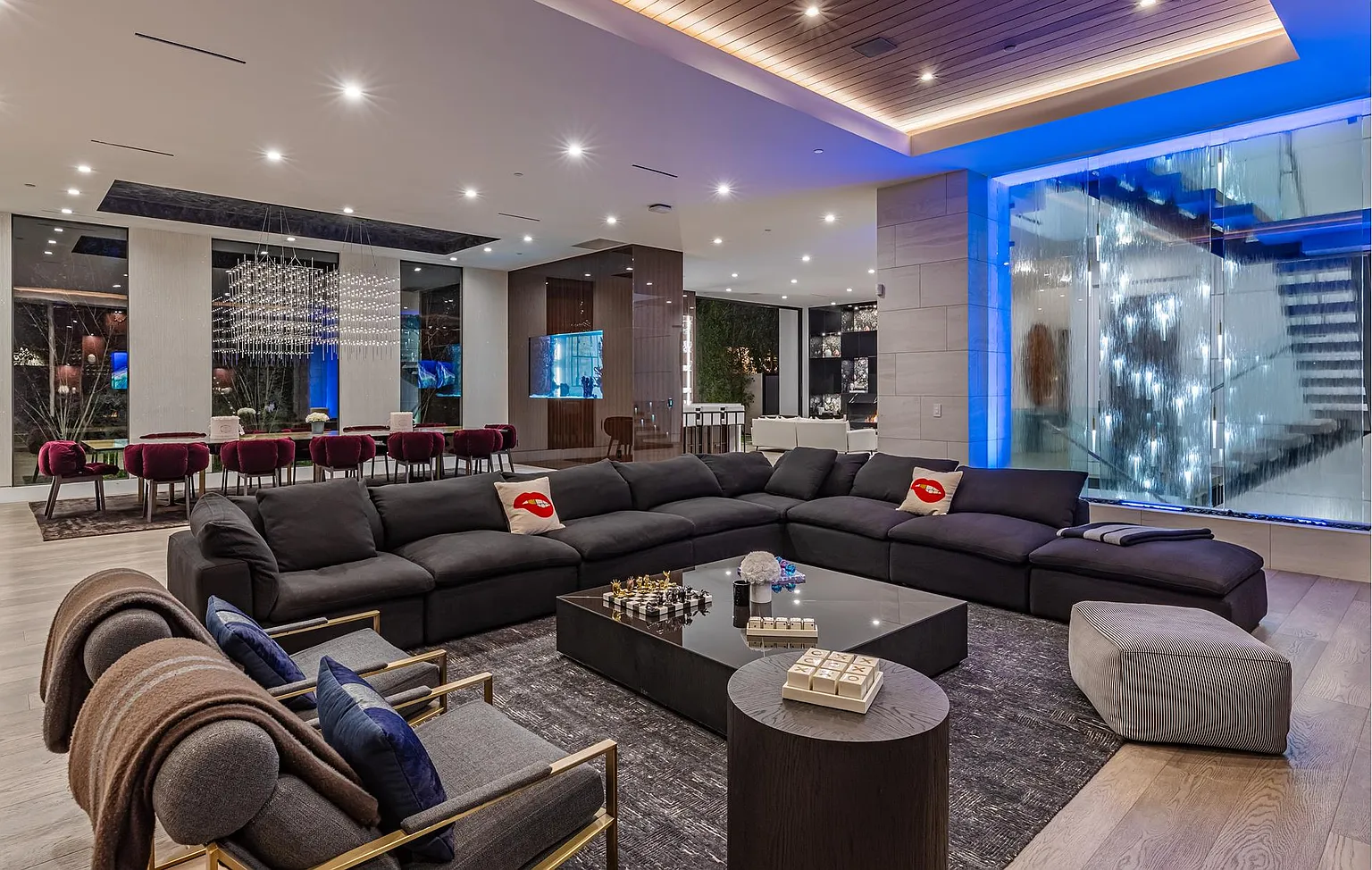 Breaking away from the starkness of traditional modernism, this Bel-Air masterpiece by renowned designer Ray Nosrati balances grand-scale sophistication with rich textures and warm, organic finishes. The experience begins at a striking front-entry infinity pool that leads into a light-drenched open floor plan, where bespoke flooring and opulent lighting frame sweeping views of the canyon and sea. The main level serves as a gallery of high-design features, anchored by a 30-foot soaring chandelier, a dual-sided tropical aquarium, and a custom indoor waterfall that complements the professional chef’s kitchen.