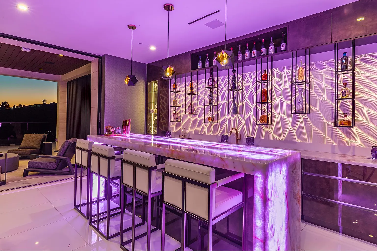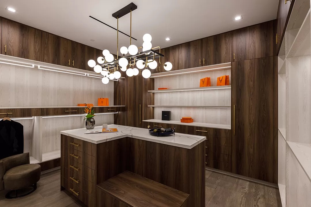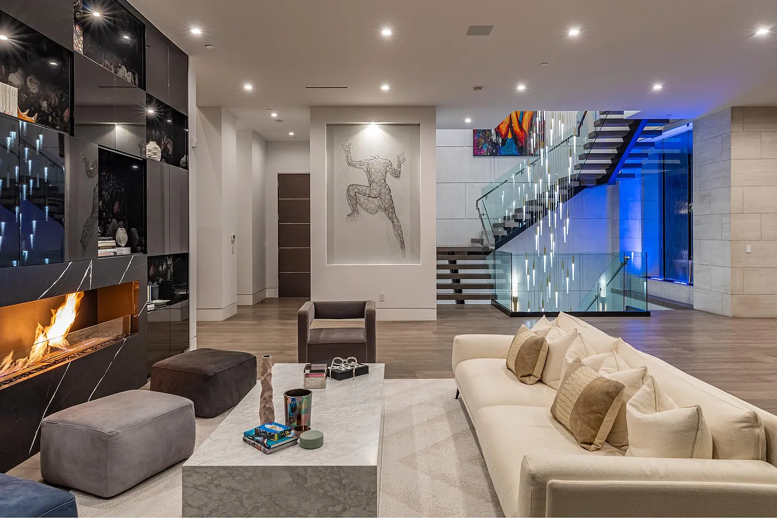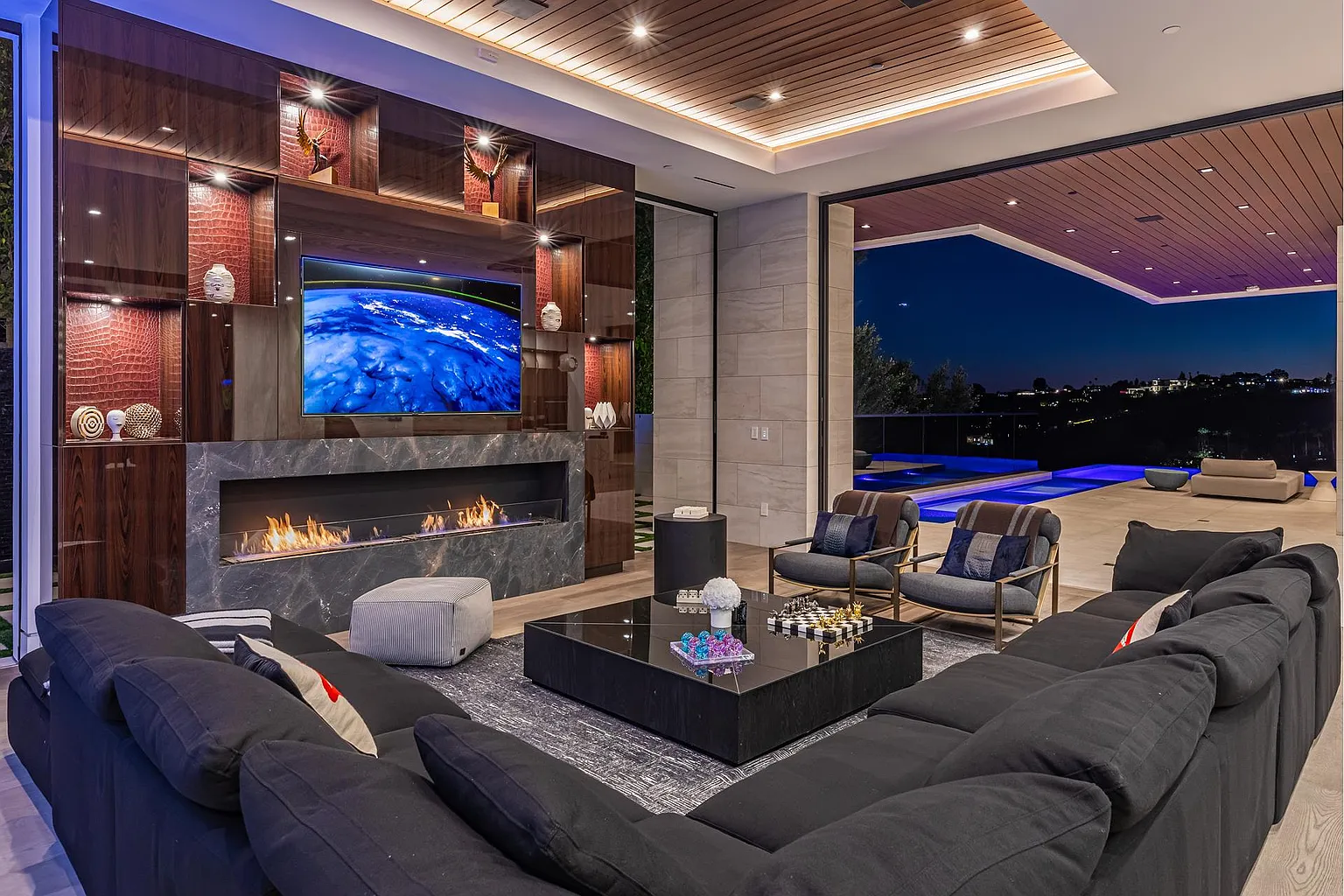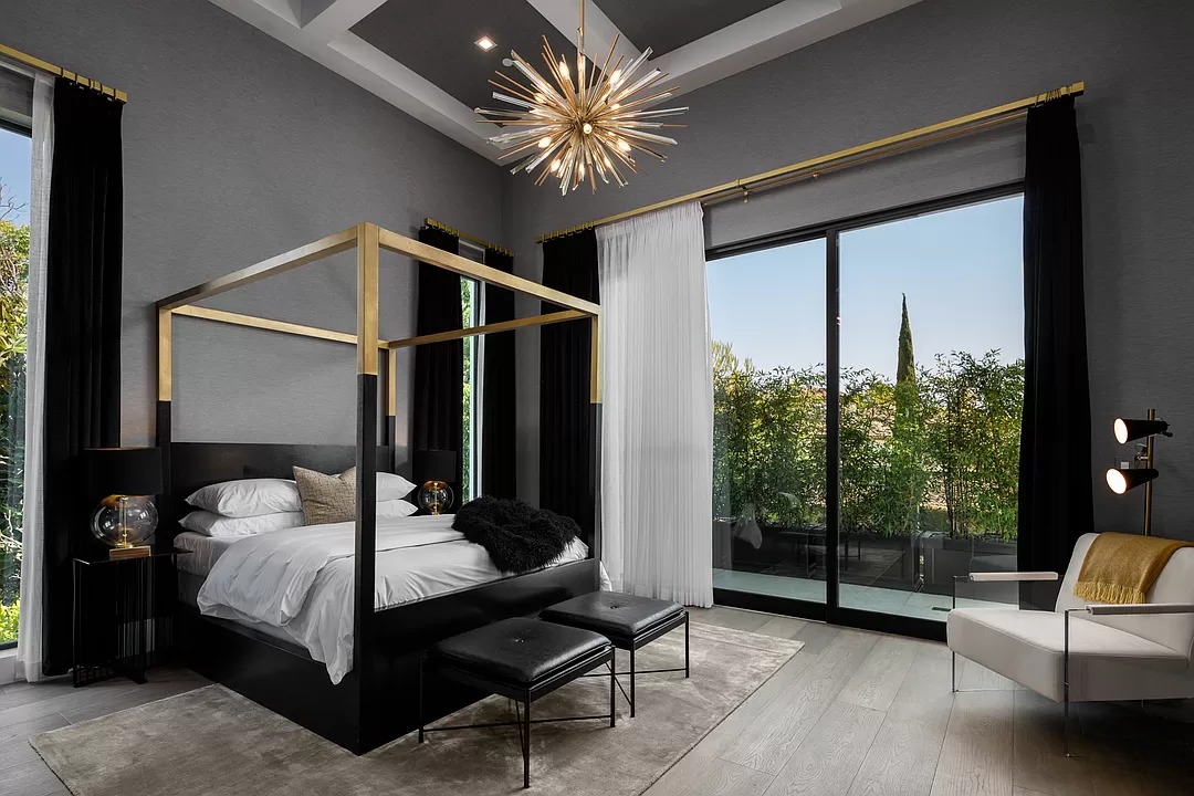 Breaking away from the starkness of traditional modernism, this Bel-Air masterpiece by renowned designer Ray Nosrati balances grand-scale sophistication with rich textures and warm, organic finishes. The experience begins at a striking front-entry infinity pool that leads into a light-drenched open floor plan, where bespoke flooring and opulent lighting frame sweeping views of the canyon and sea. The main level serves as a gallery of high-design features, anchored by a 30-foot soaring chandelier, a dual-sided tropical aquarium, and a custom indoor waterfall that complements the professional chef’s kitchen.