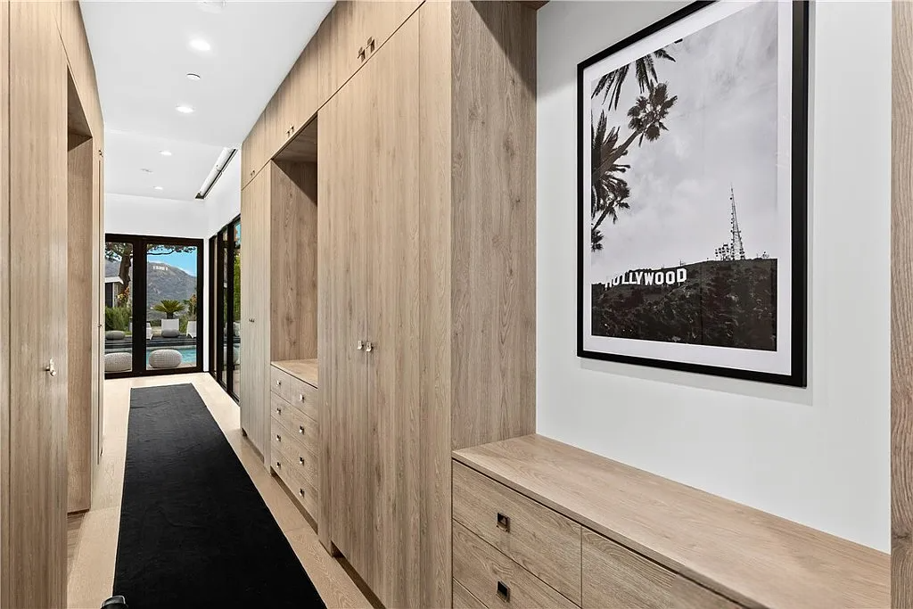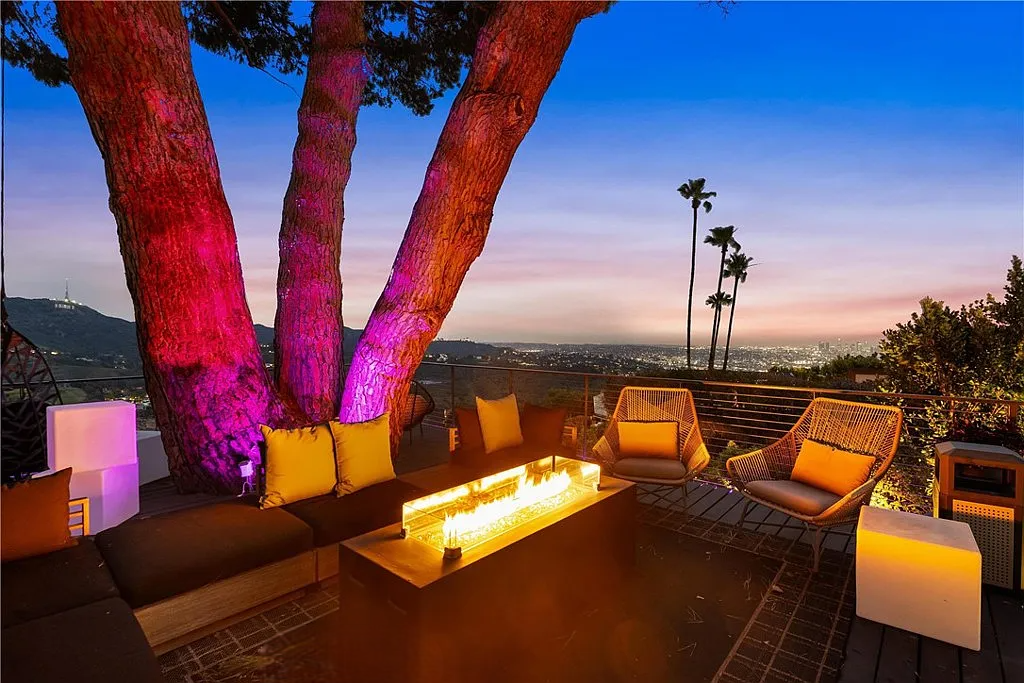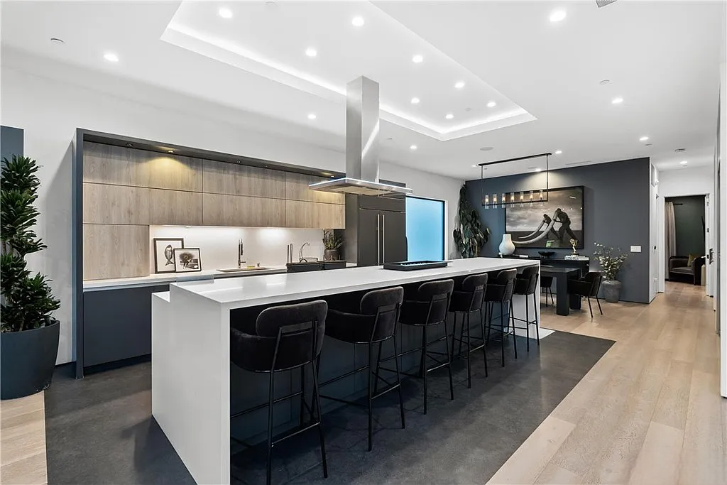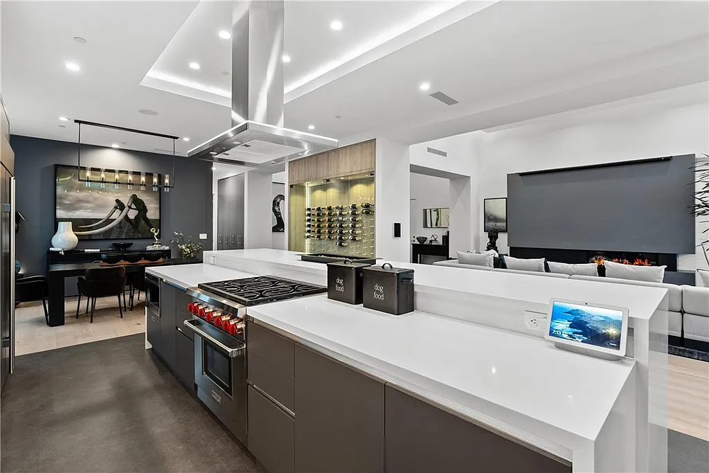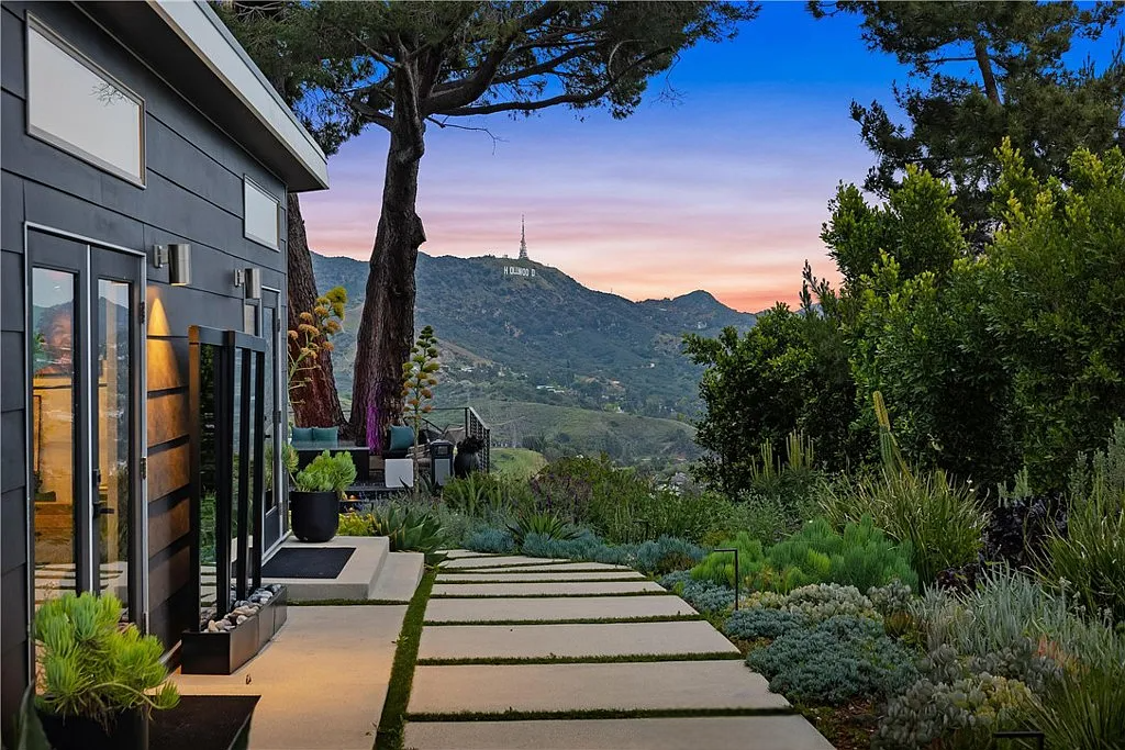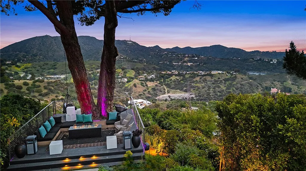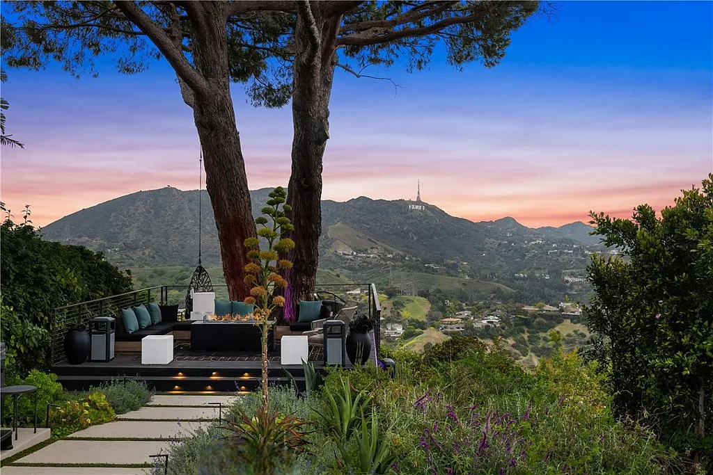 Perched in the coveted Hollywood Hills, this stunning contemporary 4-bedroom, 5-bathroom home offers breathtaking views of the Griffith Observatory, the iconic Hollywood Sign, and the San Fernando Valley. With approximately 3,449 square feet of living space on a spacious 19,164-square-foot lot, it perfectly blends generous interiors with privacy. The elegant single-story design showcases clean lines and a striking contrast of white stucco and dark accent walls. Inside, an open floor plan framed by soaring floor-to-ceiling glass walls fills every room with natural light and showcases the sweeping vistas. The living area is designed for entertaining, with ample space and sightlines that naturally draw attention to the spectacular view. The chef’s kitchen features modern cabinetry, top-tier appliances, and a large island with bar seating that flows effortlessly into the living spaces, all unified by a sophisticated neutral color scheme.