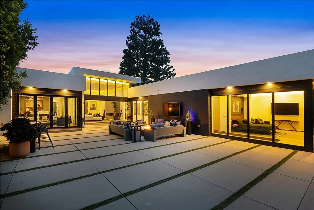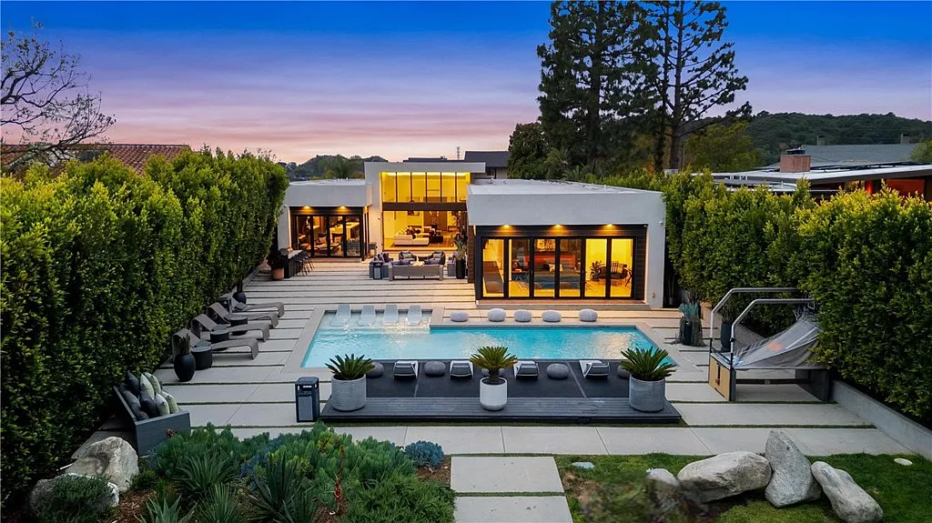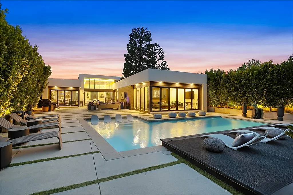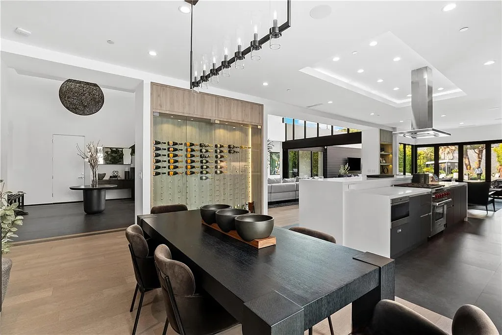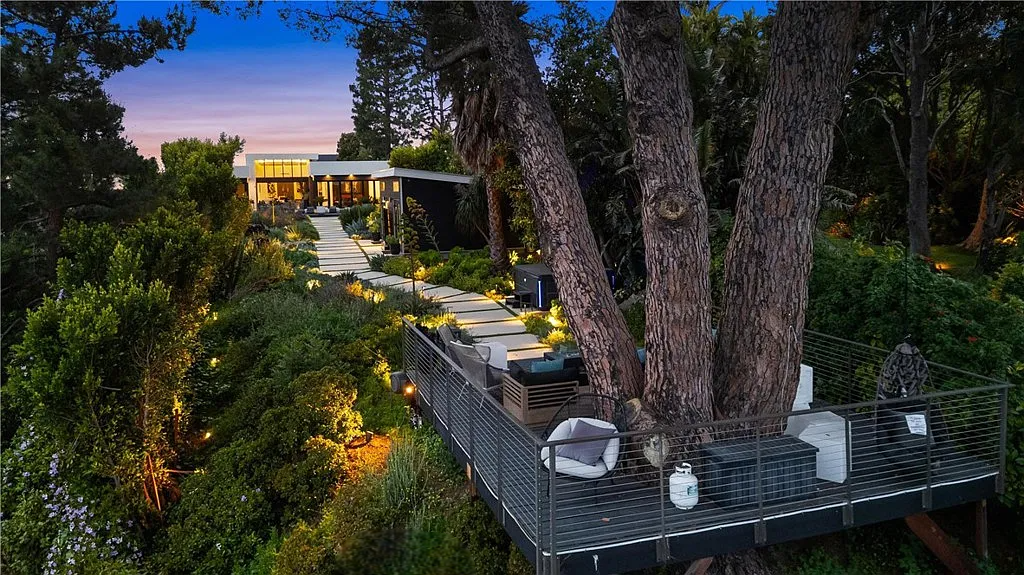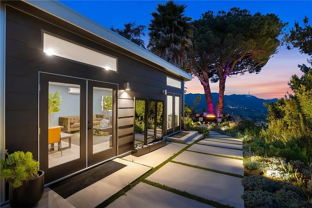 Perched in the coveted Hollywood Hills, this stunning contemporary 4-bedroom, 5-bathroom home offers breathtaking views of the Griffith Observatory, the iconic Hollywood Sign, and the San Fernando Valley. With approximately 3,449 square feet of living space on a spacious 19,164-square-foot lot, it perfectly blends generous interiors with privacy. The elegant single-story design showcases clean lines and a striking contrast of white stucco and dark accent walls. Inside, an open floor plan framed by soaring floor-to-ceiling glass walls fills every room with natural light and showcases the sweeping vistas. The living area is designed for entertaining, with ample space and sightlines that naturally draw attention to the spectacular view. The chef’s kitchen features modern cabinetry, top-tier appliances, and a large island with bar seating that flows effortlessly into the living spaces, all unified by a sophisticated neutral color scheme.