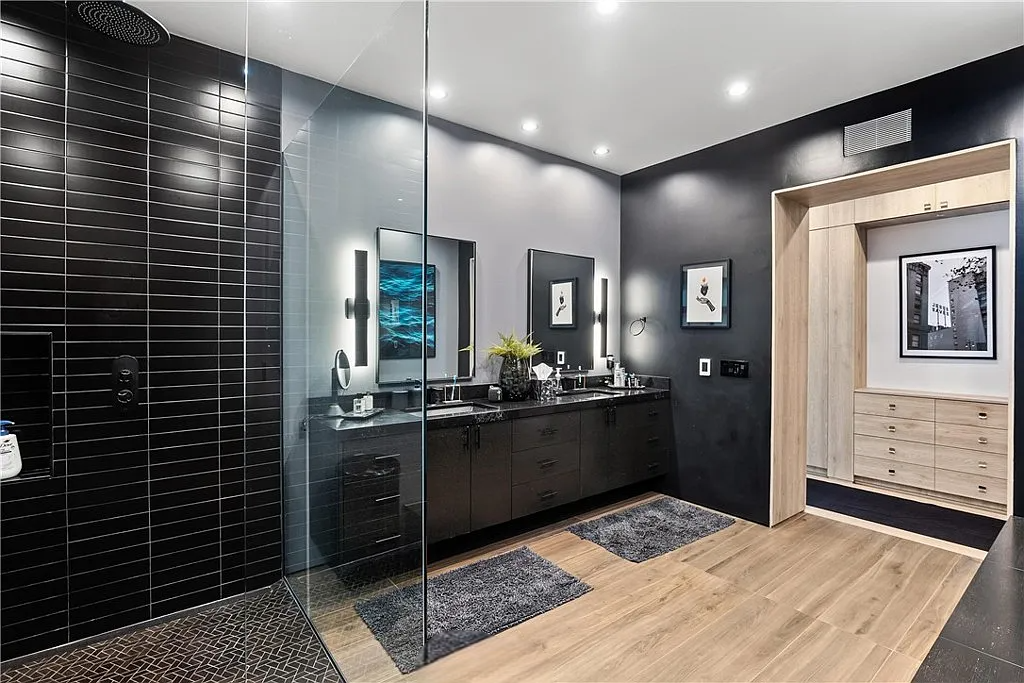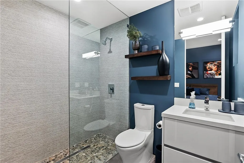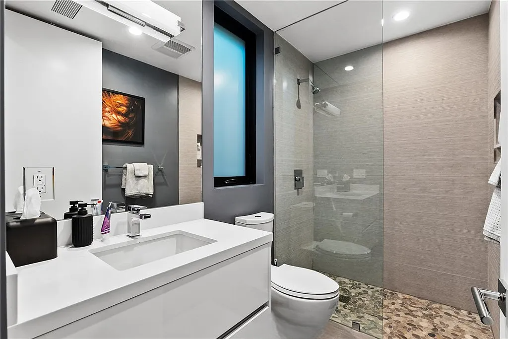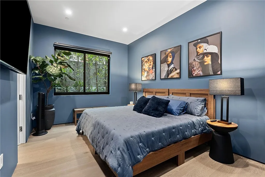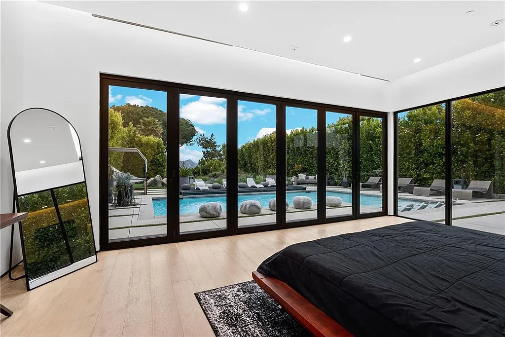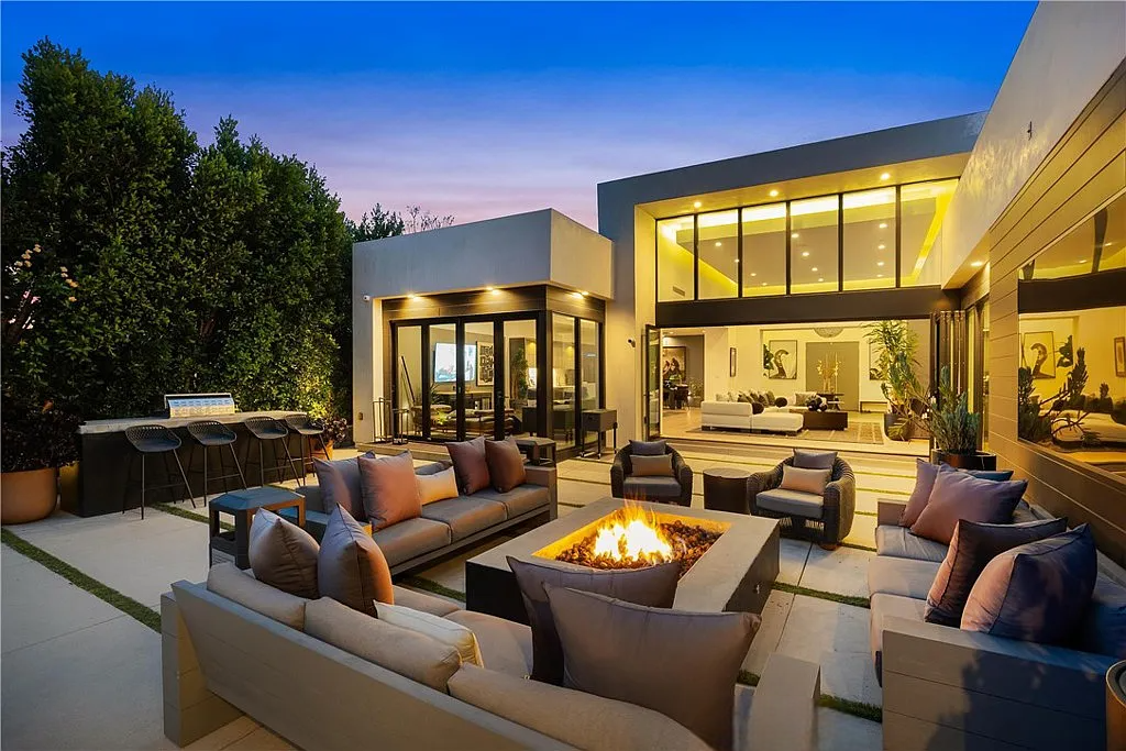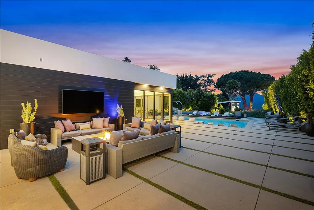 Perched in the coveted Hollywood Hills, this stunning contemporary 4-bedroom, 5-bathroom home offers breathtaking views of the Griffith Observatory, the iconic Hollywood Sign, and the San Fernando Valley. With approximately 3,449 square feet of living space on a spacious 19,164-square-foot lot, it perfectly blends generous interiors with privacy. The elegant single-story design showcases clean lines and a striking contrast of white stucco and dark accent walls. Inside, an open floor plan framed by soaring floor-to-ceiling glass walls fills every room with natural light and showcases the sweeping vistas. The living area is designed for entertaining, with ample space and sightlines that naturally draw attention to the spectacular view. The chef’s kitchen features modern cabinetry, top-tier appliances, and a large island with bar seating that flows effortlessly into the living spaces, all unified by a sophisticated neutral color scheme.