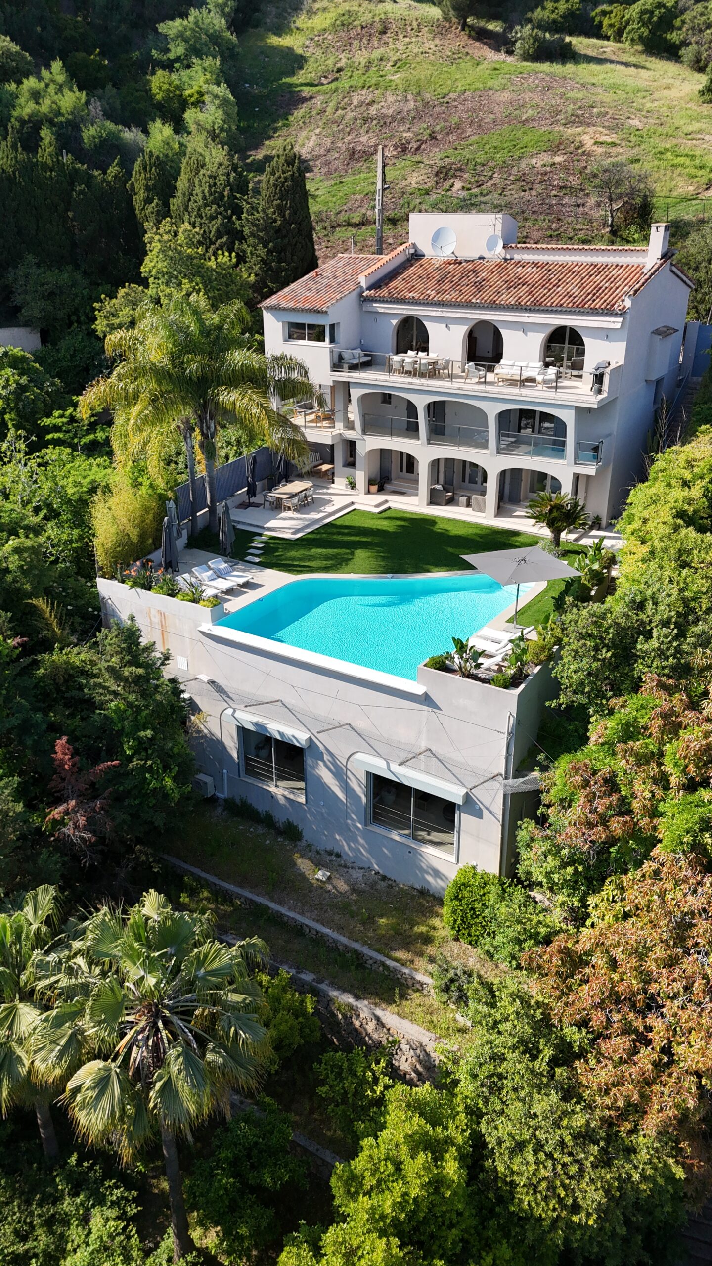 Inside, the villa features generous living spaces in impeccable condition, including a large reception area that opens seamlessly onto the garden and pool. It also includes five en-suite bedrooms, highlighted by a spacious master suite. Outdoors, the estate is complemented by a lush wooded area, an inviting infinity pool, a fully equipped gym, and two spacious garages.