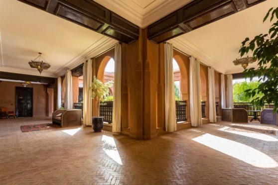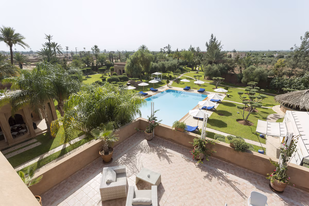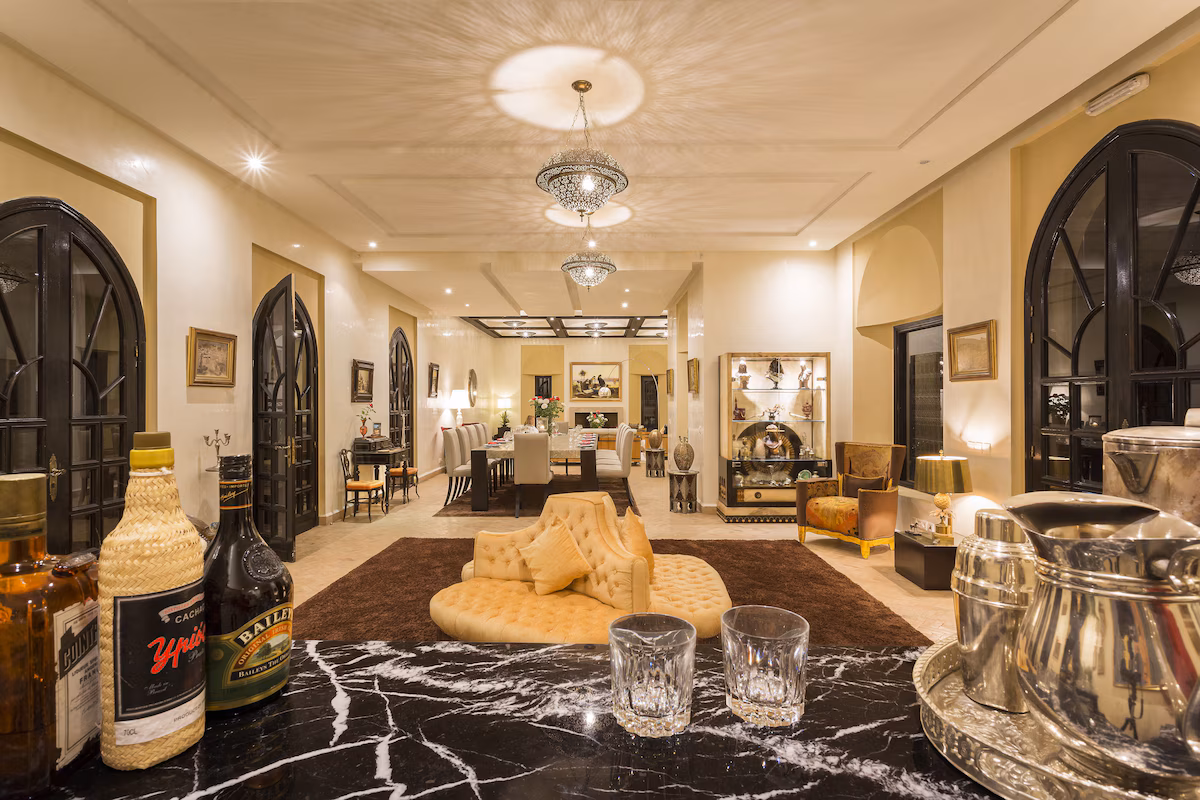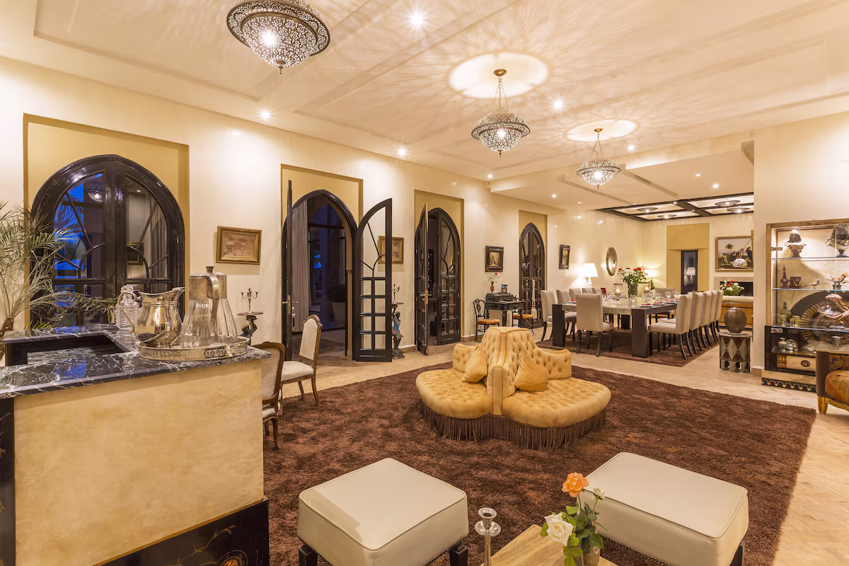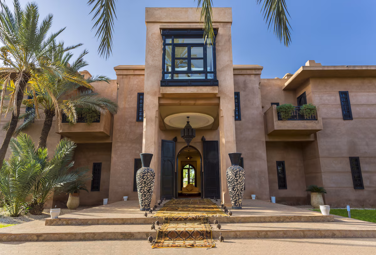 Nestled 17 km east of Marrakech along the road to Fez, the prestigious Palace Noor is set within the enchanting palm grove of Marrakech. Spanning an impressive 1.6 hectares, this property boasts lush greenery that will captivate you with its stunning architecture and beautifully landscaped gardens. Featuring over 80 olive trees, a vibrant rose garden, and more than 100 palm trees, the villa creates a breathtaking contrast against the clear blue sky and the majestic snowy peaks of the Atlas Mountains.