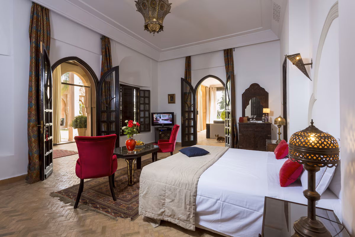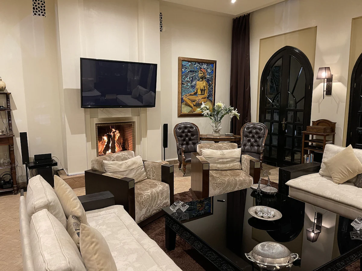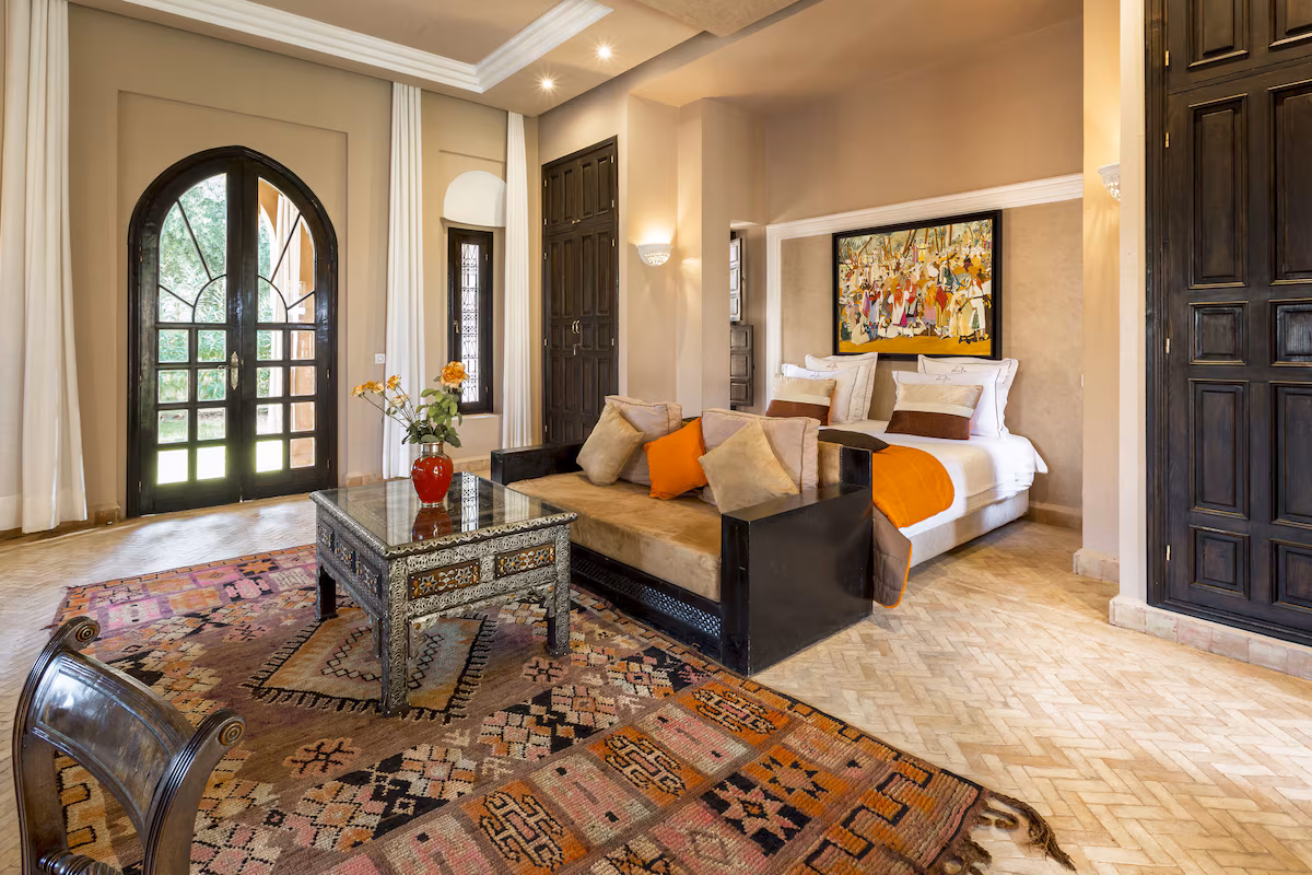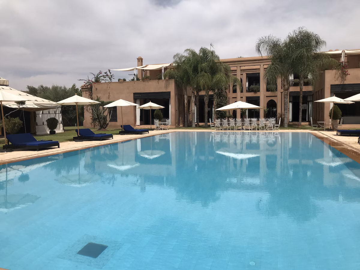 Nestled 17 km east of Marrakech along the road to Fez, the prestigious Palace Noor is set within the enchanting palm grove of Marrakech. Spanning an impressive 1.6 hectares, this property boasts lush greenery that will captivate you with its stunning architecture and beautifully landscaped gardens. Featuring over 80 olive trees, a vibrant rose garden, and more than 100 palm trees, the villa creates a breathtaking contrast against the clear blue sky and the majestic snowy peaks of the Atlas Mountains.
