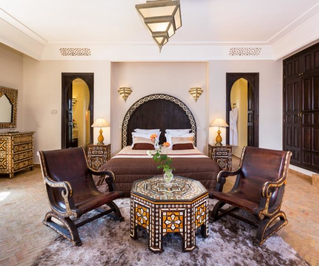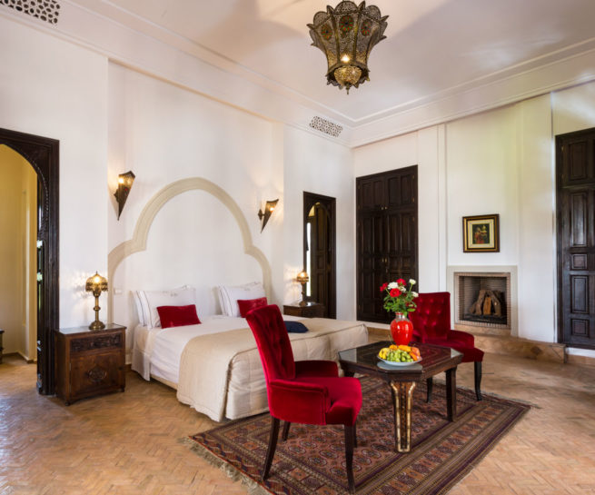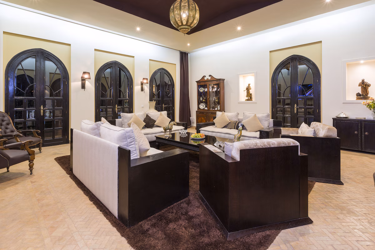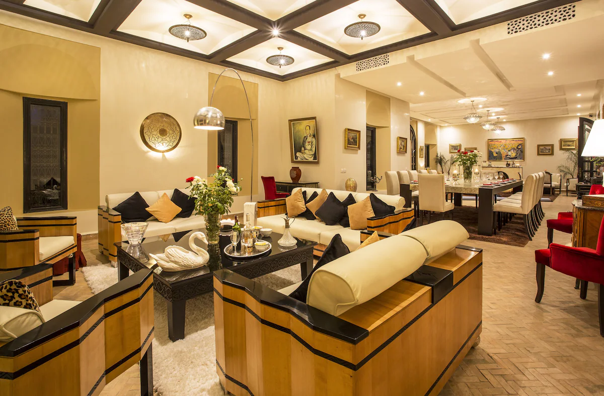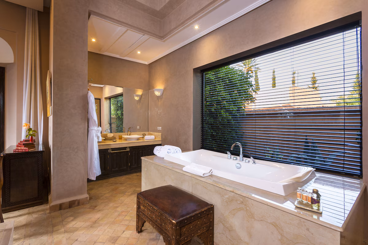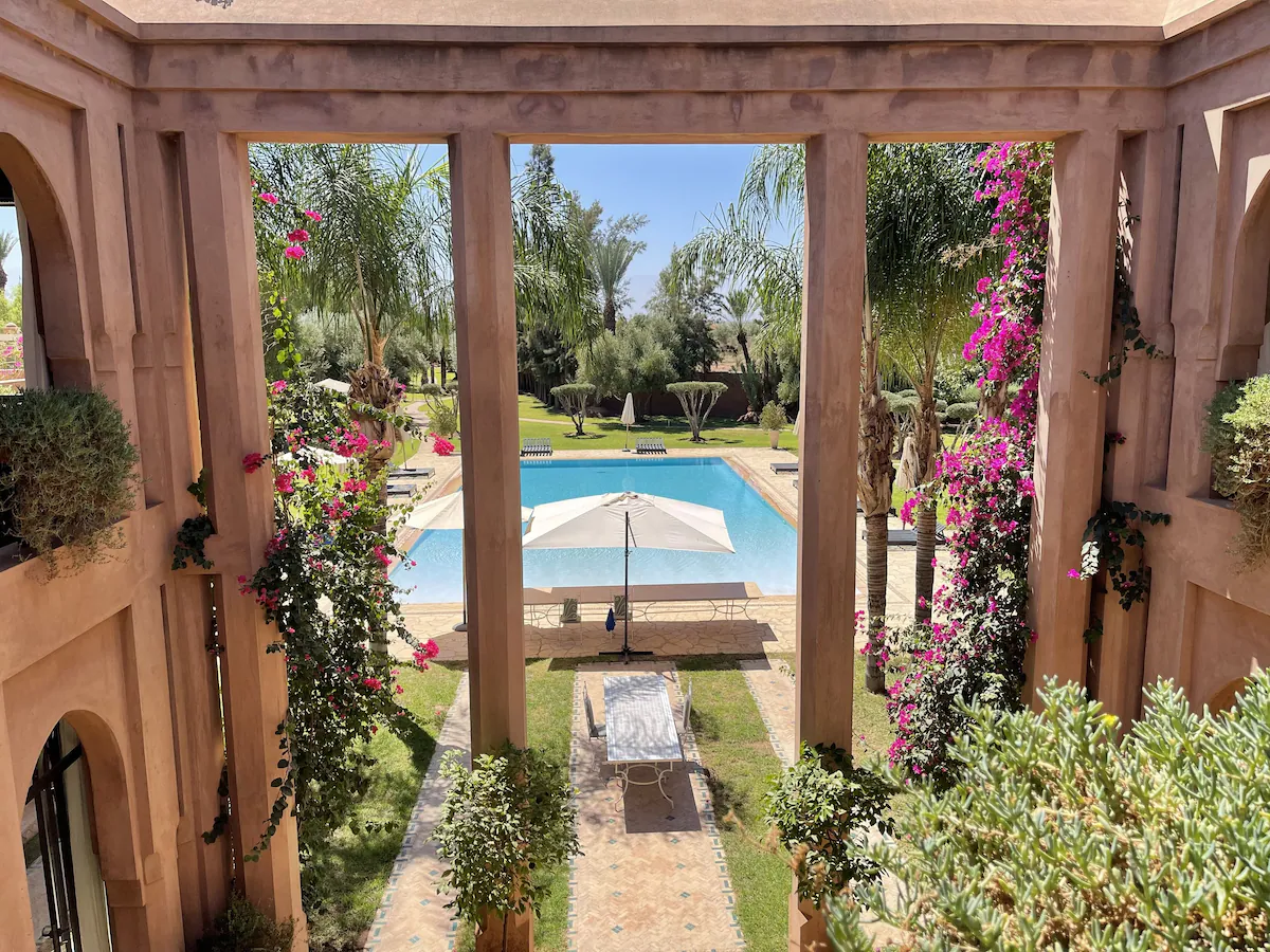 Nestled 17 km east of Marrakech along the road to Fez, the prestigious Palace Noor is set within the enchanting palm grove of Marrakech. Spanning an impressive 1.6 hectares, this property boasts lush greenery that will captivate you with its stunning architecture and beautifully landscaped gardens. Featuring over 80 olive trees, a vibrant rose garden, and more than 100 palm trees, the villa creates a breathtaking contrast against the clear blue sky and the majestic snowy peaks of the Atlas Mountains.